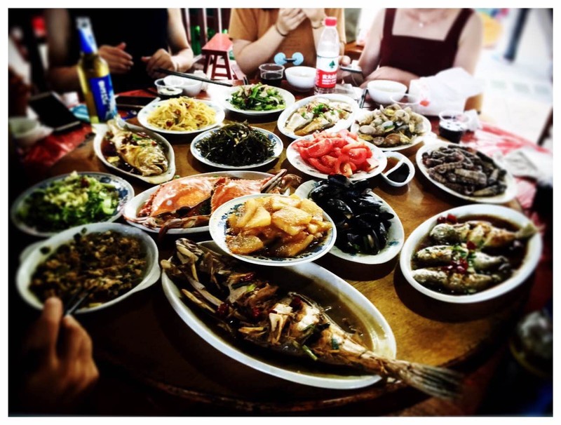 玩着玩着,到了晚餐时间,农家老板已经准备了满满的一桌海鲜,等待大家品尝,吃完饭