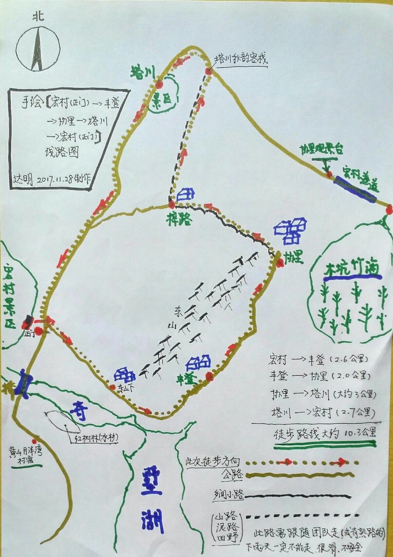 8:00左右上车出发,直奔目的地黄山市黟县宏村,大约10:00左右到达,我们住进了安排的客栈,休息了一会儿,吃了午餐后开始了徒步的计划:从住地出发,穿过宏村景区,沿着102乡道→丰登→协里→梓路→塔川→回宏村。晚餐后进宏村景区