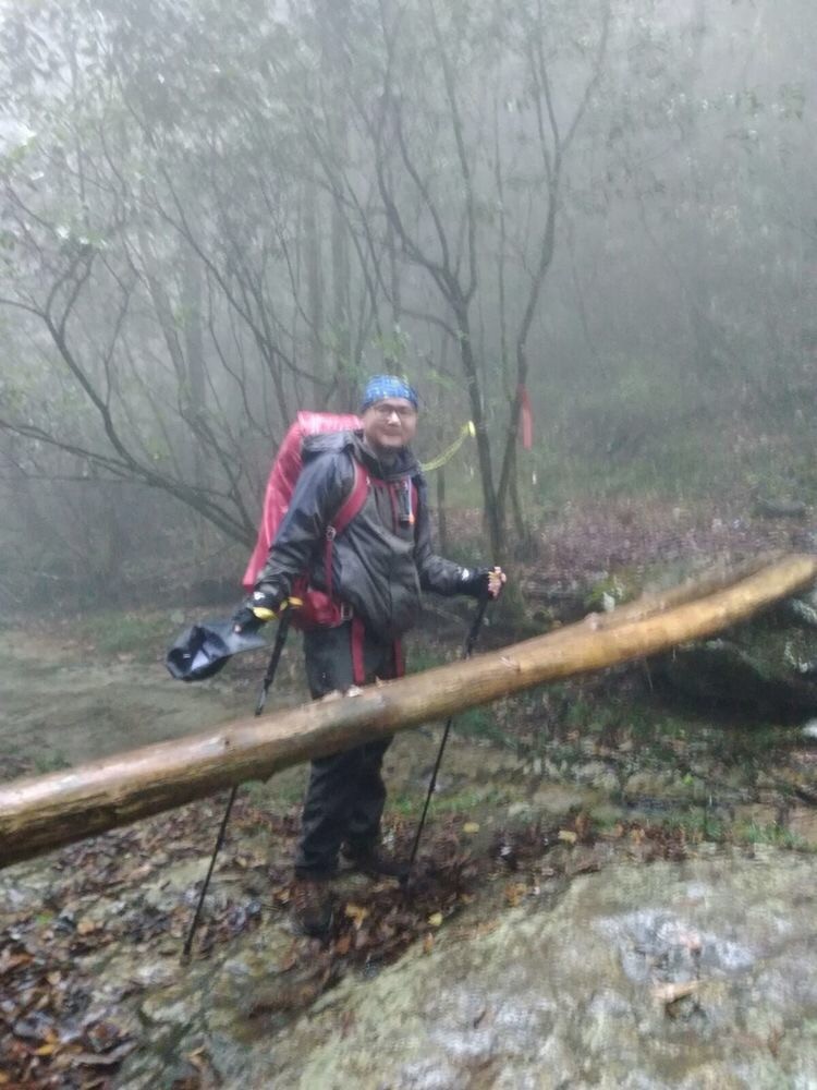 不听使唤的心肺让脚步阑珊,与队友渐行渐远,而这条小小的沟叉又把我身体翻船,手台关机听不到前面队友善意的召唤,去挑战这两根湿滑滑的木棍,最终变成了四脚朝天的蛤蟆。水不多却足以浸透衣裳,蒙蒙的细雨加上温热的汗,能找到干燥的地方就是那两只袜子了。走在边上临队的驴友提醒我留下了这张永恒的记忆。摸摸pp揉揉手,挤出一丝微笑再出发。