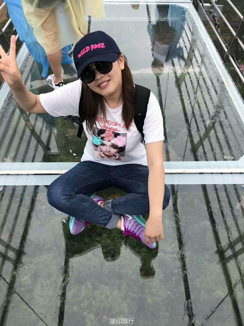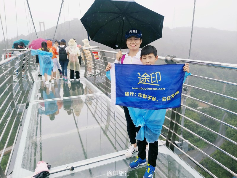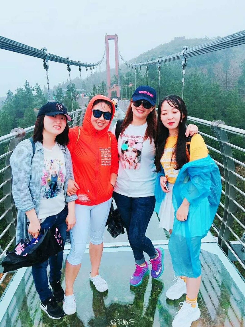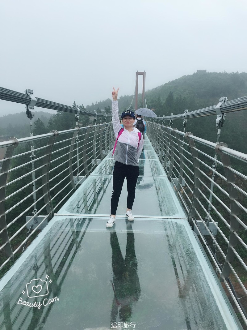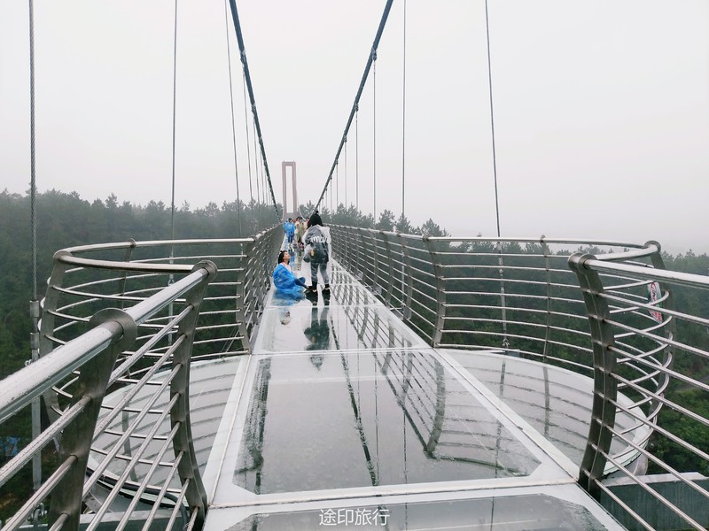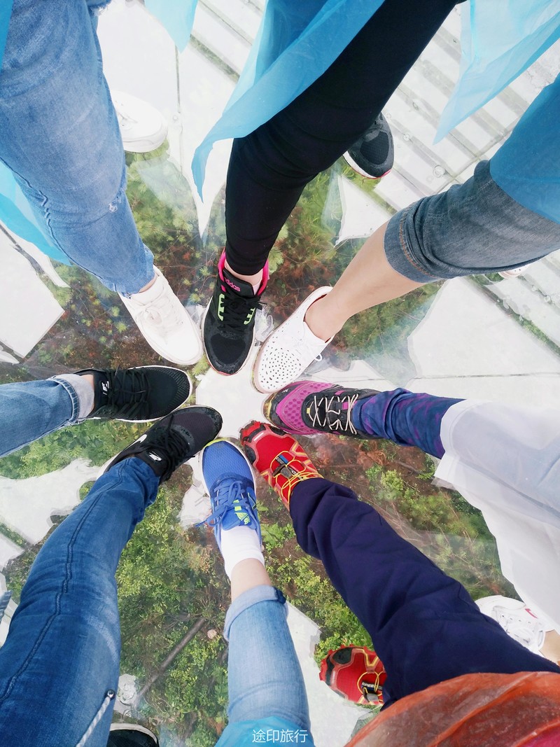 可能是因为下雨的缘故,玻璃桥面上有水雾,所以看下方看得不是特别真切,没有预期想象地那么吓人,原先在车上自我介绍说有一些恐高的小伙伴们也是嘻嘻闹闹就走了过来。不过站在高处看下方的风景还是很棒的。