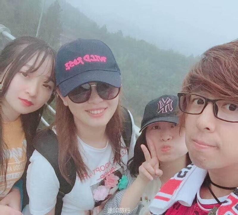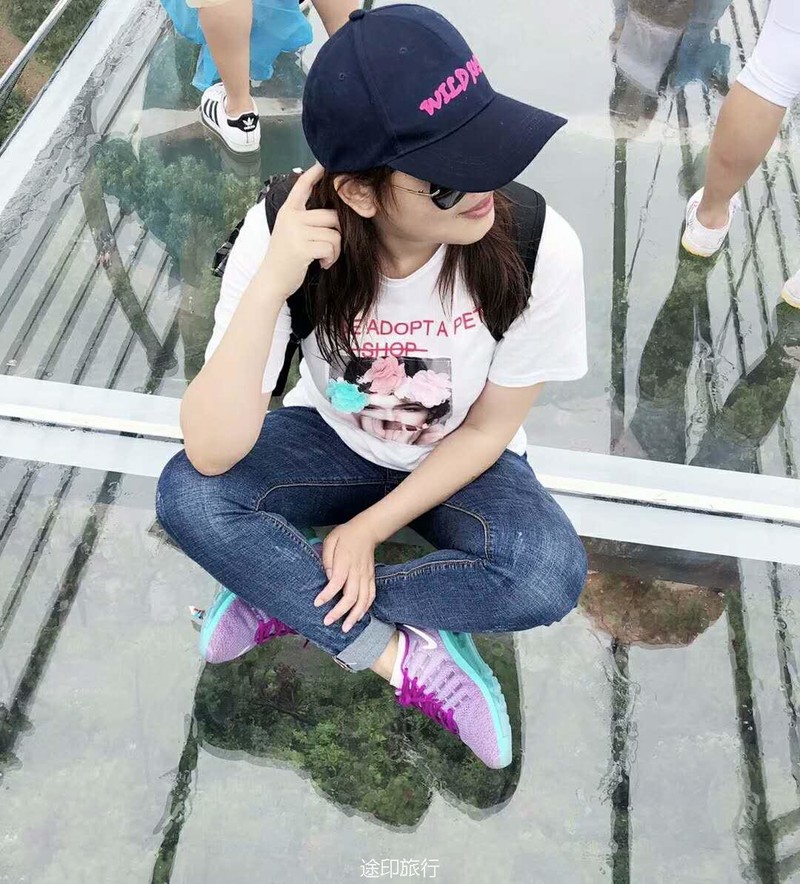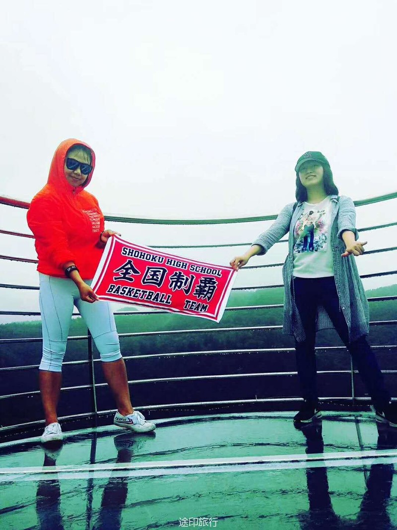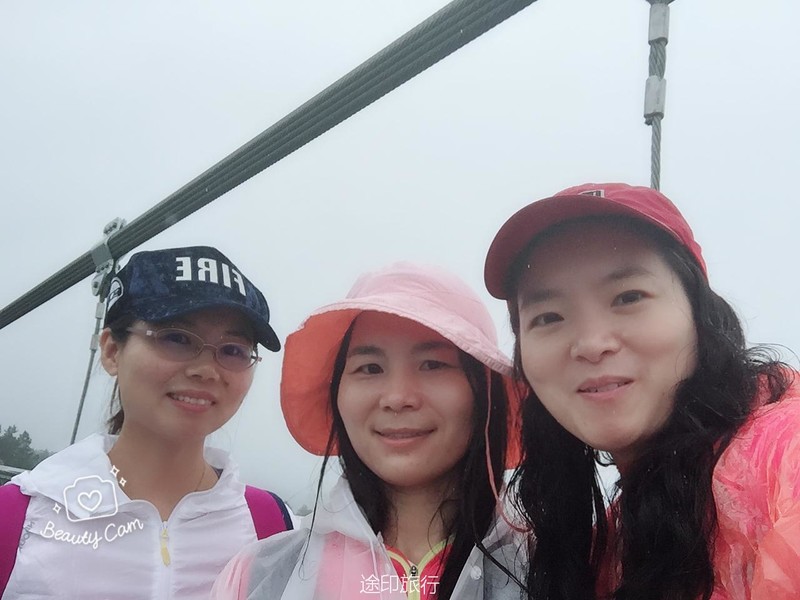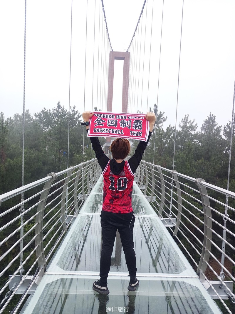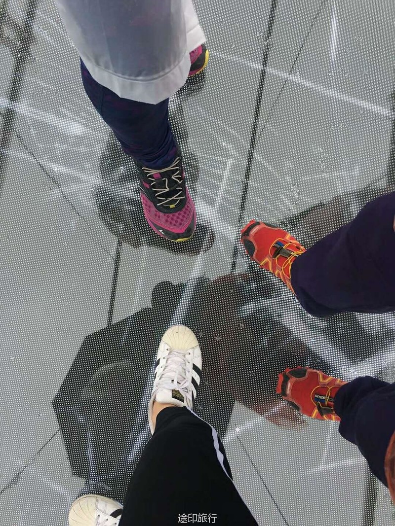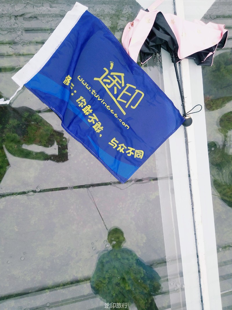 可能是因为下雨的缘故,玻璃桥面上有水雾,所以看下方看得不是特别真切,没有预期想象地那么吓人,原先在车上自我介绍说有一些恐高的小伙伴们也是嘻嘻闹闹就走了过来。不过站在高处看下方的风景还是很棒的。