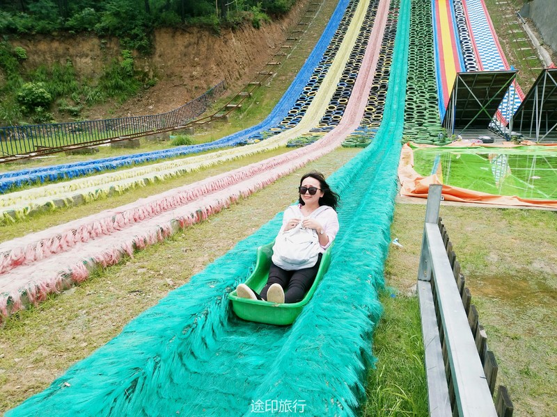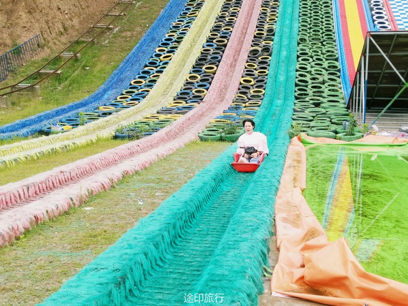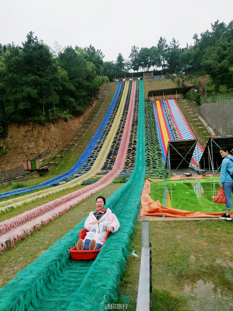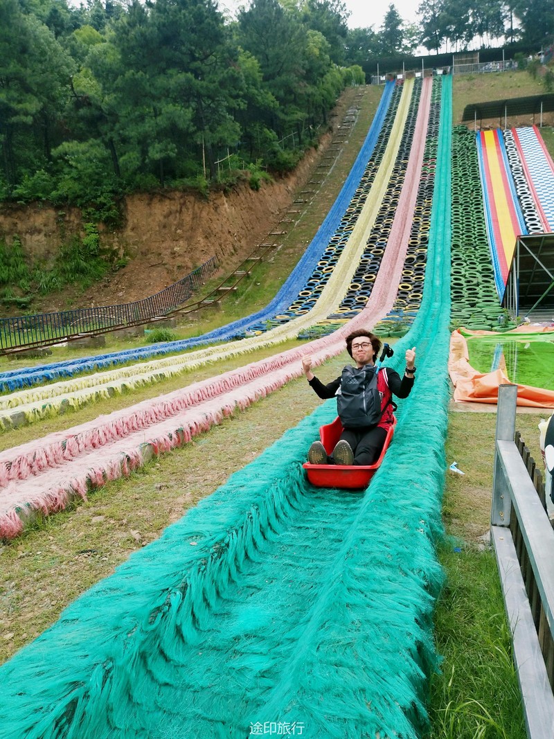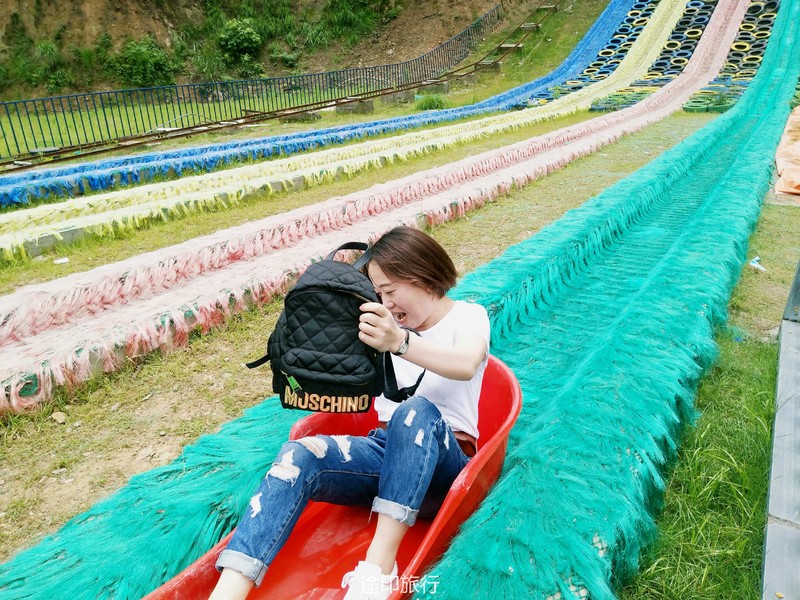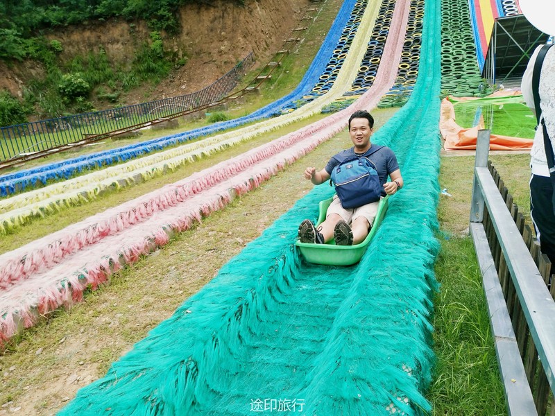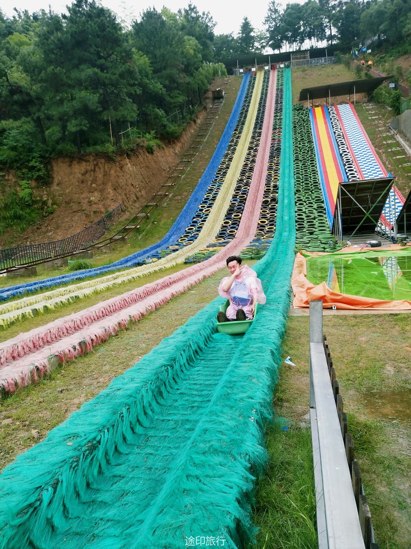 从吊桥的尾端走出来往下走一点,就是下一站:桃坡滑草场,落差很高,不同颜色的滑道阻力不太相同,其中蓝色道看起来最为刺激,阻力最小,能一路冲到最前面的沙堆里。