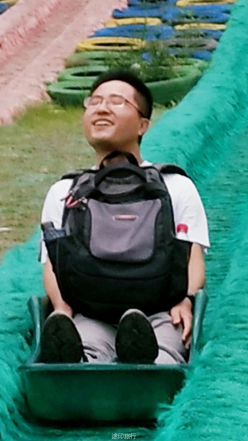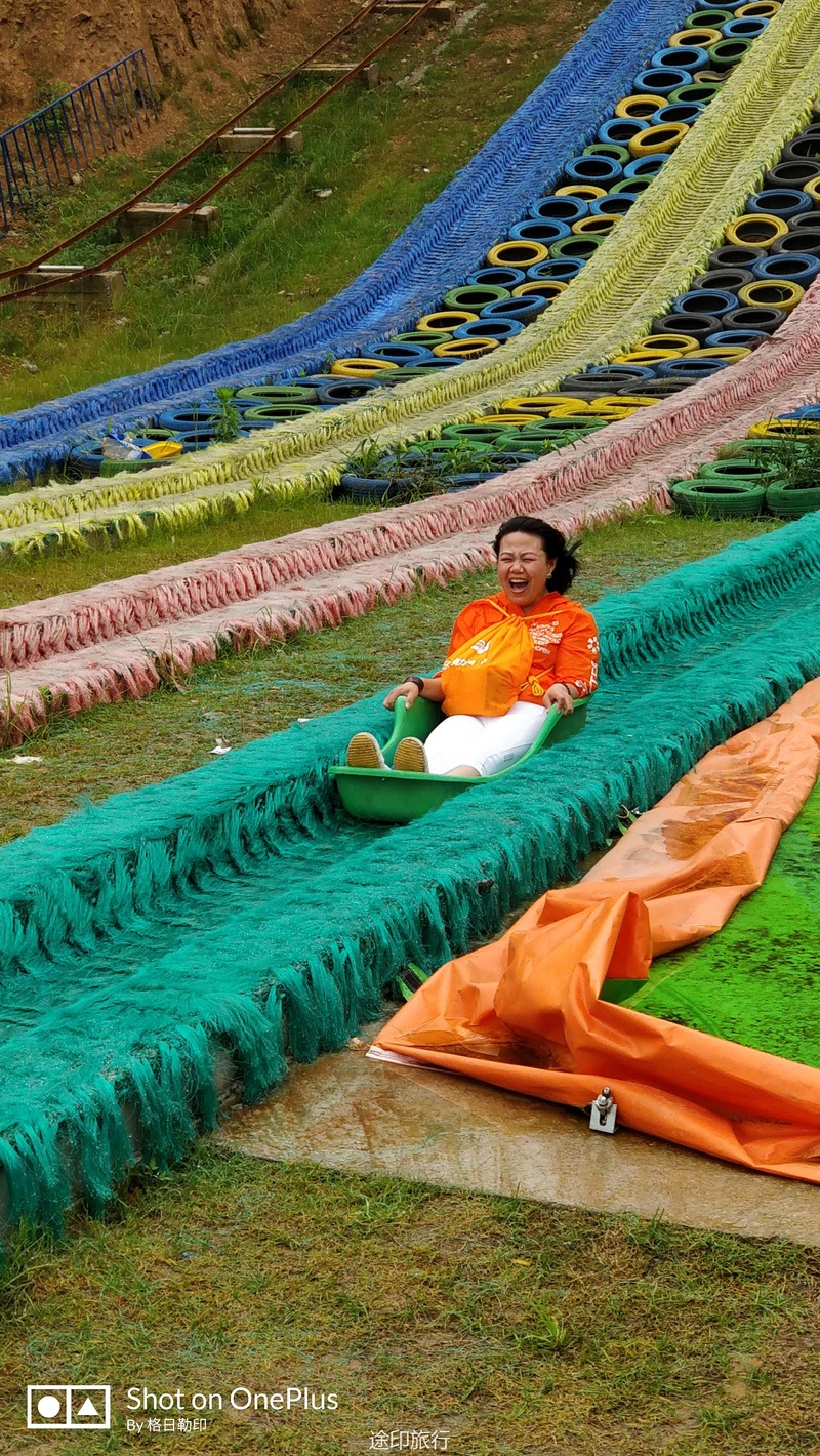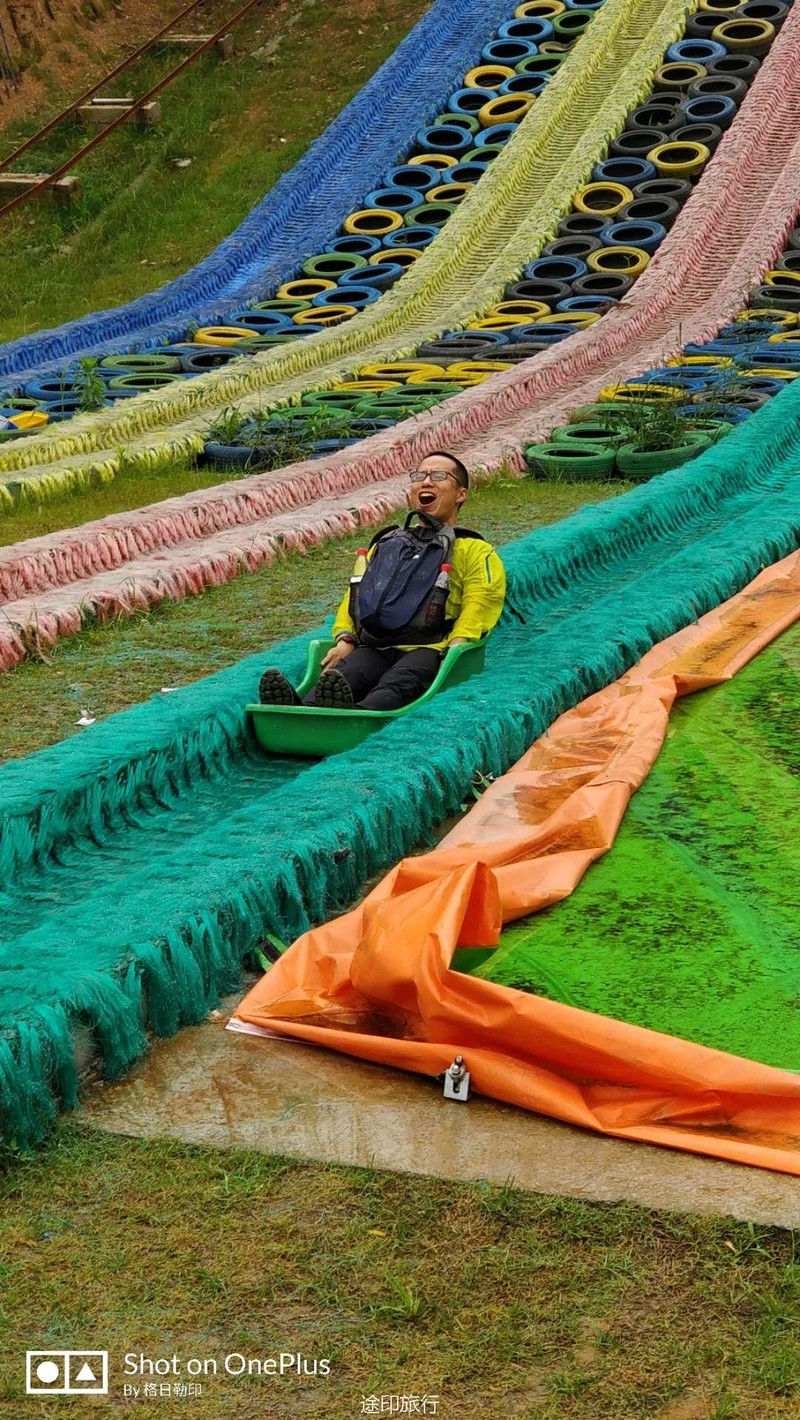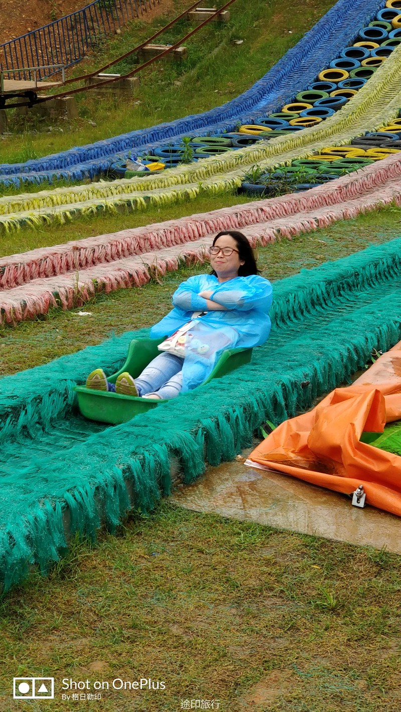 滑草项目人比较多,轮到我们时还排了大约20分钟的队伍。其实这个时候雨已经停了,天气正在渐渐地转好,太阳公公隐隐也有要冒出来的意思。但是由于早上下过一场雨,滑道上的塑料草上吸上了水,大家坐着滑板车往下滑的过程中会被滋一脸的水~