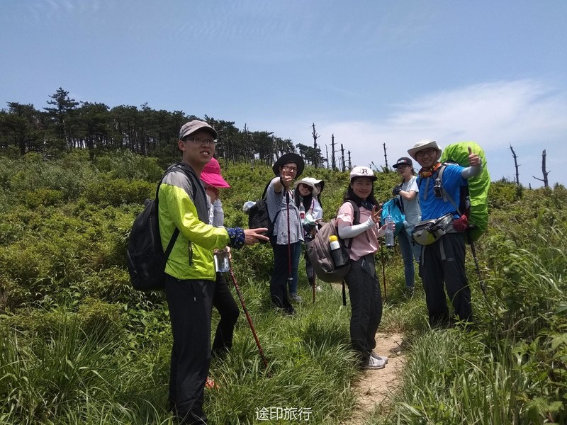 山里的空气很好,一早醒来看看天气阴沉。按计划7:30我们就出发去三尖的途步起点,简单热身后,就开启征服三尖之行。上山路上拍了一张照片,看装备就知道好几位就知道是新手,后面发现我的担心是多余的。