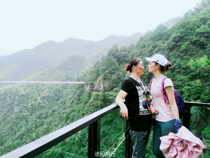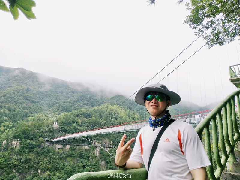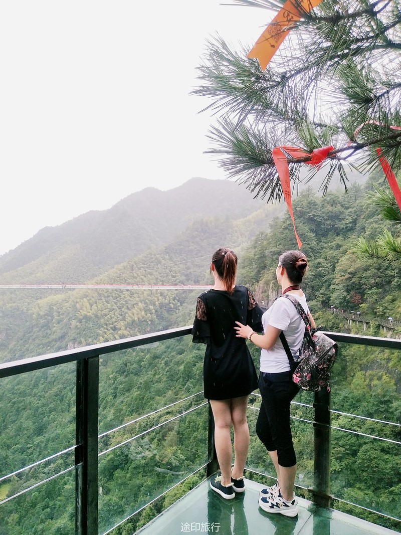 今天上午的重头戏当然是让人期待已久的华东第一高玻璃桥啦,全桥跨度365米,垂直高度189米。雨天湿气重,又因为地压低,雾气在山林间散不开,低低地在对面的山头间环绕,映着玻璃桥,仿佛是仙境一般。虽说晴天景色好,但是这一派山雾缭绕的美好风光也是不可多见的。