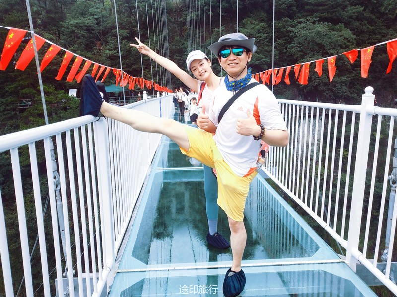 大家都慢慢走着向玻璃桥进发,在抵达玻璃桥之前,有一个正朝着玻璃桥的玻璃景观台,拍照取景十分不错,还有一小段玻璃栈道,不十分恐怖,还有专业的摄像师在此处给大家拍照。下山后小照片可以免费拿走,大尺寸的则是15元一张可以塑封带走。