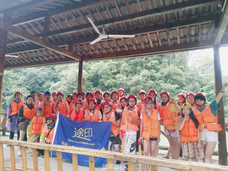 一直对张家界的美景和玻璃桥心向往之,只是可惜因为种种原因(多是因为穷)不能如愿前往。最近灵江源森林公园里传说中的华东第一高玻璃桥名气大增,遂决定前往一探究竟。这次一行共34+2人,一辆大巴周五晚上集合完毕前往目的地,人员众多,看来大家对于玻璃桥和玻璃道漂流的期待都很大。这一次的队伍里,有经常见面来参加途印活动的老熟人,有带着小朋友抓住暑假尾巴的家长,有平时工作忙碌疲于加班出来放松身心灵的IT男,有和闺蜜、伴侣、姐妹同来休闲的小伙伴,这一群个性不同的人组在一起共同渡过了一个完美的周末。周六早上吃完早饭前往灵江源森林公园,天气不能说完美,断断续续地下着雨,时急时缓。在公园门前拍完集体照,便慢悠悠踩