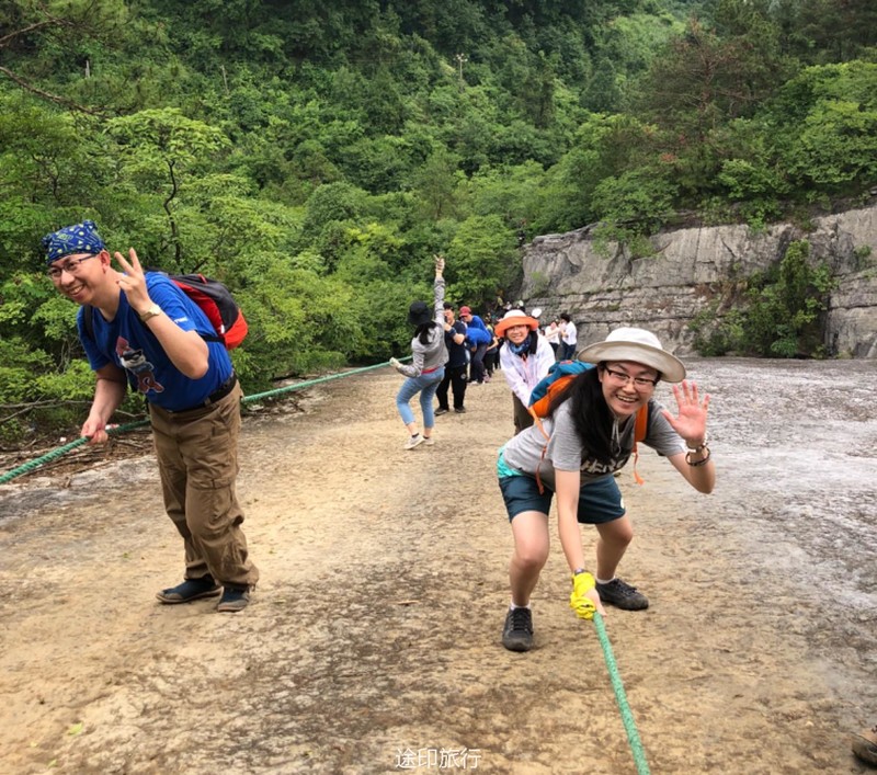 从卧龙洞出来,真的有种恍如隔世的感觉,心情很美妙。12点半左右我们开始吃午饭,依然是光盘行动,看来大家的习惯都非常好呀。吃好午饭,我们已经进行到行程的最后时刻了—-下山到豹子崖。当我们下到豹子崖的时候,居然没有一个人,真的是激动得热泪盈眶,话不多说,我打头阵先下去了,鼓励大家不要害怕,慢慢拉着绳子往下走,其实也是很安全的。然后各种开始凹造型了,太好笑了。