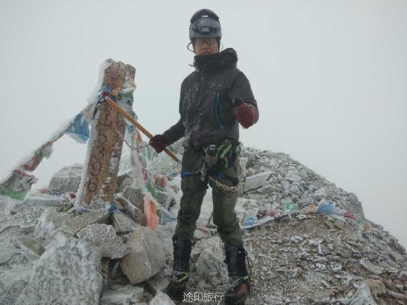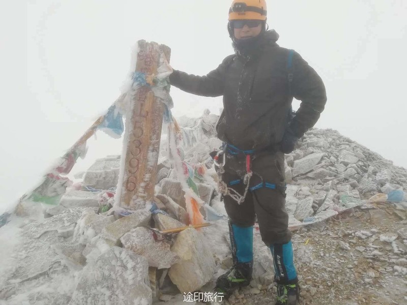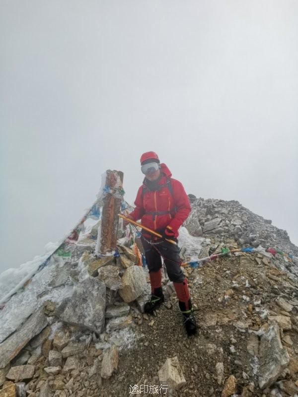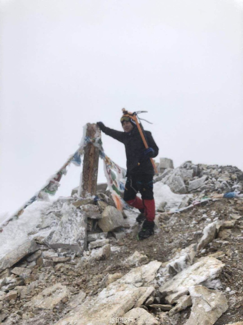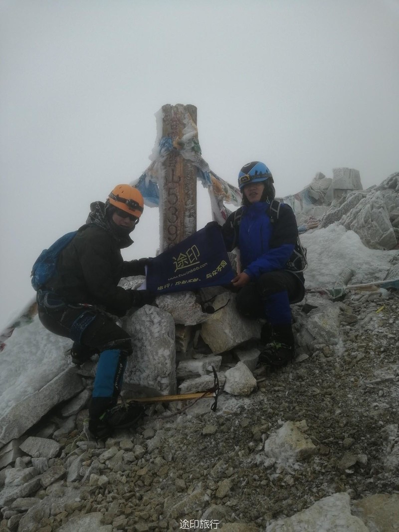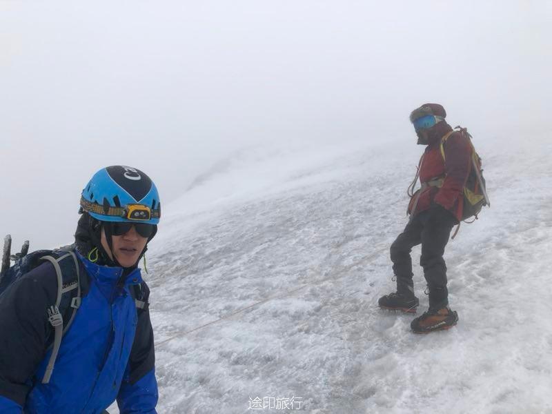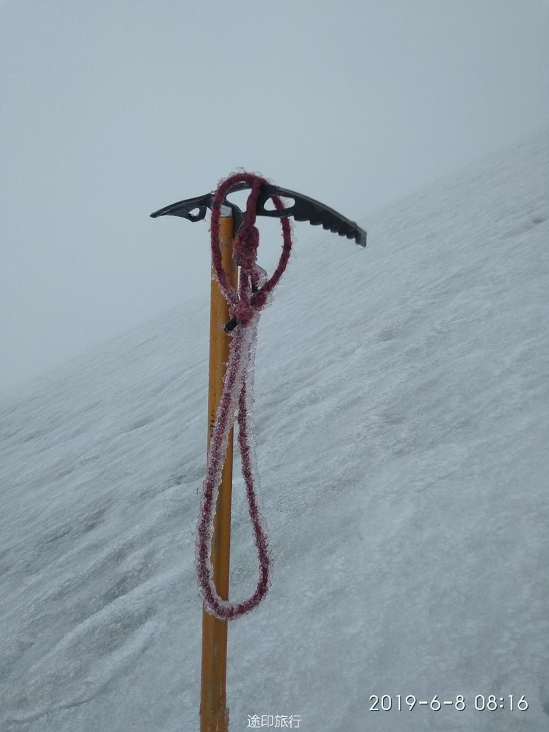 有5位队员选择骑马到海拔4500m,一路上坡也只能看到脚下的路。直到6点多,本以为可以看到日出,只是老天不给面子,没能如愿。大家走走停停,到海拔4900多,换上冰抓,冰镐走在雪线上,脚踩着咔哧咔哧的响,有些地方的雪能到膝盖。由于体能各有差异和出发的方式不同,我们就各自为一队,向山顶5396进发。路上也有其他队伍的人,当我还在上山的时候,已经开始下撤了。