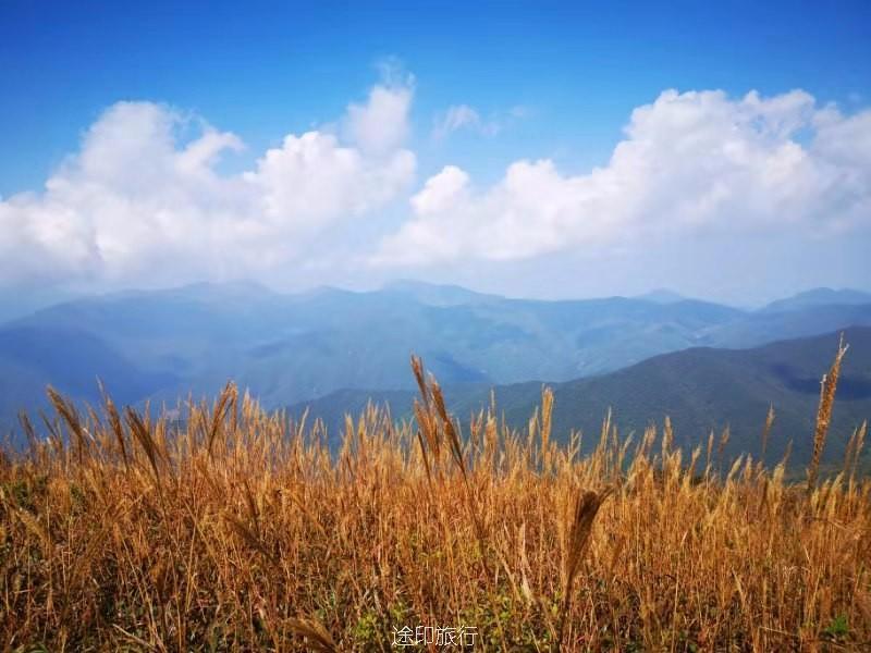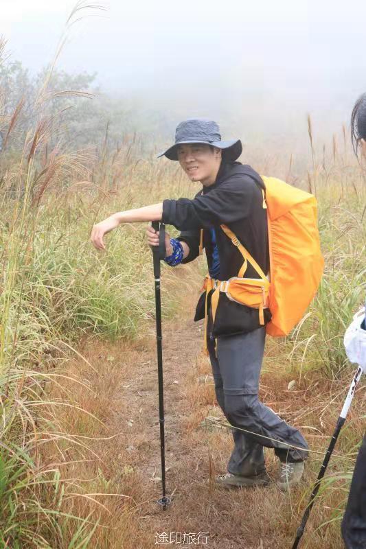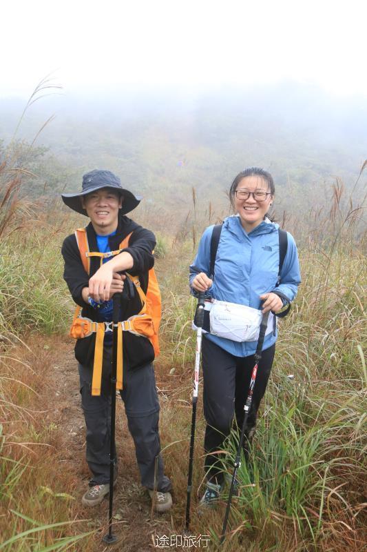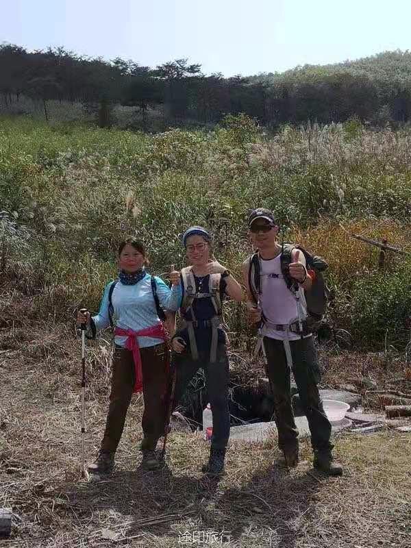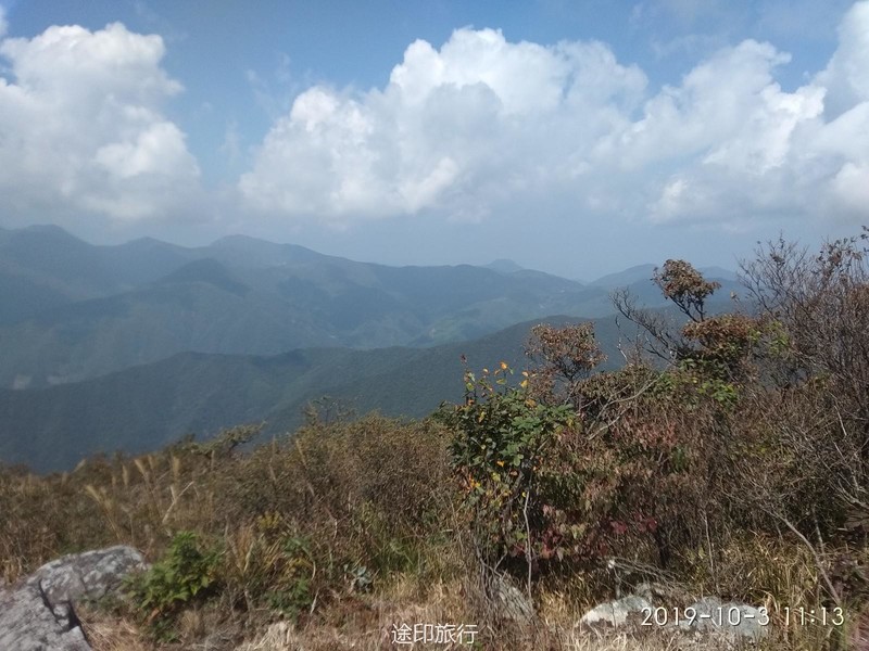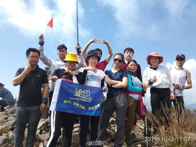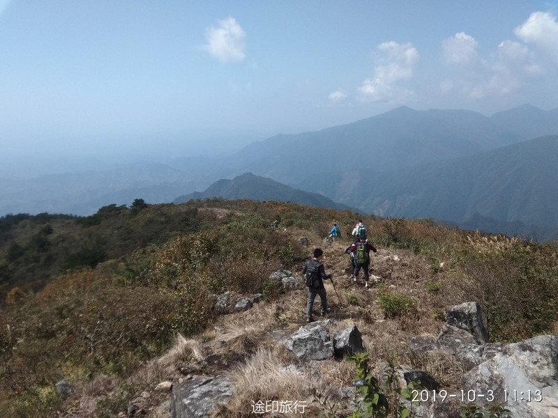 10月3日,天气晴。经过昨天的路程,少数队员选择不去第二天的程。7:15开始出发,今天刚开始是一个长爬升,速度还算能控制。今天的天气不错,但虫子太多,不注意看,还以为是镜头脏了呢。一到下山,就看到了人啦,我们一路走走拍拍。