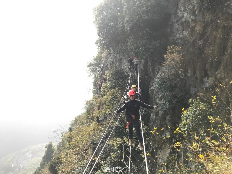 飞拉达是意大利文(Via Ferrata,意为岩壁探险或铁道式攀登)的音译,英文则为Ironroad ,指的是在山面上建设,由铁扶手横梯、固定缆索、岩石塞、踏脚垫等构成的爬山径道,让爬山者不会攀岩也能攀上陡峭的岩壁。飞拉达线路的特点:保留了野外攀岩的惊险刺激,达到锻炼体能和意志的目的,同时大大降低了对攀爬者的专业技术要求,在安全有充分保障的前提下,让普通人也驰骋悬崖,会当凌绝顶,获得极大的精神享受。每一条飞拉达攀登线路都是唯一的,更加立体化、空间化、系统化的开发自然资源景观。