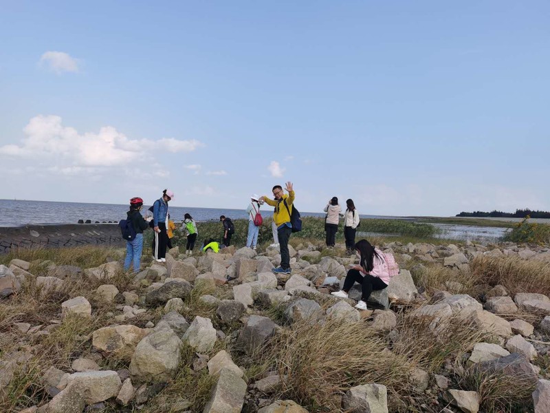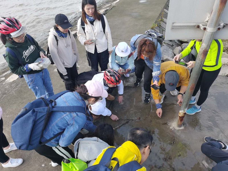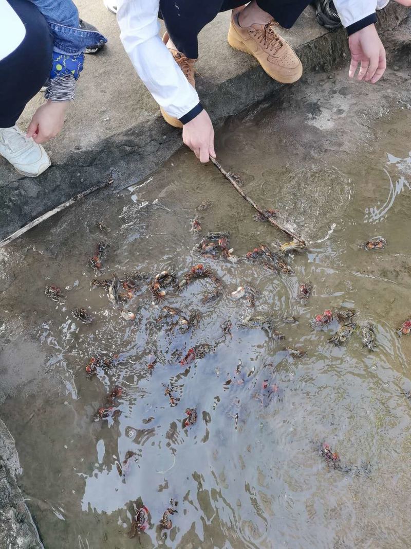 横沙岛三面环江,一面临海,一路上风景秀美,路旁水杉林立,河流纵横,湿地成片。秋季来临,这里的湿地爬满了小螃蟹。停好自行车,进入湿地堤坝旁的【螃蟹生活区】,开始和小螃蟹斗智斗勇