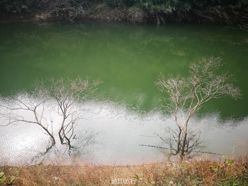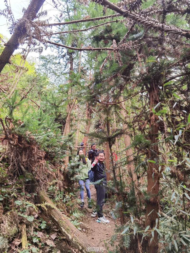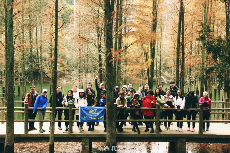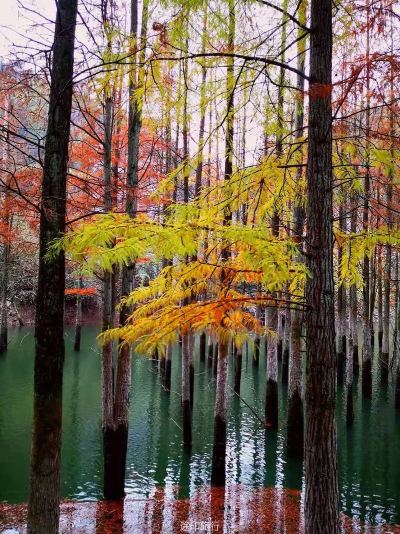 不知不觉我们到了山顶的水库,水库的尽头是一片水杉树,远看相是火在烧,哈哈~