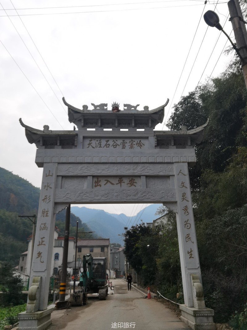 从上海集合完毕后,我们乘坐途印安排的大巴,驱车3个小时左右,就可以到山脚下的稽东镇村,目前入口处正在施工,可以看出,将来是要收费的啦。