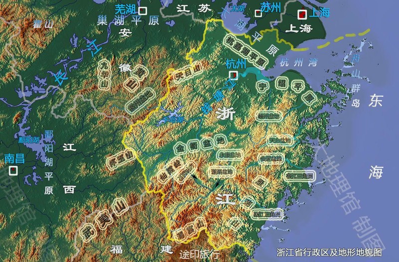 ▲ 浙江省行政区及地形地貌图 图|大地理馆