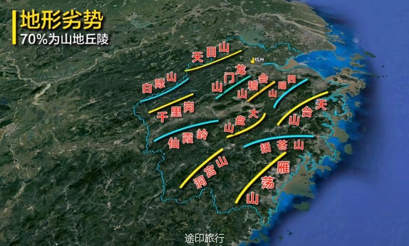 浙江的山地丘陵面积占到全省总面积的70%以上,历史上“七山一水二分田”的俗语也在此得到了印证。而浙江的西南部,曾经是喜马拉雅运动波及的边缘,地质抬升过程非常明显,为浙江带来了西南高、东北低的基本地理态势。