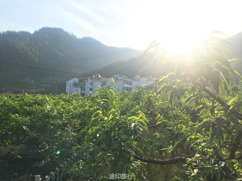 5.3一早起来,太阳渐渐升起,将整个村庄都笼罩起来。清明节来时刚谢了花的桃树,现在已经枝繁叶茂,可能下次去就可以接出满树的桃子了。