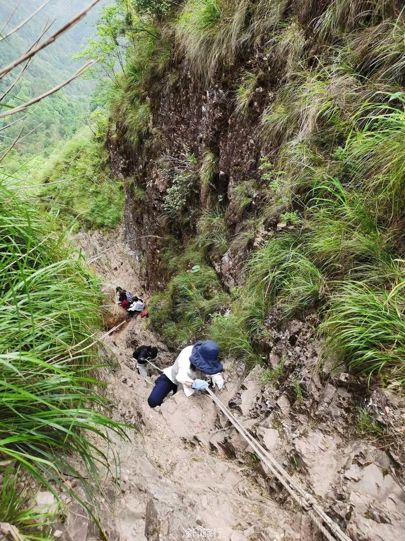 拉绳子上来之后,还有一段上升,挨着岩边走,有凿出来的石台阶,也要拉着钢丝绳。最后爬到最高处。