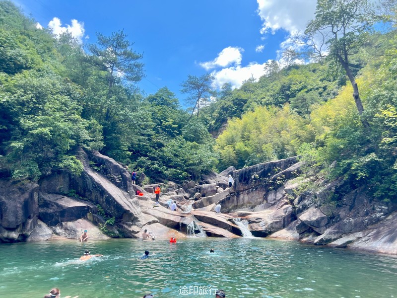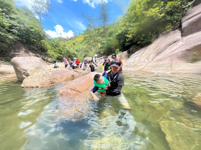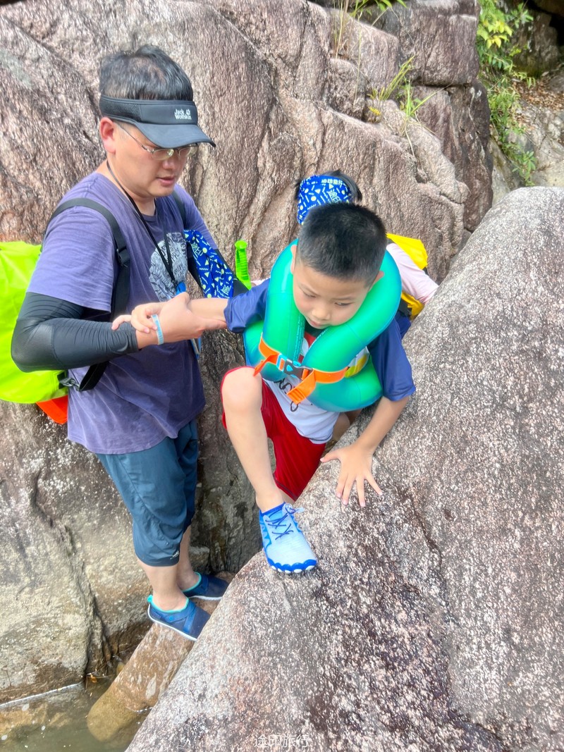 7月30日上午在酒店用过早餐,我们乘车出发,从酒店到达溯溪的起点大概一小时车程,由于蜿蜒的山路,伙伴们会有一些不适,但不管怎么,也毫不影响我们出行的激动心情。炎炎夏日,我们一下车就感觉到一丝清凉,可能是在峡谷里的原因吧。这里空气清新,好似我们吸进去的每一口空气,都比市区里的氧气多一些,温度清凉,好像回到了小时候的夏天,每一个毛孔都透着一股凉风,就如同是空调房,把外面的热空气隔绝了,但是却那么天然,绿色环保,令人心旷神怡。由于这条线路的深水处还是很深的,不会游泳的小伙伴都需要船上救生衣,下了一座大桥,我们就开始涉水了,踏入小溪中,马上就感觉到一种直沁心肺的凉,夏日的气息无影无踪。水流忽宽忽窄,重重叠叠的山,区区环环的溪流,叮叮咚咚的泉水,高高矮矮的石头……沿路上也会遇到很多见到没见过的动植物,蜻蜓、螳螂、蟾蜍、知了、都十分有趣可爱,走了一半的路程,我们来到了一个大水潭,这里的潭水碧绿,上面一注瀑布倾泻下来,伙伴们急不可耐的钻进水潭里…