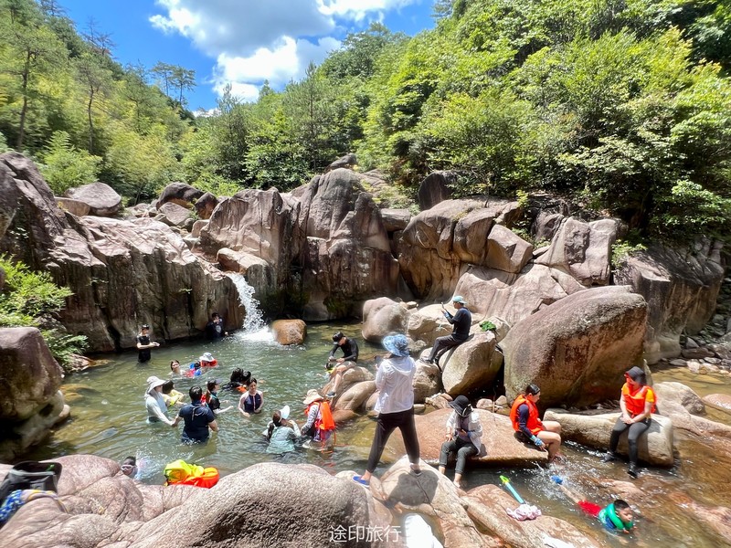跨上溯溪鞋,背上溯溪包,装备就绪,我们开始出发。目的地是台州市天台县石梁镇,开启2天的溯溪之旅。溯溪,就是克服地形的各处障碍,由峡谷溪流的下游涉水而上的一种探险活动,夏天最好玩的活动之一。而这次我们去的天台石梁是惊险又刺激的活动,出发就带着满满的期待。