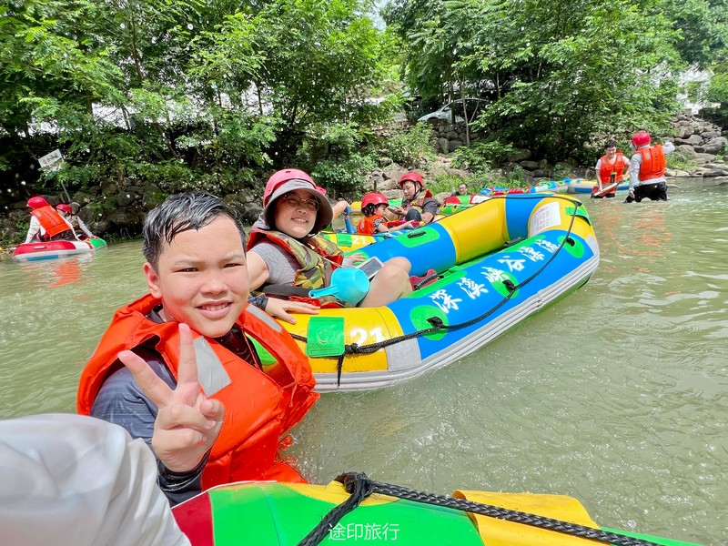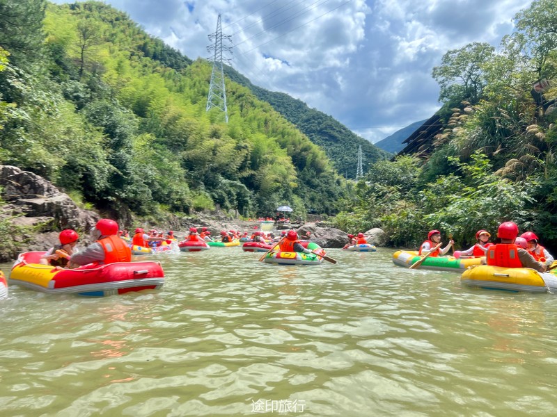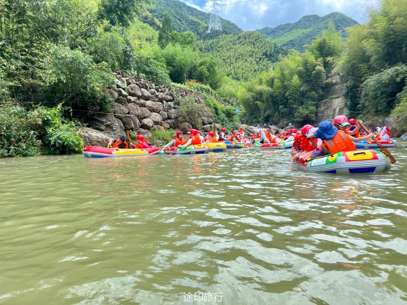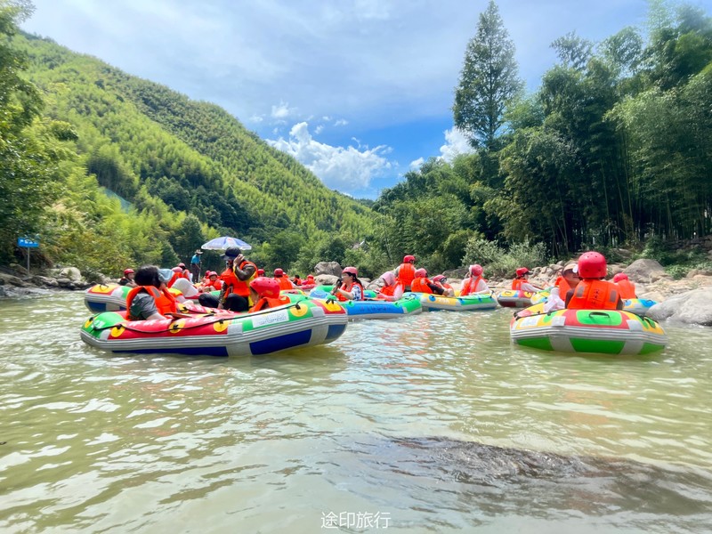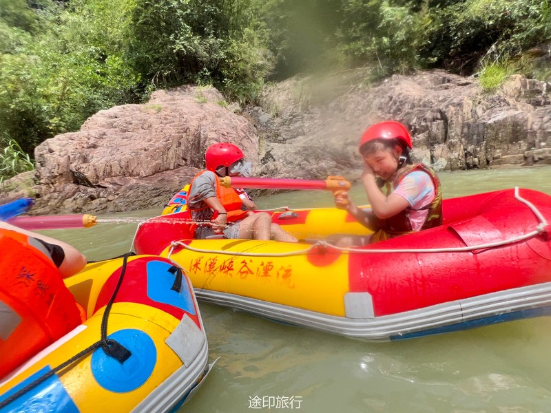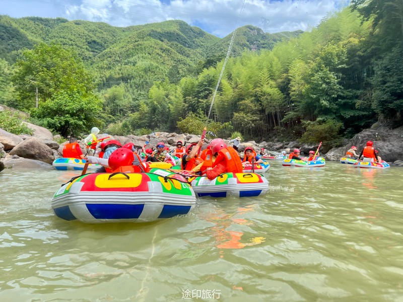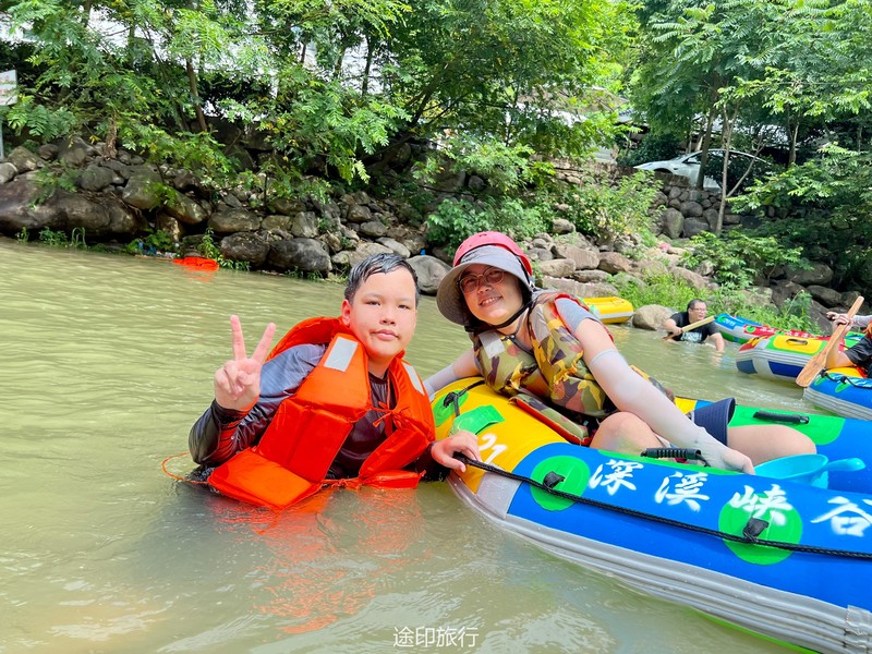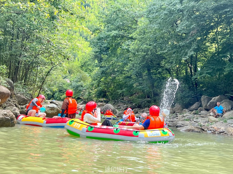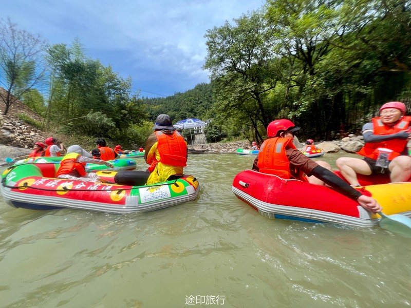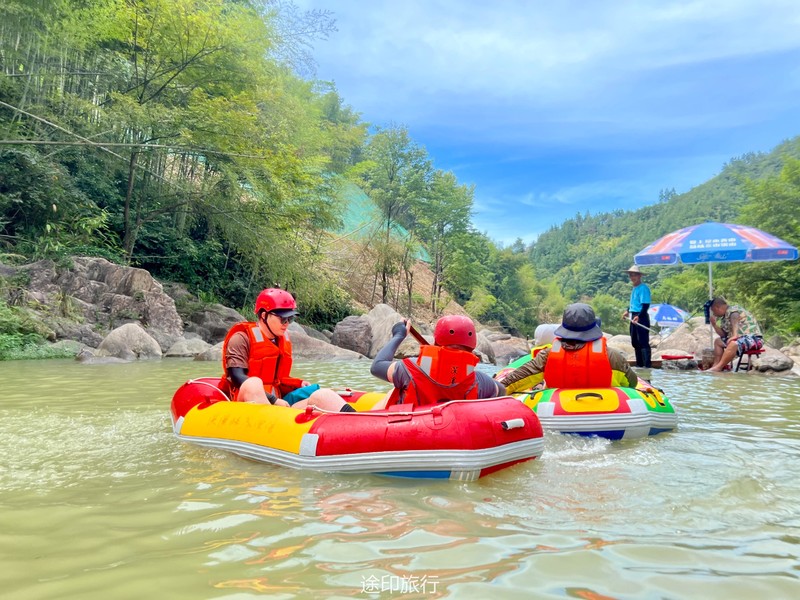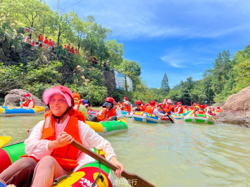 没有漂流的夏天当然是不完整的,已经不记得这是这个夏天的第几次来安吉漂流,要说起安吉的漂流,深溪漂流是数一数二的出名了,虽然已经到了立秋,但依然骄阳似火,漂流位于峡谷里面,我们需要乘坐短驳车到上游上船,整个流程环境优美,水流湍急,河水清澈,两岸绿草丛生,碧树成荫,驾车三个小时抵达售票处,穿好救生衣,我们坐上短驳车出发了。车辆大约行驶不到十分钟,就到了漂流上站。我们穿戴停当,随后排队检票进入漂流的上坝准备进入河道漂流。坐上自己挑选的漂流筏,拿起船桨,在工作人员的协助下,我们从漂流始发地的小水潭开始了惊险刺激的漂流旅程。在工作人员的助推下,小船如箭一般顺水而下。伴随着漂流的是游人的欢笑,清凉的河水不时溅到我们的脸上和身上,暑气顿时消减大半。随着激流陡坡接踵而来,不时有人惊叫传来。我们的漂流筏顺着河道往下滑。水流一会儿急,一会儿缓。水流平缓时,我们不得划船要领,费了半天气力,漂流筏却原地打起了圈圈,摸索半天才度过了难关。正想松一口气,小筏突然像过山车一样冲入下游,激的浪花四溅,我们的心都提到了嗓子眼!真是惊险刺激,非常过瘾。在一片水流平缓的水潭,水面平静得没有一丝波澜。干净的河水,清澈见底,如同一块碧绿的翡翠,好看极了!微风习习,我们自在地躺在小筏上,看着岸边的蜻蜓小鸟,听河岸的知了兴奋地鸣叫,一片田园风光,真是人间仙境。漂流途中,孩子们不时展开了水上对战。一个一个的都成了“落汤鸡”,但依然乐此不疲,一片欢声笑语。大约一个小时,我们就漂到了终点,每个人都有点意犹未尽。在终点有冲洗淋浴和更衣间,路边的饭馆和小摊不时飘出诱人的饭菜香气。漂流结束,我们驾车前往第二个景点,龙鳞坝,它是由水泥砌起来的堤坝,中间程半圆形,一块连着一块,就像鱼鳞一样,故名龙鳞坝,这个地方水很浅,刚刚摸过脚面,小朋友也可以放心的玩耍,坝两边有河坝,鱼鳞坝夹在中间,就像被围起来的一个流动的潭水,水上各自蜻蜓蝴蝶,原生态的景色吸引了大量的游客前来,半个小时时间,有些累了,我们上车准备回上海,深溪漂流每次都不会让人失望,怀着愉快的心情回沪咯!
