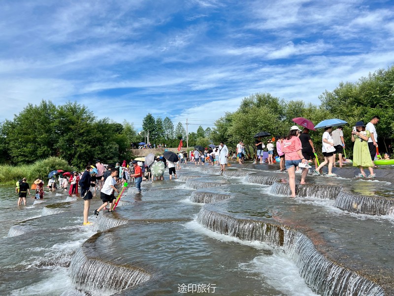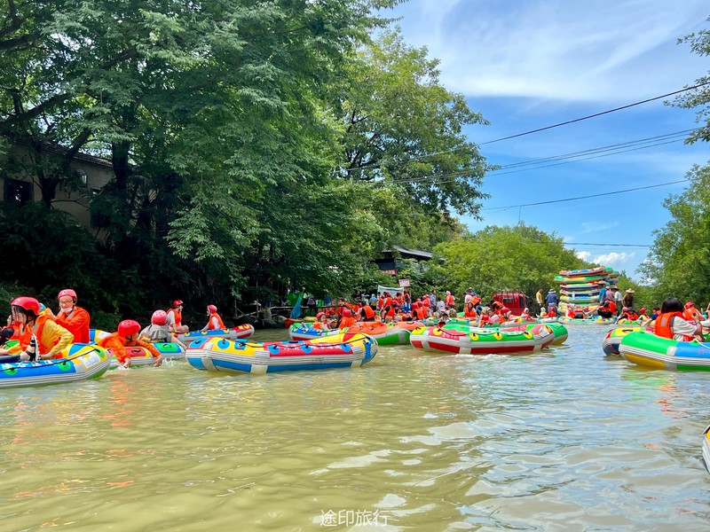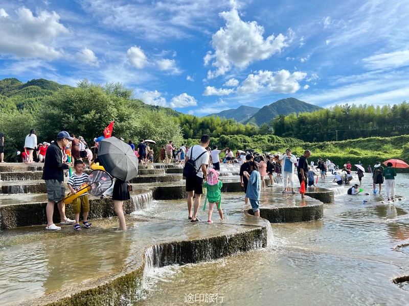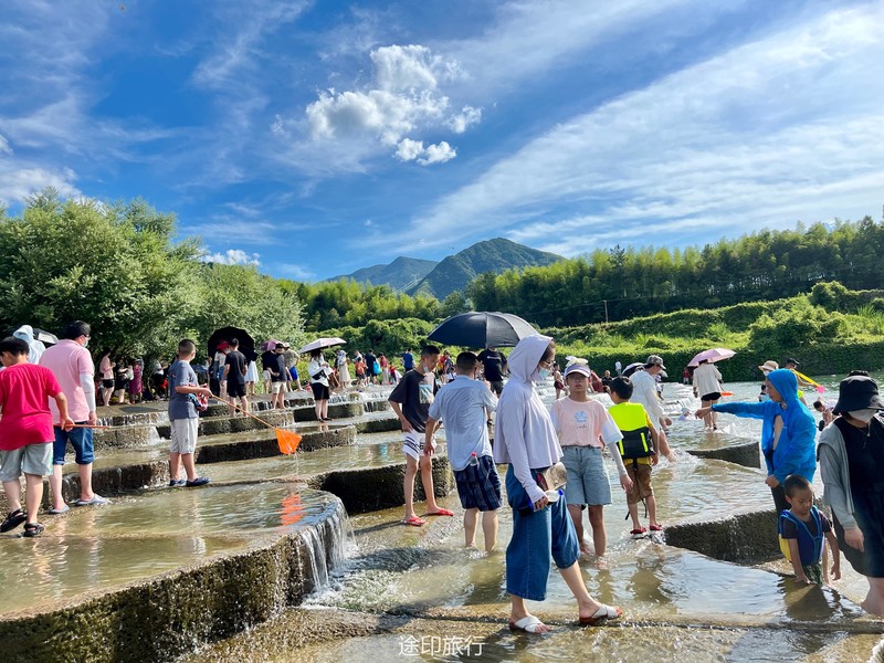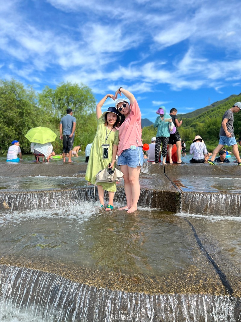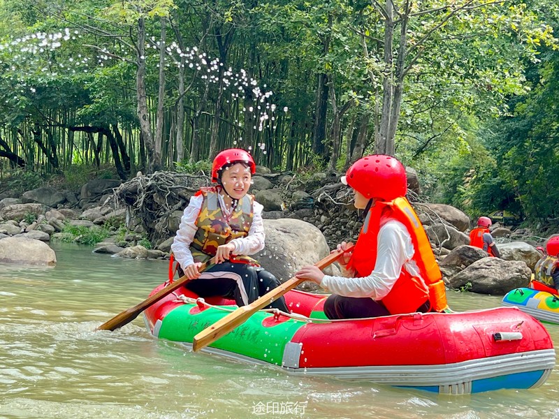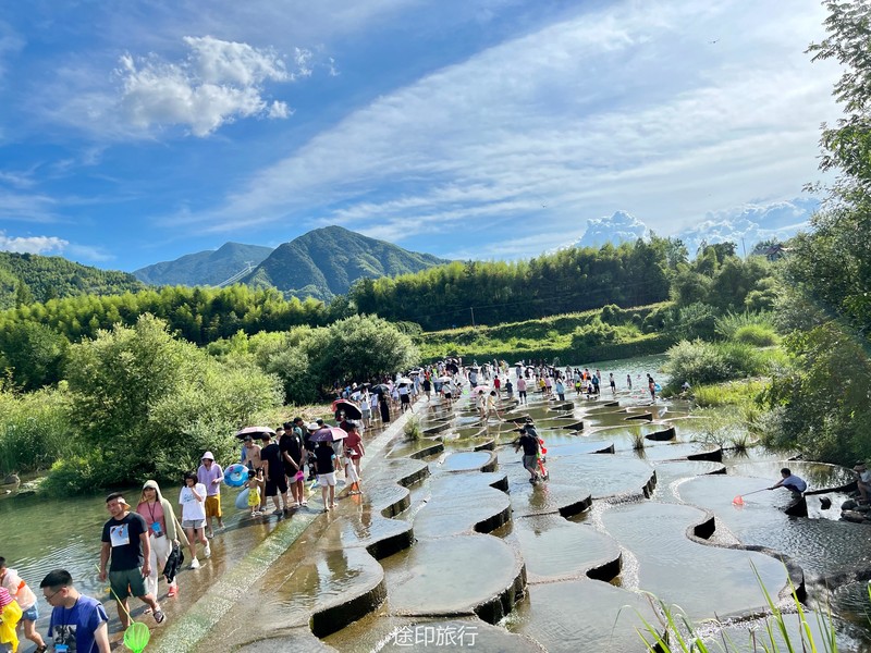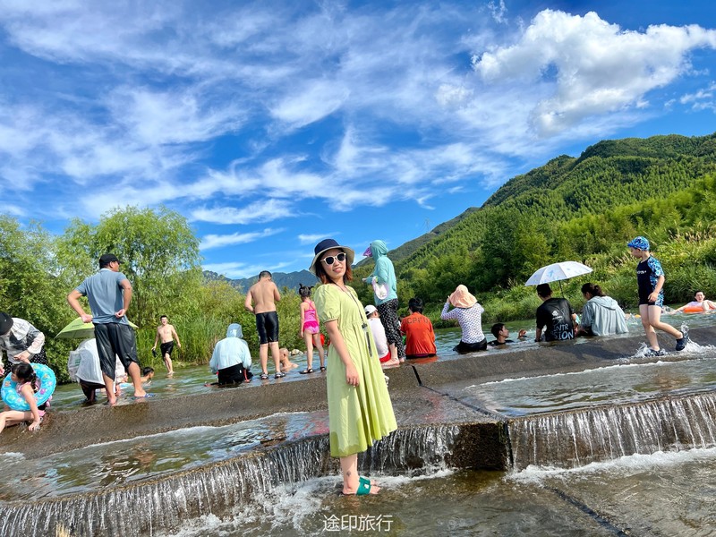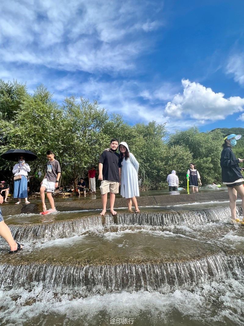 没有漂流的夏天当然是不完整的,已经不记得这是这个夏天的第几次来安吉漂流,要说起安吉的漂流,深溪漂流是数一数二的出名了,虽然已经到了立秋,但依然骄阳似火,漂流位于峡谷里面,我们需要乘坐短驳车到上游上船,整个流程环境优美,水流湍急,河水清澈,两岸绿草丛生,碧树成荫,驾车三个小时抵达售票处,穿好救生衣,我们坐上短驳车出发了。车辆大约行驶不到十分钟,就到了漂流上站。我们穿戴停当,随后排队检票进入漂流的上坝准备进入河道漂流。坐上自己挑选的漂流筏,拿起船桨,在工作人员的协助下,我们从漂流始发地的小水潭开始了惊险刺激的漂流旅程。在工作人员的助推下,小船如箭一般顺水而下。伴随着漂流的是游人的欢笑,清凉的河水不时溅到我们的脸上和身上,暑气顿时消减大半。随着激流陡坡接踵而来,不时有人惊叫传来。我们的漂流筏顺着河道往下滑。水流一会儿急,一会儿缓。水流平缓时,我们不得划船要领,费了半天气力,漂流筏却原地打起了圈圈,摸索半天才度过了难关。正想松一口气,小筏突然像过山车一样冲入下游,激的浪花四溅,我们的心都提到了嗓子眼!真是惊险刺激,非常过瘾。在一片水流平缓的水潭,水面平静得没有一丝波澜。干净的河水,清澈见底,如同一块碧绿的翡翠,好看极了!微风习习,我们自在地躺在小筏上,看着岸边的蜻蜓小鸟,听河岸的知了兴奋地鸣叫,一片田园风光,真是人间仙境。漂流途中,孩子们不时展开了水上对战。一个一个的都成了“落汤鸡”,但依然乐此不疲,一片欢声笑语。大约一个小时,我们就漂到了终点,每个人都有点意犹未尽。在终点有冲洗淋浴和更衣间,路边的饭馆和小摊不时飘出诱人的饭菜香气。漂流结束,我们驾车前往第二个景点,龙鳞坝,它是由水泥砌起来的堤坝,中间程半圆形,一块连着一块,就像鱼鳞一样,故名龙鳞坝,这个地方水很浅,刚刚摸过脚面,小朋友也可以放心的玩耍,坝两边有河坝,鱼鳞坝夹在中间,就像被围起来的一个流动的潭水,水上各自蜻蜓蝴蝶,原生态的景色吸引了大量的游客前来,半个小时时间,有些累了,我们上车准备回上海,深溪漂流每次都不会让人失望,怀着愉快的心情回沪咯!