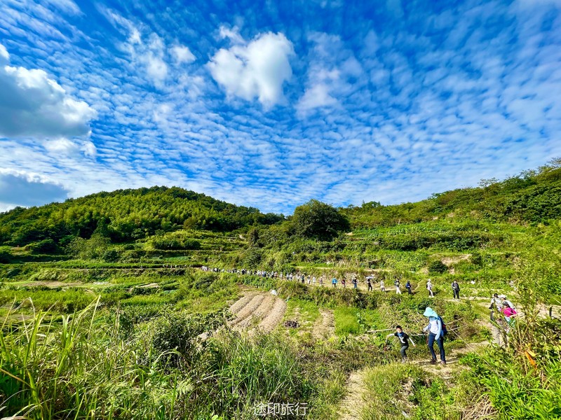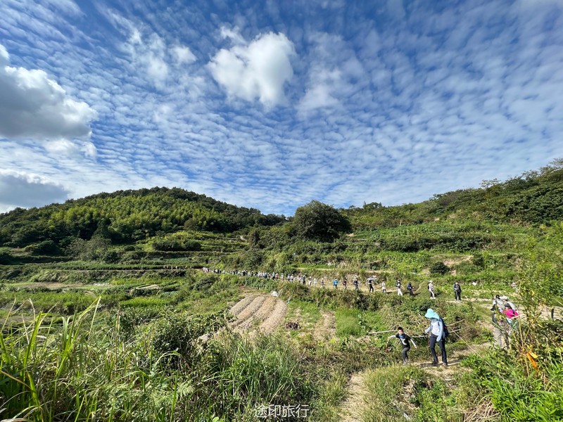 我们的大巴车开不上去,下了车需要步行40分钟左右到达山脚下,往年的泥山路今年已铺好卵石路好走多了,但还是有点陡,每走几步就听见后面的伙伴喘大气。