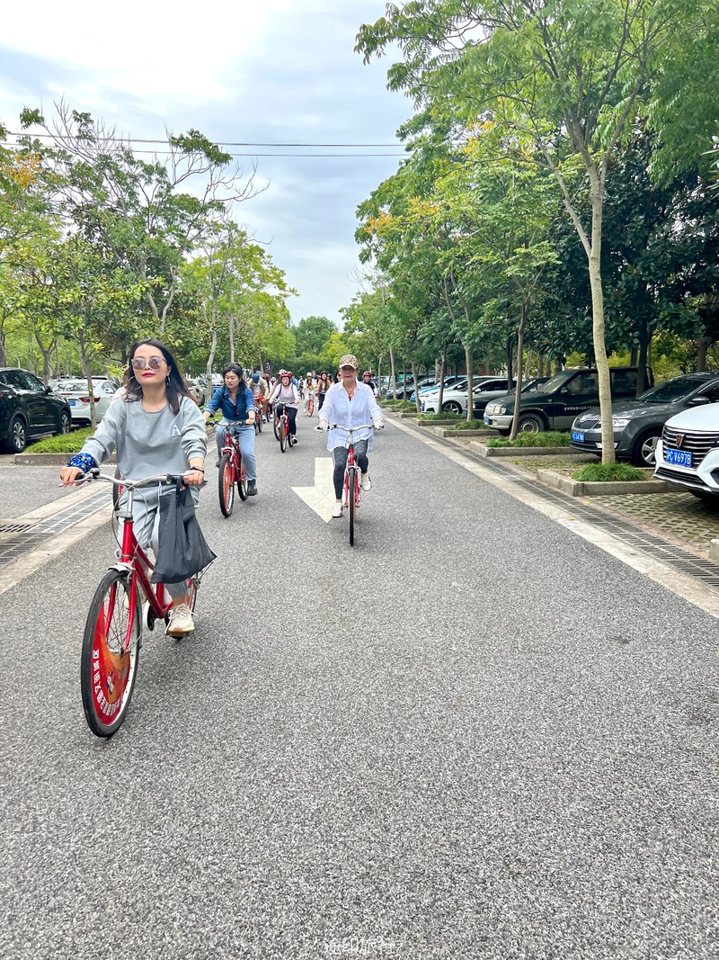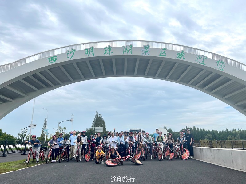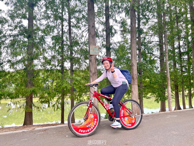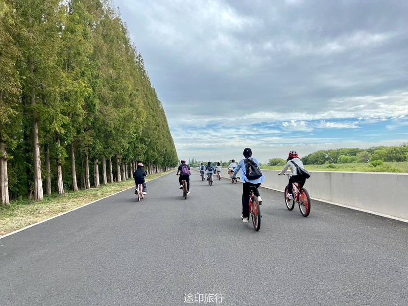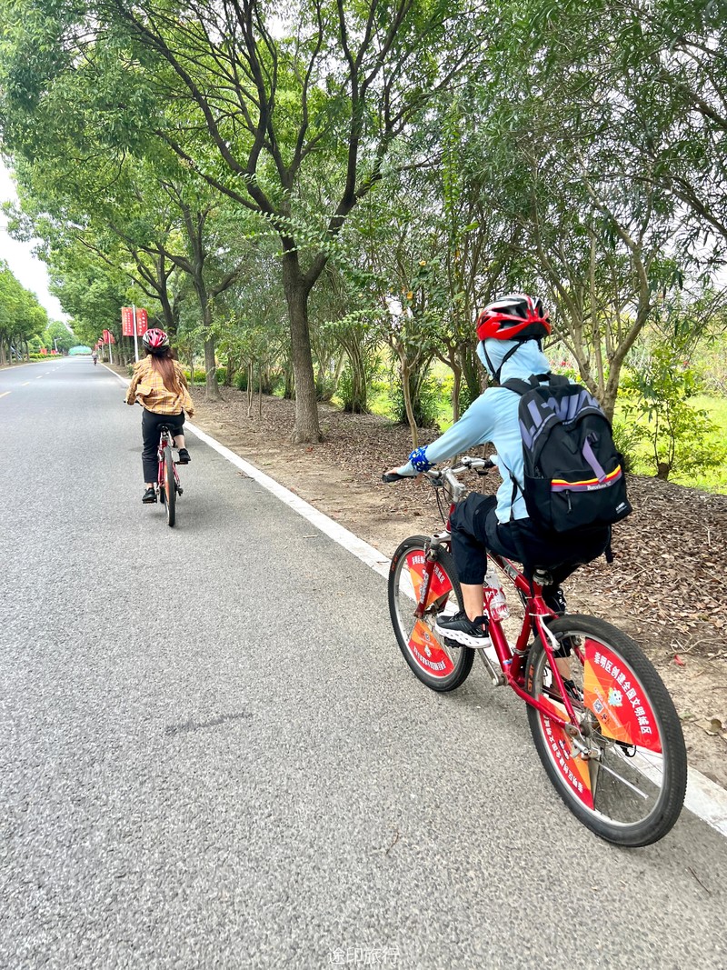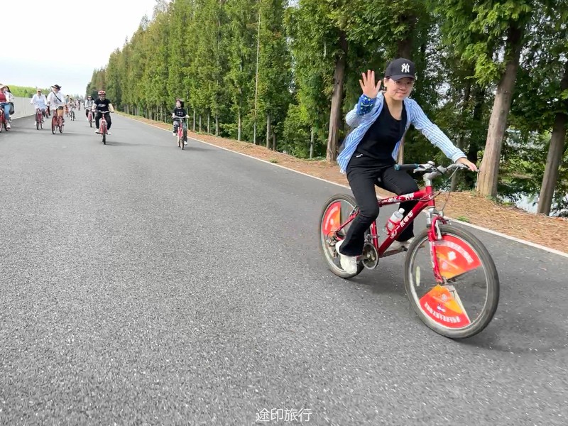 小朋友们已经站好了有利位置等待螃蟹上钩。中午时分我们在西沙湿地用完午餐,乘车去明珠湖门口骑车。沿着明珠湖骑一圈,大概17公里,选好了自己的座驾,小伙伴撒了欢的骑起来,我们本次是环明珠湖逆时针骑一个不规则的四边形,沿途的杉树是一道美丽的风景线,平坦的路,凉爽的风,经过的路、滩涂、森林、远处的大桥......这些景象若即若离是耶非耶,徐徐的风从耳边吹过,舒服极了。 环岛一周大约2小时,快5点时分,我们回到租车点,还掉座驾,崇明岛的风吹走了全身的疲惫,踏上回上海的大巴。崇明岛,下次再见!