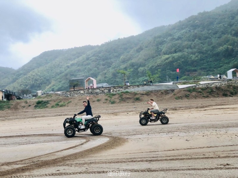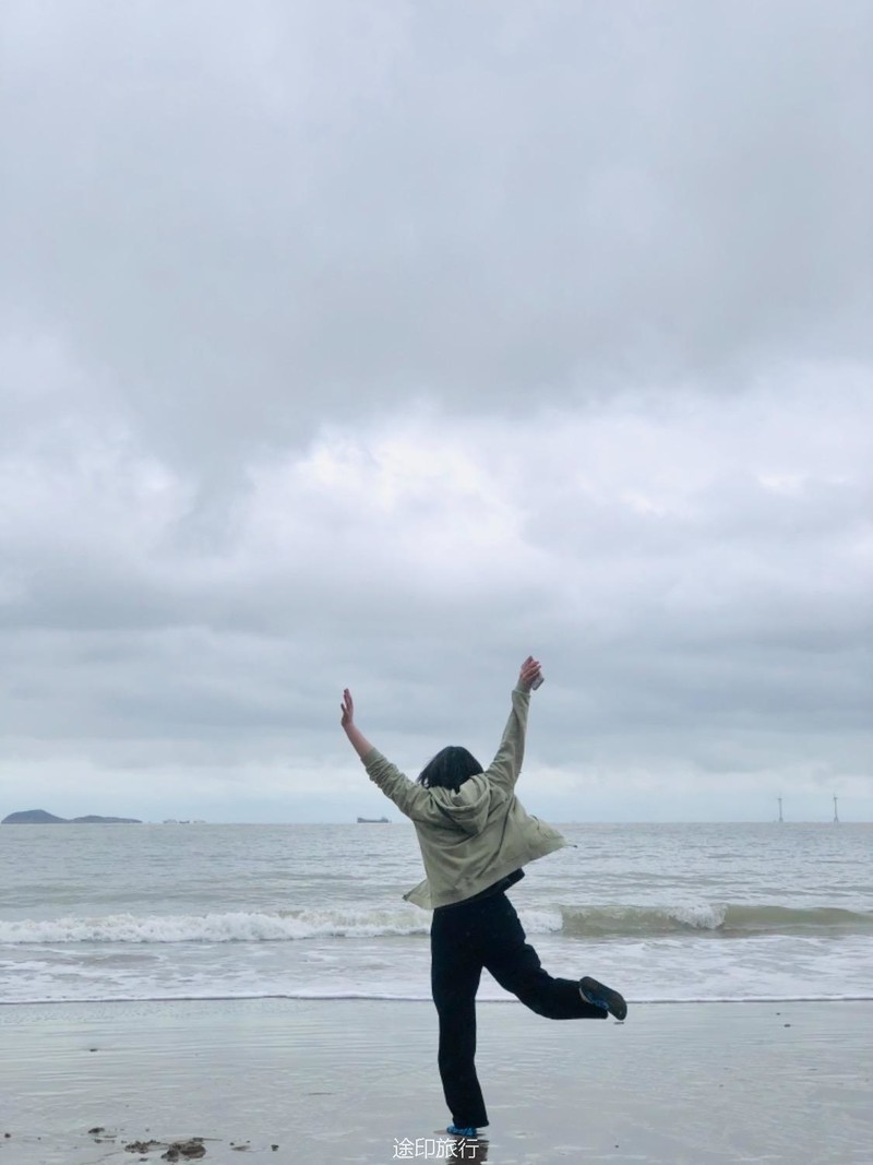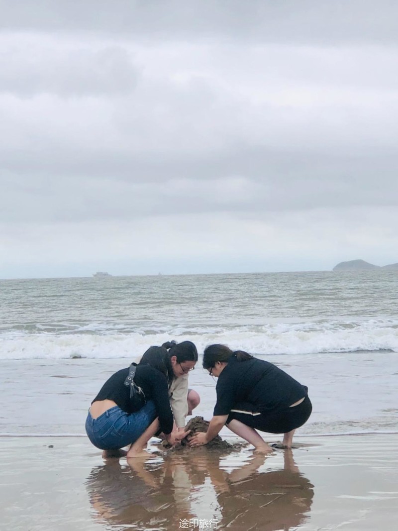 第二天我们先去了南田岛上的风门口省级森林公园。风门口,三面环山,一面向海的小海湾,两边山峰对峙若门,海风由此登岛,故名风门口,现为风门口景区。 景区里边有礁石和一个沿海超级大草坪,可以拍照,野餐和露营。 然后去鹤浦大沙沙滩,虽然是国庆节,这里的人也很少很少,我们团队快承包了整个沙滩。 虽然天气不好,但是大家还是愿意挖沙子,踩踩水,拍美照。如果晴天,可以玩的更久。