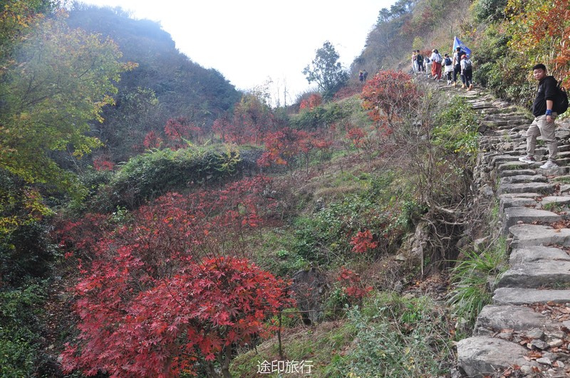 从栖霞坑村口出发,有一幢晚清风格的古建筑王氏祠堂。栖霞坑秋季枫叶红时十分漂亮,沿着小溪出发,走到红枫古道时变得狭窄,而且十分陡峭,风景也随之更加优美起来。唐田村也是红枫主产地,上千亩的红枫,在深秋会格外的美丽。然后沿着潜坑下山去岭脚村,是一条狭长十分陡峭的小古道,下山无比一定要一路小心。到达岭脚村后,翻过一座小山即可返回栖霞坑村。栖霞坑古道是浙江宁波市较著名的一条线路,行走难度不大,沿途风景不错。并不是一条有很大难度考验登山技术的虐线,适合各个年龄段健康人群野游郊游。
