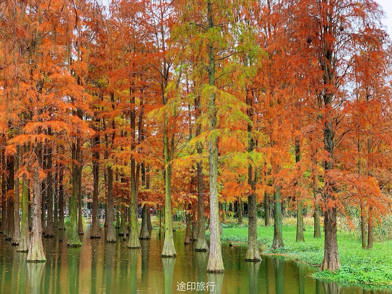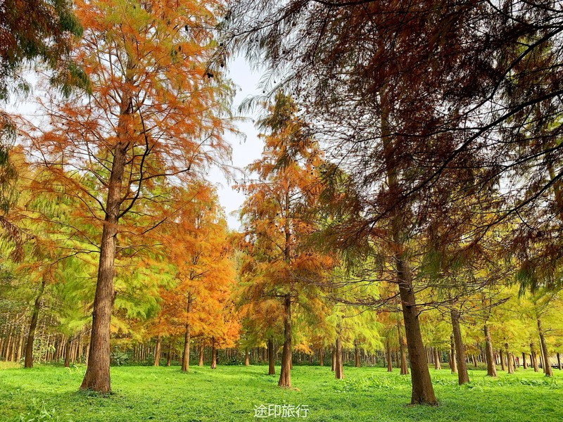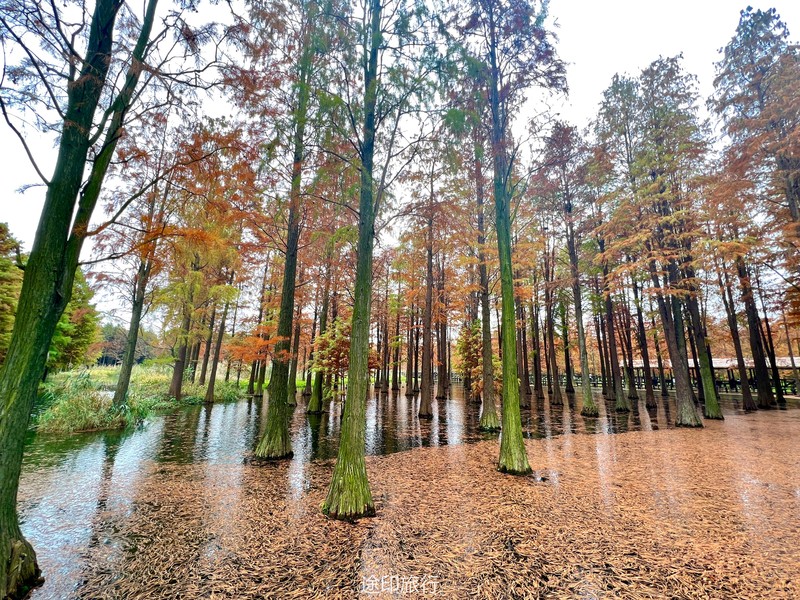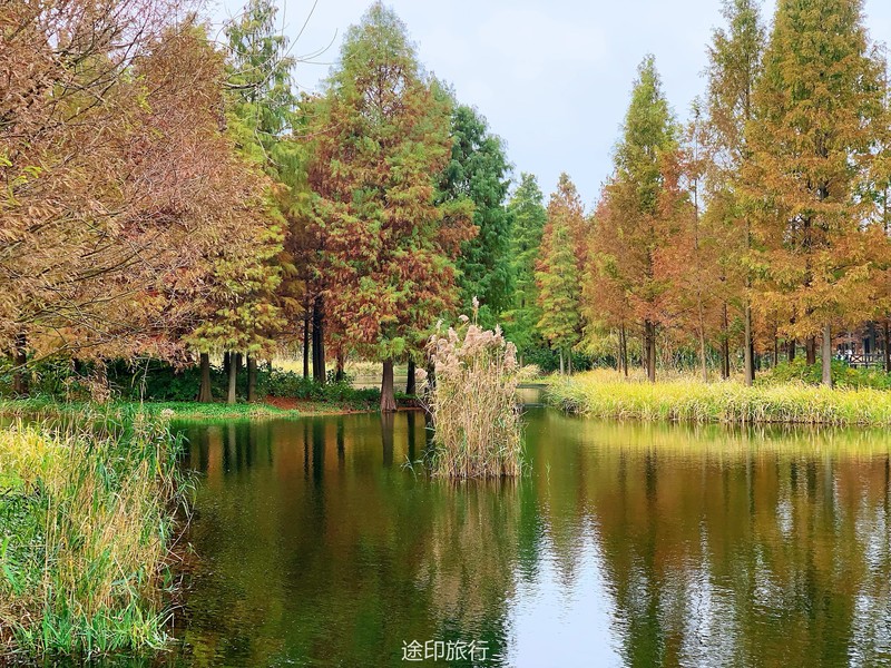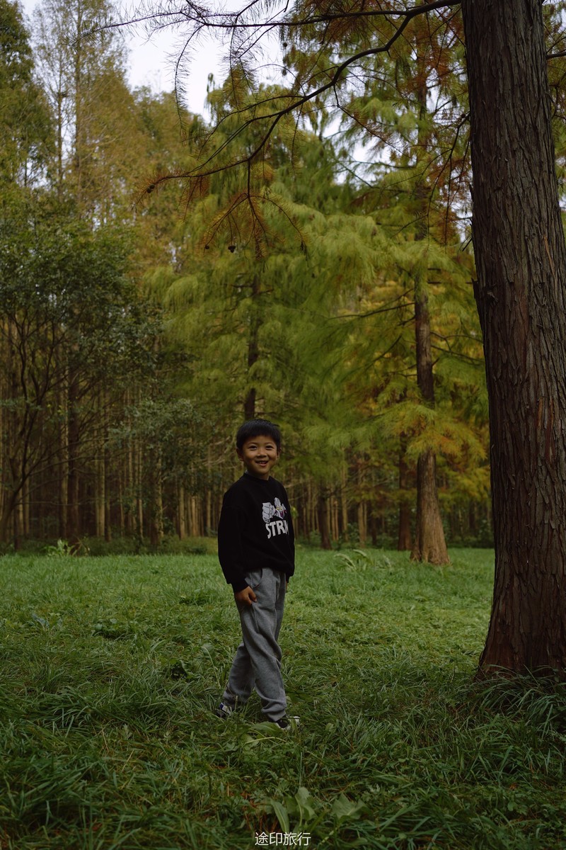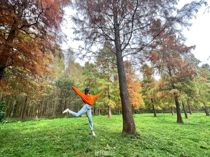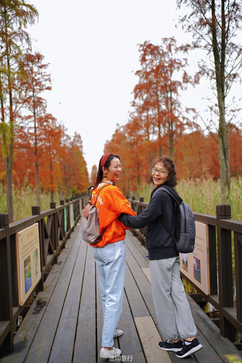 “水上森林”位于青西郊野公园生态保育区,面积达60多亩,以池杉等耐水湿树种为主,水林相间,鸥鹭翔集,形成了上海地区独有的景观。由于公园面积大,从停车场到景区检票口,大概步行40分钟就到了生态保育区大门口,青西郊野公园不用买门票,要看水上森林就在保育区门口当场扫码预约进入(保育区在公园深处,水上森林在保育区深处)。在历经长时间的车程➕等待后我们总算到达目的地。保育区里的步行道全都是木栈道,道路不宽,三个人并行走就有摩肩接踵的感觉了。去往水上森林的路上还有一长段路,路旁满满都是杉树,阳光透过秋日特有的红棕色杉树叶照在翠绿的草地上,有一种岁月静好的感觉。保育区指示牌还算清晰,顺着指示牌或者跟着人流走,都能到达水上森林。路过观鸟屋再笔直走转个弯就到了水上森林池杉区域。矗立在木栈道左右两边的杉树扎根湖底,树木高耸。看见这一大片水杉才觉得今天没有白等。木栈道两旁都能拍出不同风景。