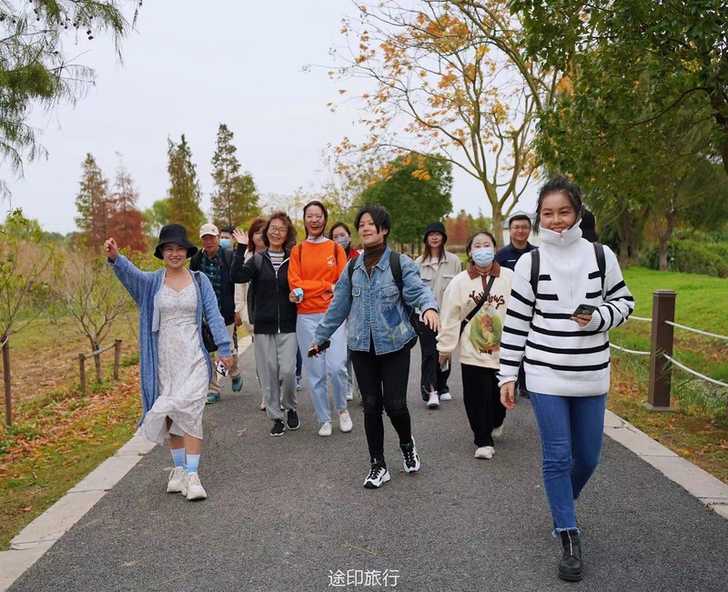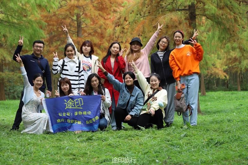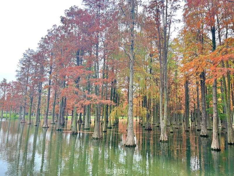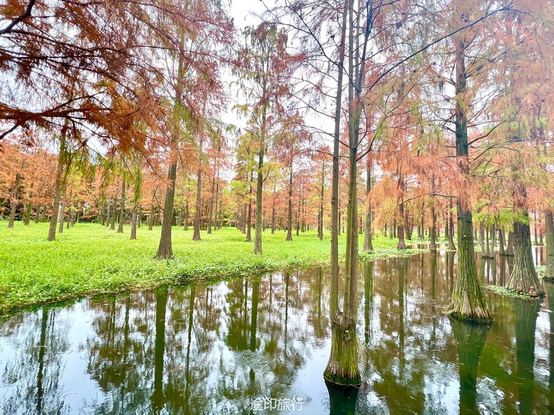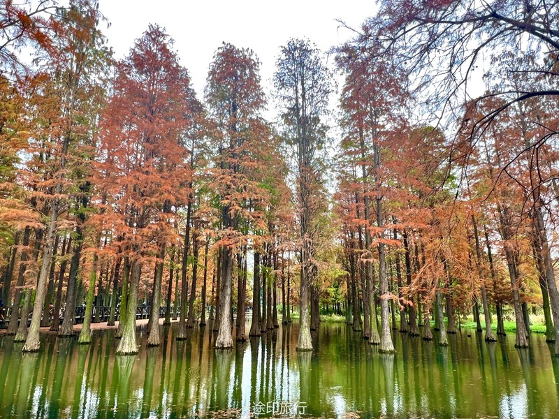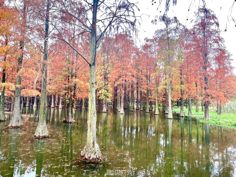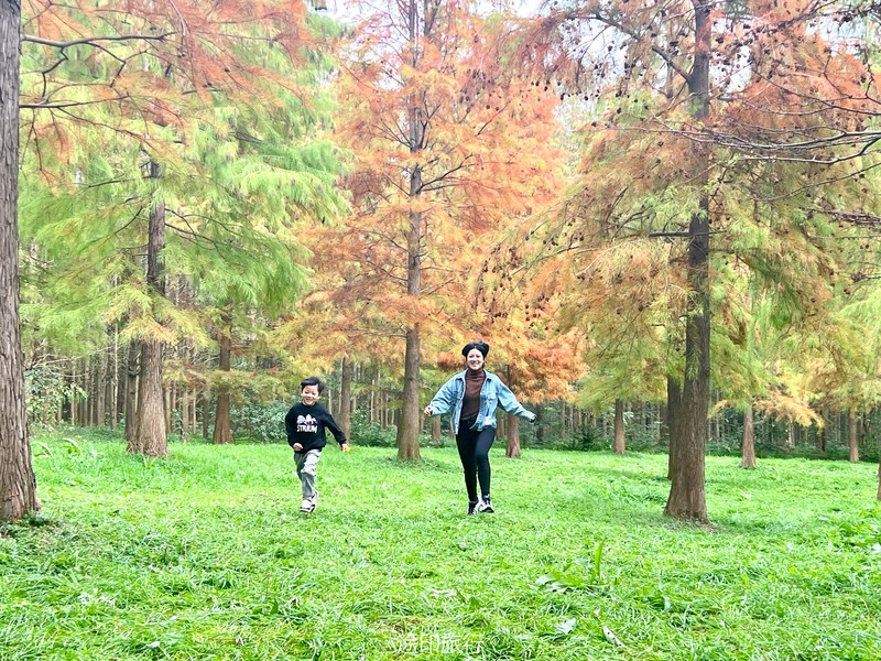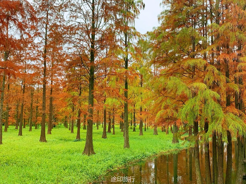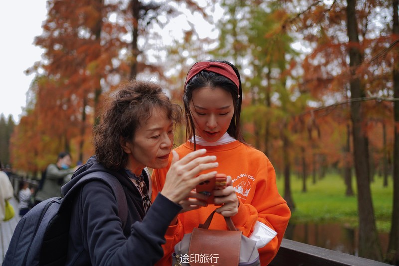 “水上森林”位于青西郊野公园生态保育区,面积达60多亩,以池杉等耐水湿树种为主,水林相间,鸥鹭翔集,形成了上海地区独有的景观。由于公园面积大,从停车场到景区检票口,大概步行40分钟就到了生态保育区大门口,青西郊野公园不用买门票,要看水上森林就在保育区门口当场扫码预约进入(保育区在公园深处,水上森林在保育区深处)。在历经长时间的车程➕等待后我们总算到达目的地。保育区里的步行道全都是木栈道,道路不宽,三个人并行走就有摩肩接踵的感觉了。去往水上森林的路上还有一长段路,路旁满满都是杉树,阳光透过秋日特有的红棕色杉树叶照在翠绿的草地上,有一种岁月静好的感觉。保育区指示牌还算清晰,顺着指示牌或者跟着人流走,都能到达水上森林。路过观鸟屋再笔直走转个弯就到了水上森林池杉区域。矗立在木栈道左右两边的杉树扎根湖底,树木高耸。看见这一大片水杉才觉得今天没有白等。木栈道两旁都能拍出不同风景。