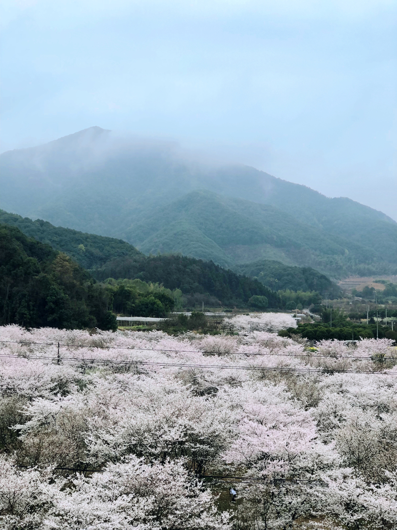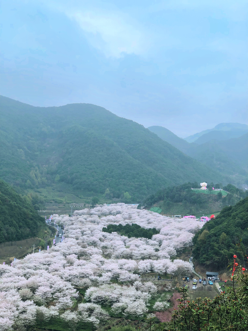 张村的樱花谷,大约六百亩樱花林,绵延于山谷中,每年樱花盛开时,美如人间天宫。樱花主要包括两种,分别是染井吉野樱和关山樱。染井吉野樱,花色白中带粉,通常称为白樱花,非常素雅,花期三月中下旬,属于早樱。关山樱,花色粉红色,通常称为红樱花,非常喜庆,花期四月上中旬,属于晚樱。早樱和晚樱相加,赏樱期长达一个月。我们此次行程主要是早樱为主。