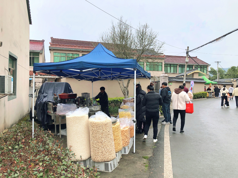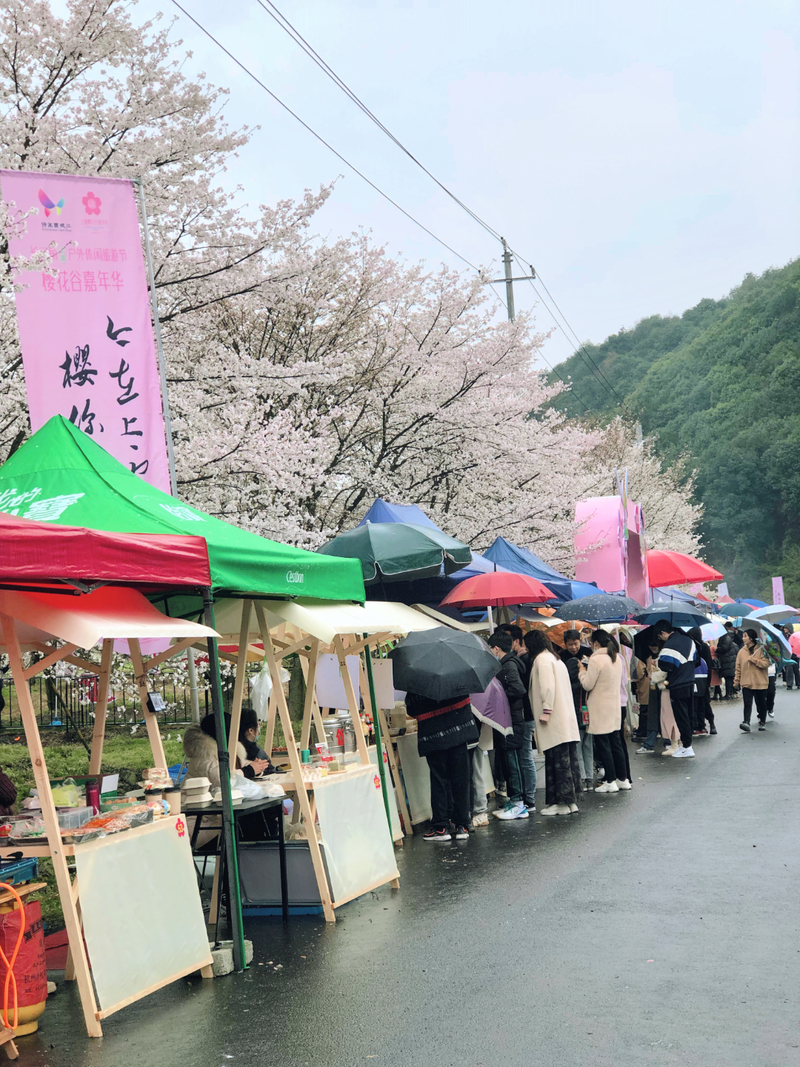 走到樱花林的深处,还有一段小吃街,小吃种类多种多样,如:竹筒奶茶、糖炒栗子、烤肠、臭豆腐,还有传统的爆米花......边逛边吃,美景和美食都有了。