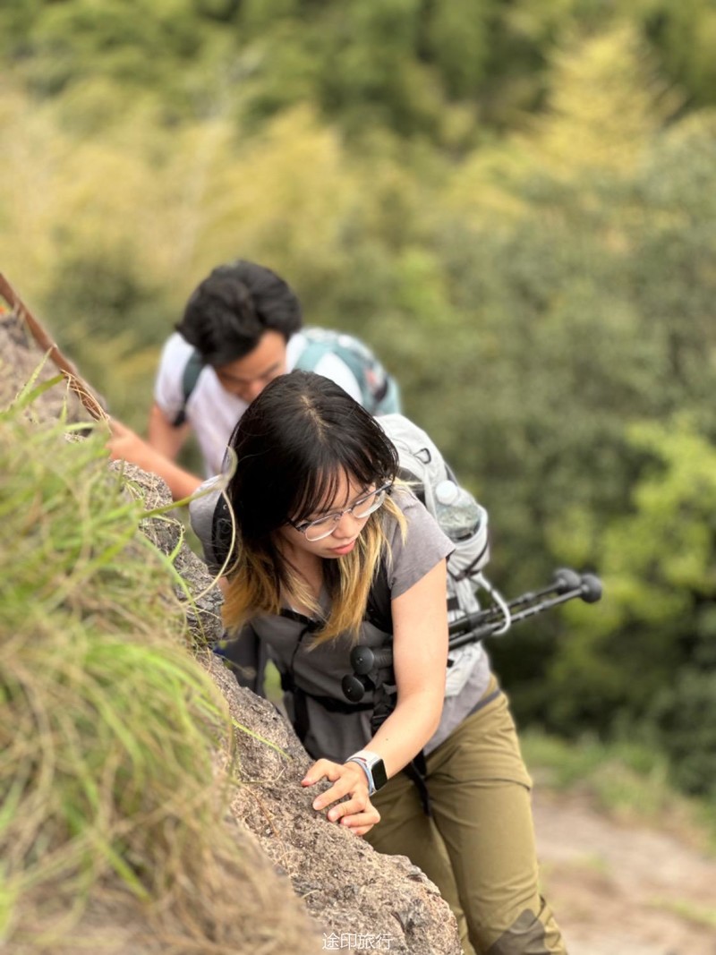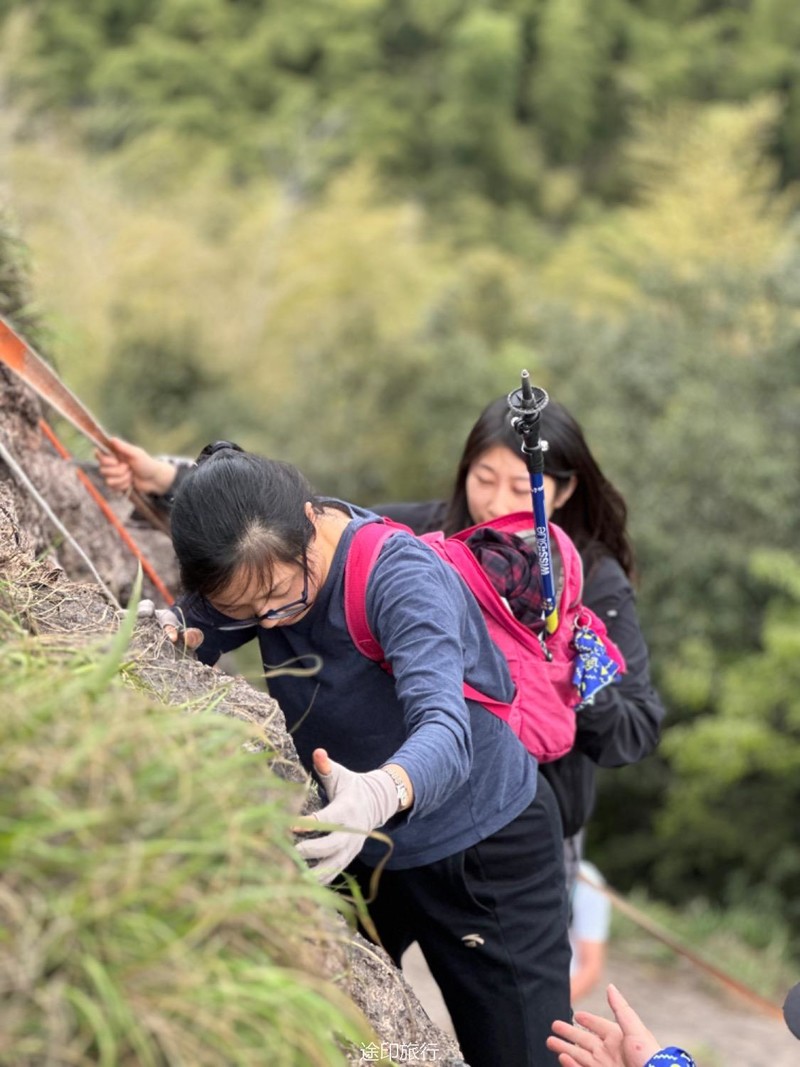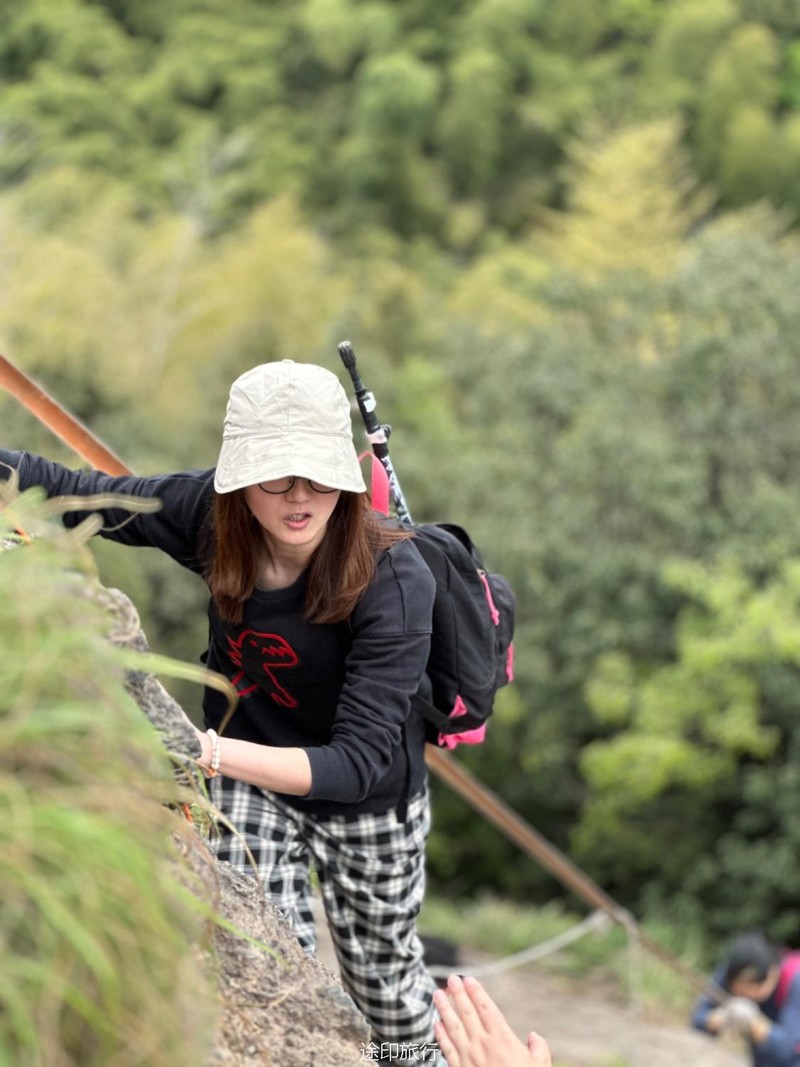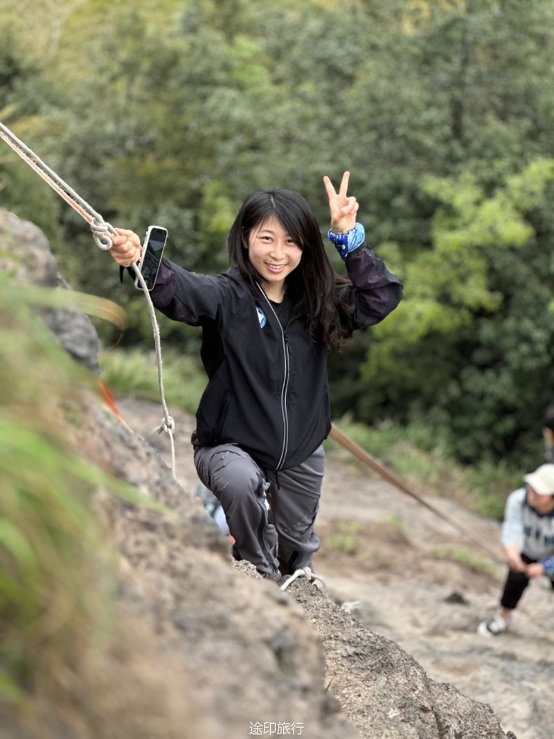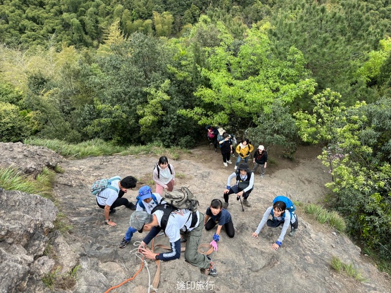 大巴送我们到了徒步起点,我们直接开始上山。走过一片竹林。便来到了石洞,石洞不是很高,需要弯腰,加上石洞出口又比较陡,所以这里还是需要小心的。接下来我们就到了一个平台,这里视野开阔,大家短暂休息。继续爬山。接下来就是下陡坡了。很多队员是新手,还好准备了绳子,方便了不少。
