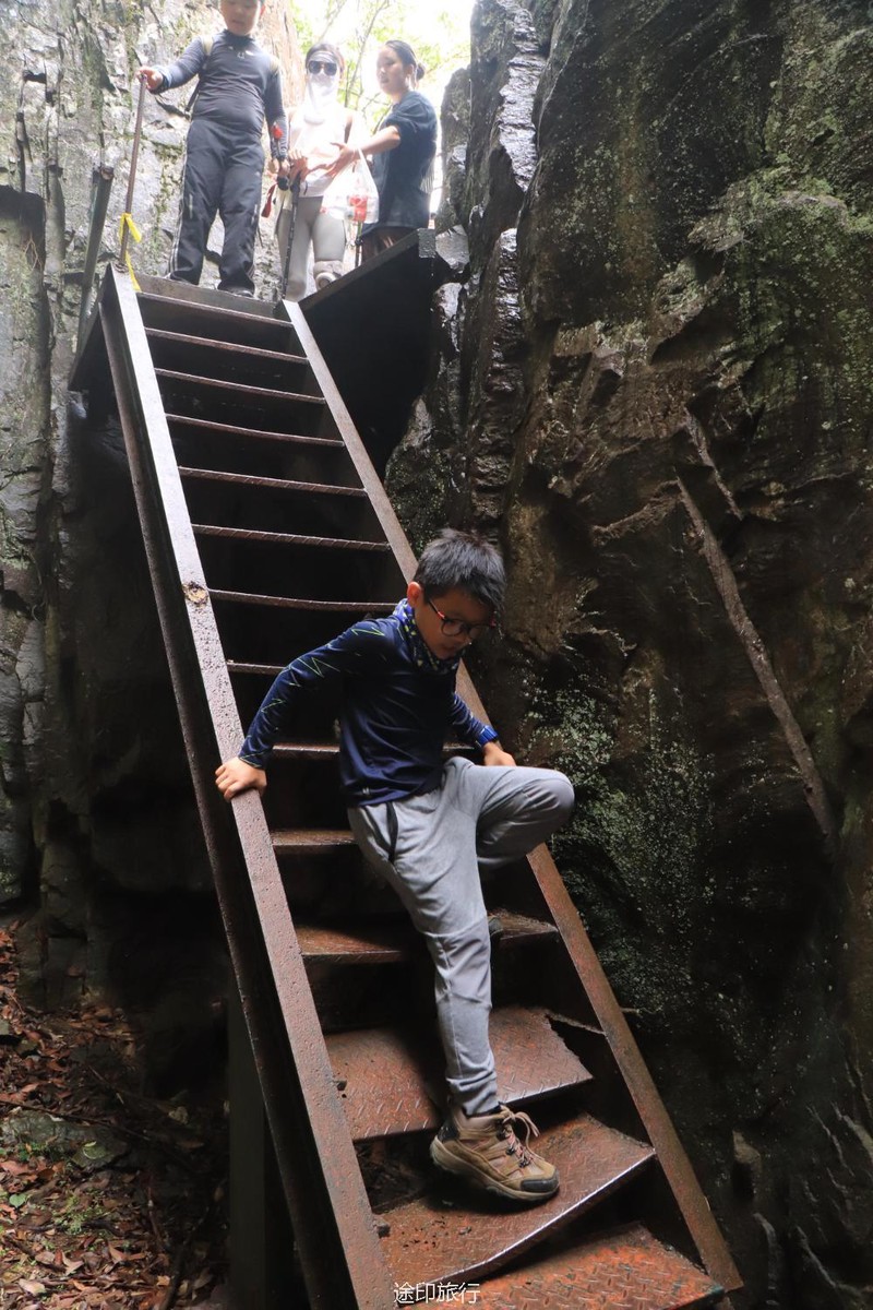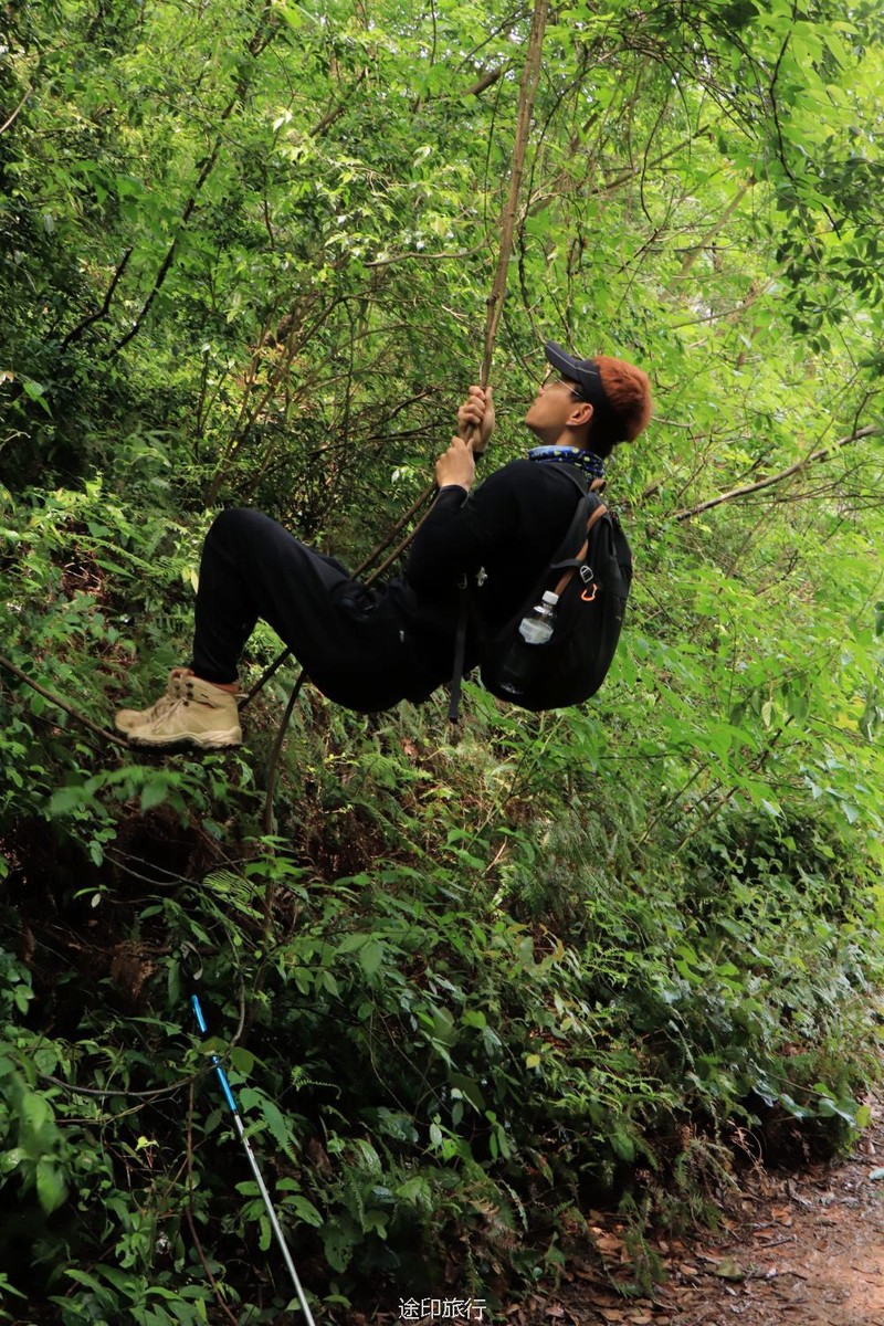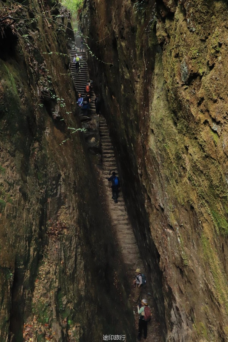 D2;飞鹰道,迷人又惊险,这是一条极具趣味性性和观赏性的徒步路线,虽然需要一定的勇气和技巧,但是它的风景绝对值得去挑战! 划岩山是一个荒废已久的景区,现在变为了徒步爱好者的天堂,也是恐高人群的噩梦,我们走的是比较经典的一条环线9KM,景区荒废多年无人维护所以原本修建好的铁楼梯已经有很多地方残缺,经过队员之间的互相帮助,大家都顺利通过。路途中的通天洞,是一条长约800米的陡峭石壁山洞,一路走上去消耗了不少的体力,完成通天洞的徒步之后,再往后就需要挑战飞鹰道了,这是一条位于划岩山顶的峭壁上的栈道,全长约1.5公里,沿途可以欣赏到壮丽的山景和瀑布,登上山顶,可以俯瞰整个黄岩市区,感受到壮阔的自然风光