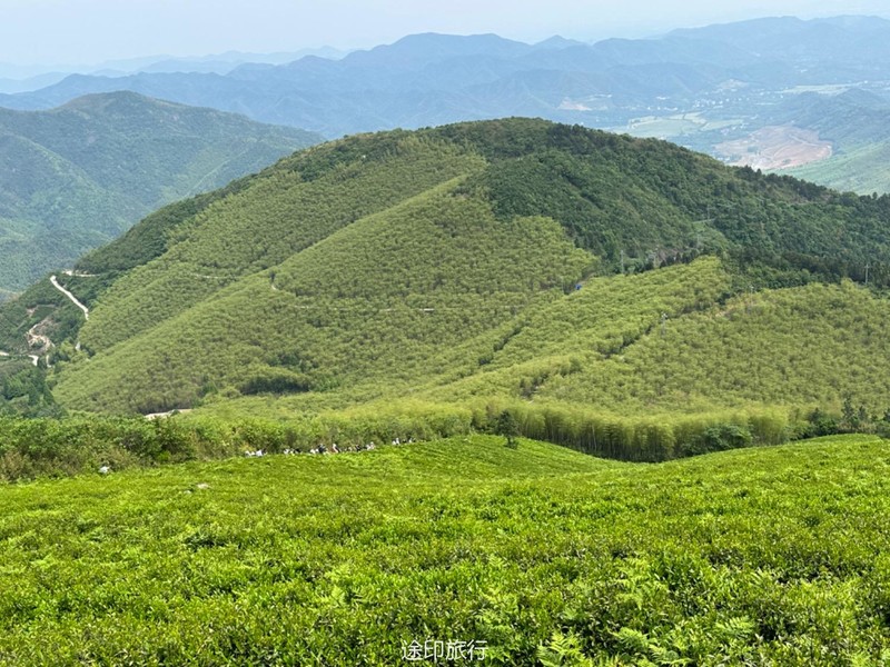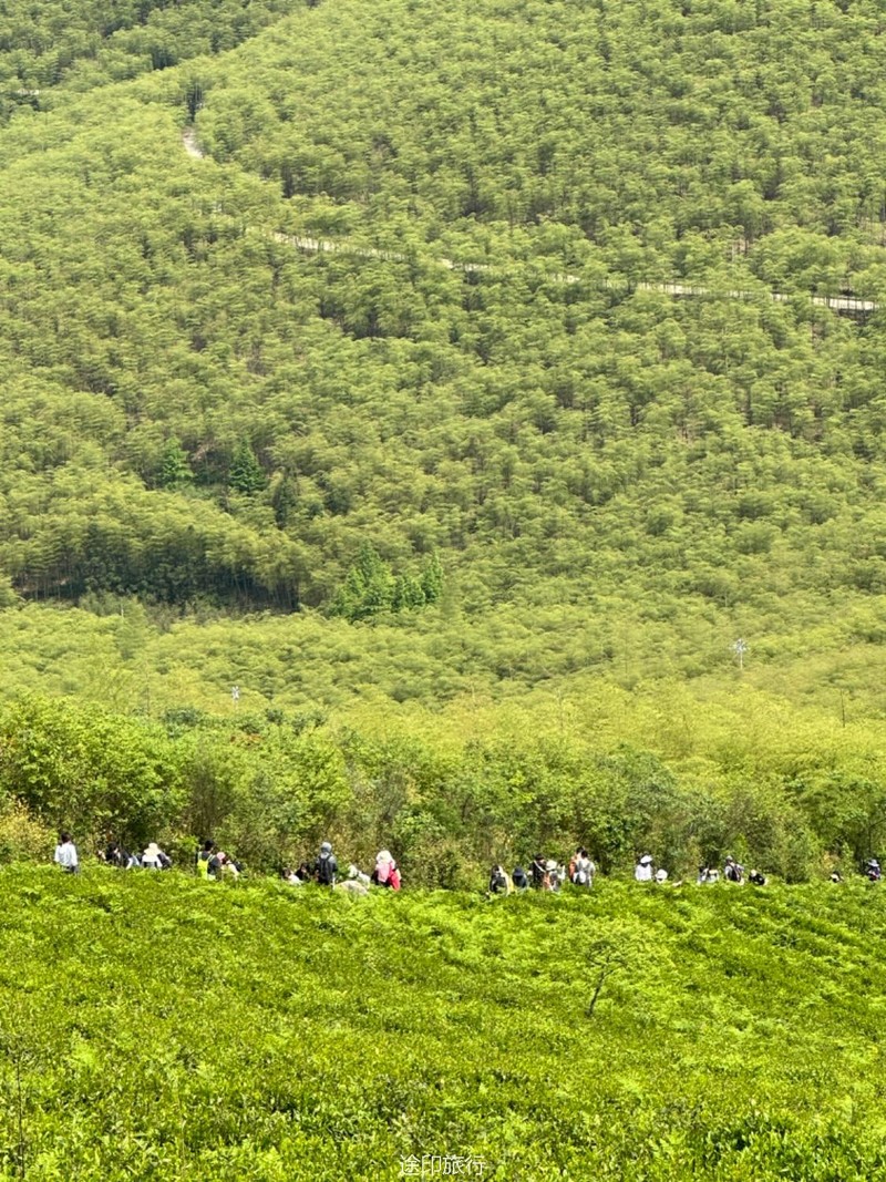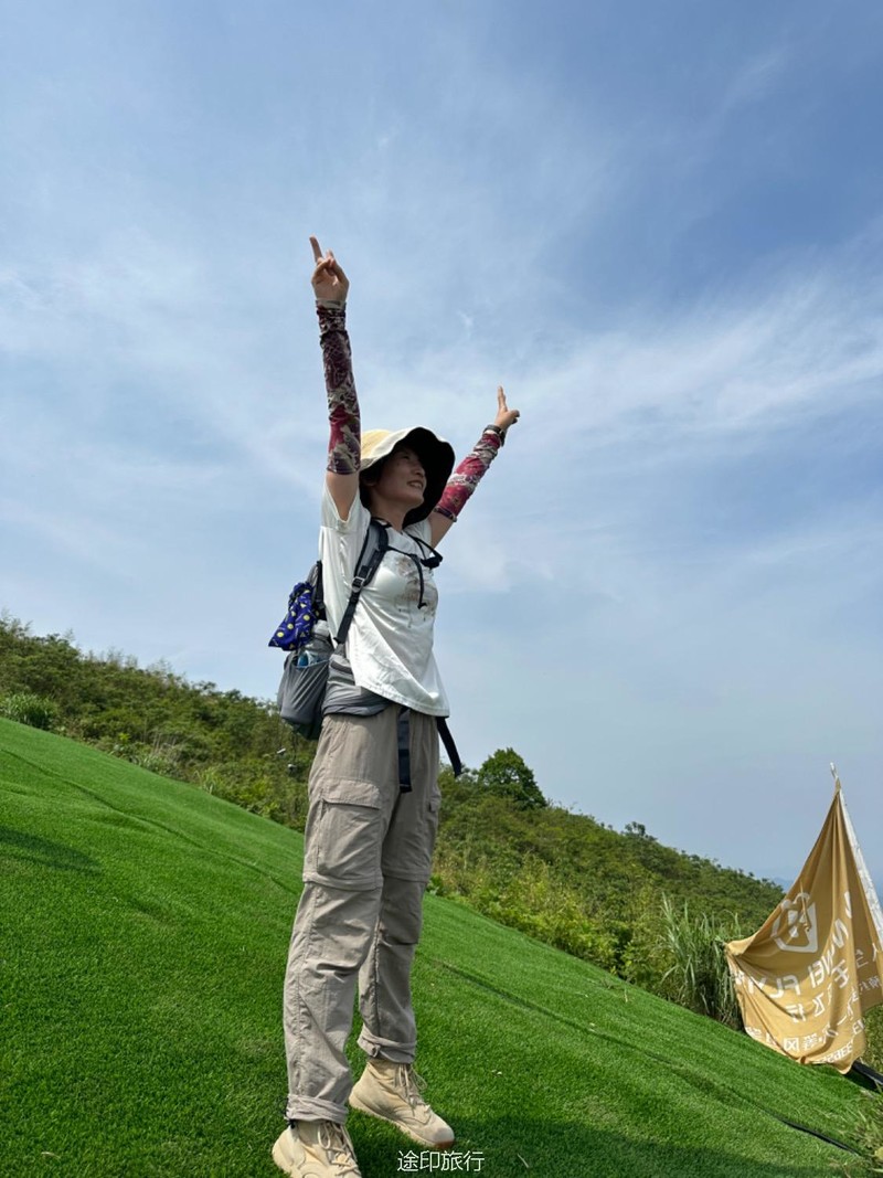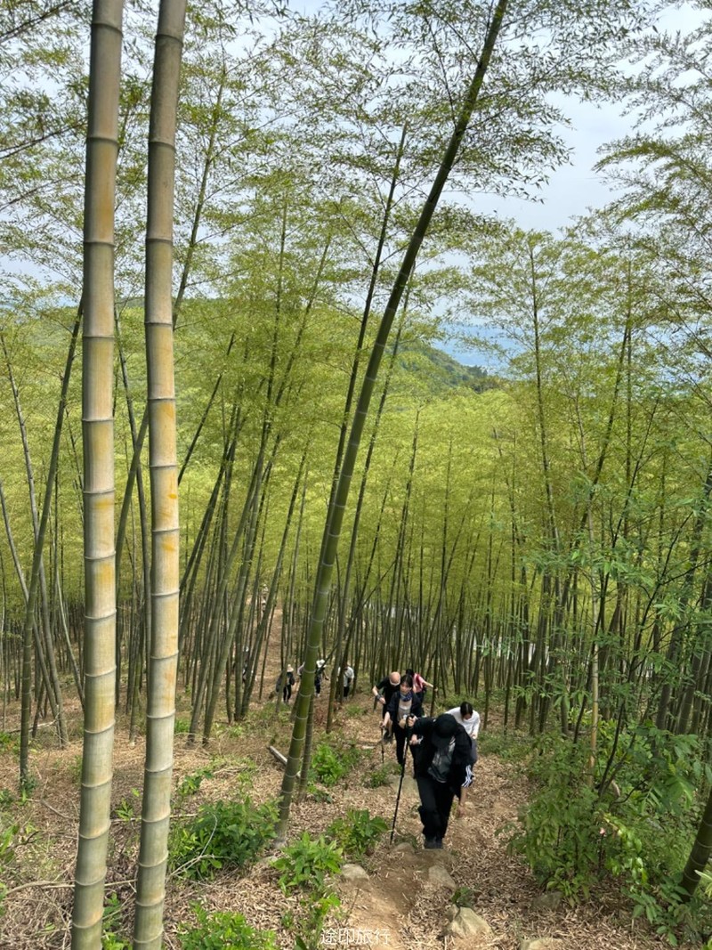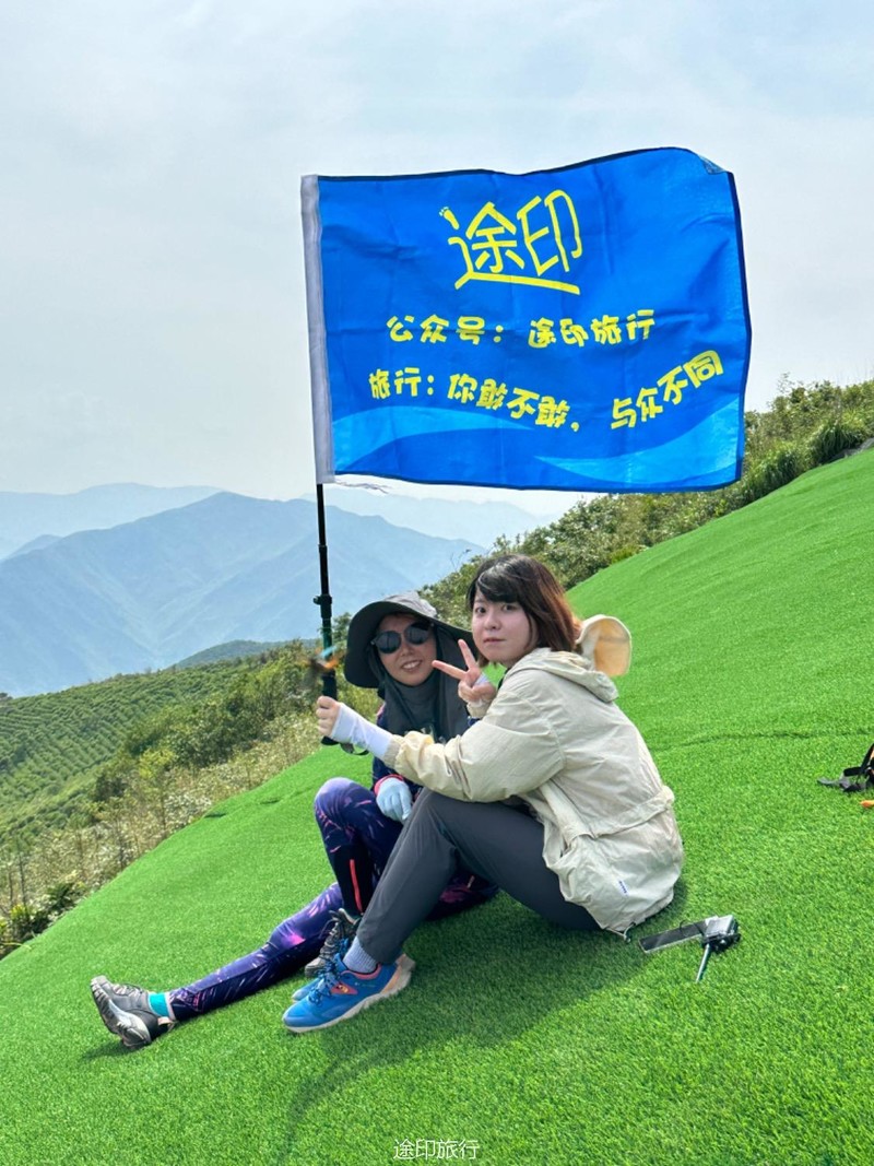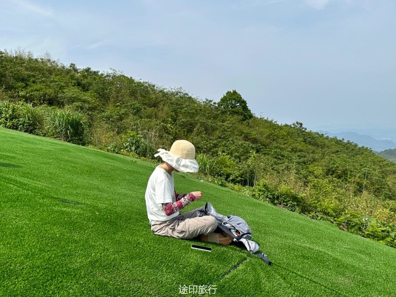 继续爬升,我们先是沿着公路,来到一片竹林和茶园,这是最后的冲顶阶段了,不得不说,还是有点累的,大家顺利地到了山顶,这里铺了人工草皮。拍照打卡!