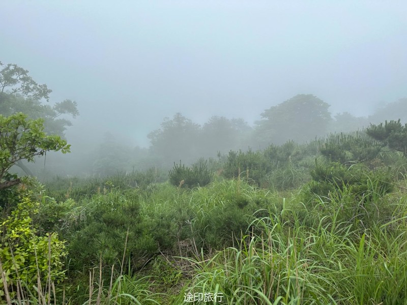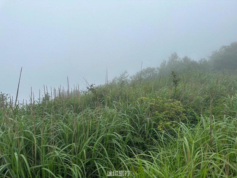 我们先是大巴开到了上车门村,天气不是很好,有很大的雾,开始爬山,在前面开路的有点惨,因为路线很窄,两边的树木全是露水,所以衣服都湿了。经历了1小时的努力爬升,我们到了第一个山顶:炮台岗烽火台,烽火台的痕迹还在,我们就在背风处解决了午饭。然后继续往最高峰,大岙脑出发,炮台岗烽火台到大岙脑这一段,全长大概2公里,两边是草甸,最像武功山。当然规模肯定是无法与武功山相比了。因为天气原因,山上全是雾,但也别有一番乐趣。至少,不用在太阳底下烤了。大家心情也没受到影响。
