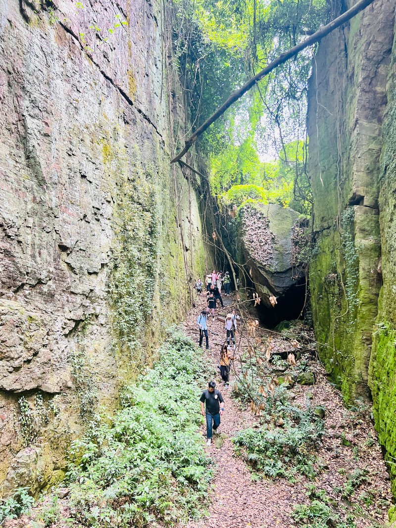 两面高百余米的巨大悬岩峭壁夹成的一段峡谷,峡谷根据峭壁的走势分为两段,顺着崖壁走完第一段峡谷,一个转身便能乘势进入另一段,每段约100多米长,峡谷宽度不一,最宽处4.5米左右,而最窄处仅能容纳一人勉强通过。