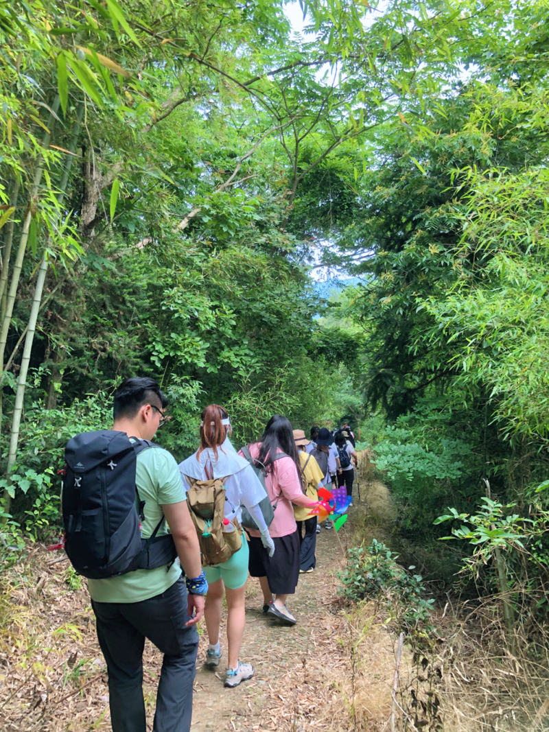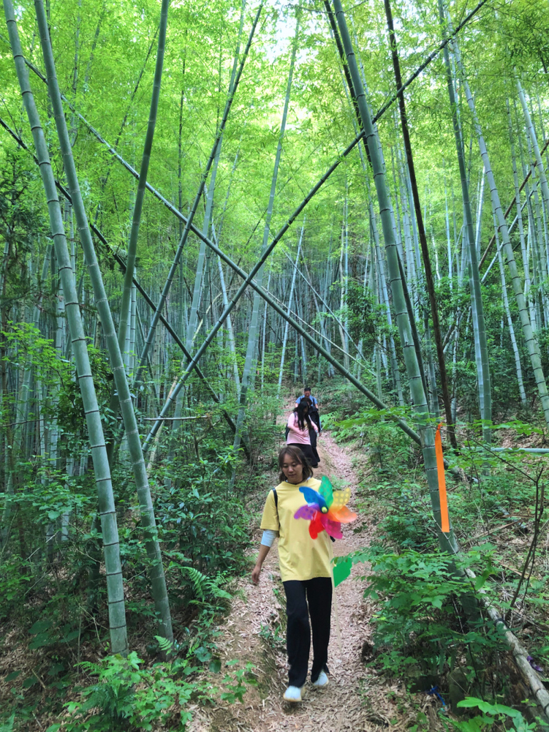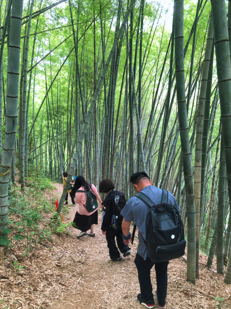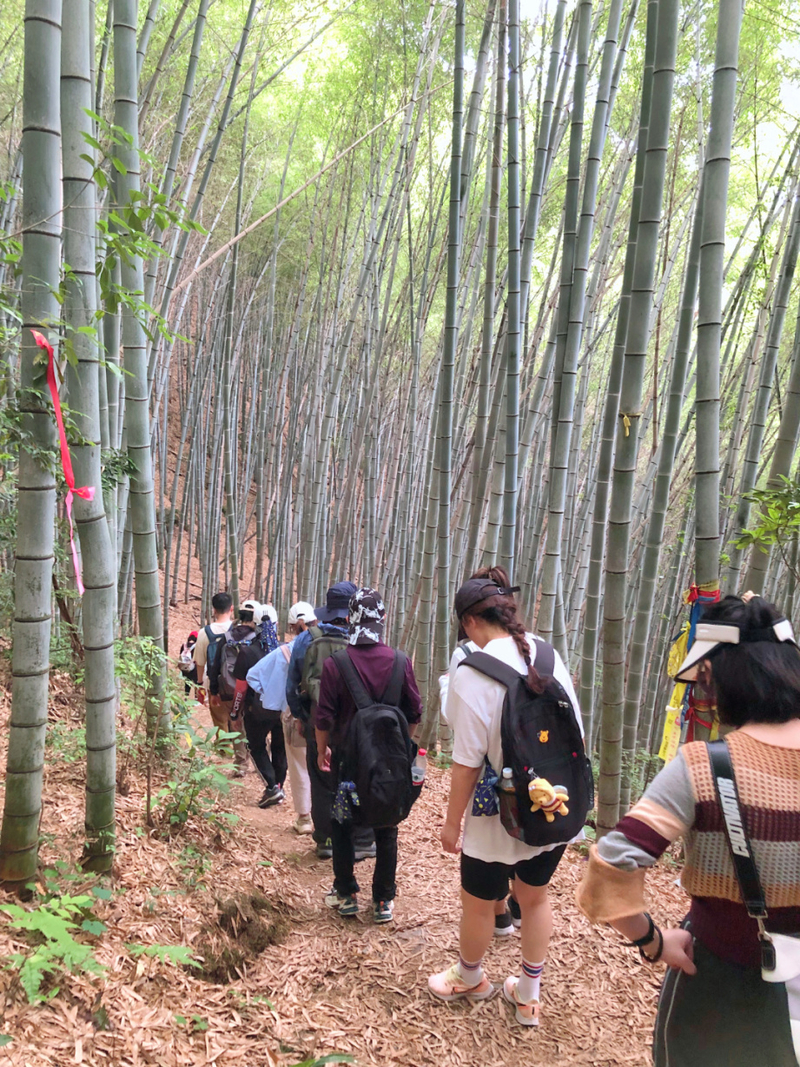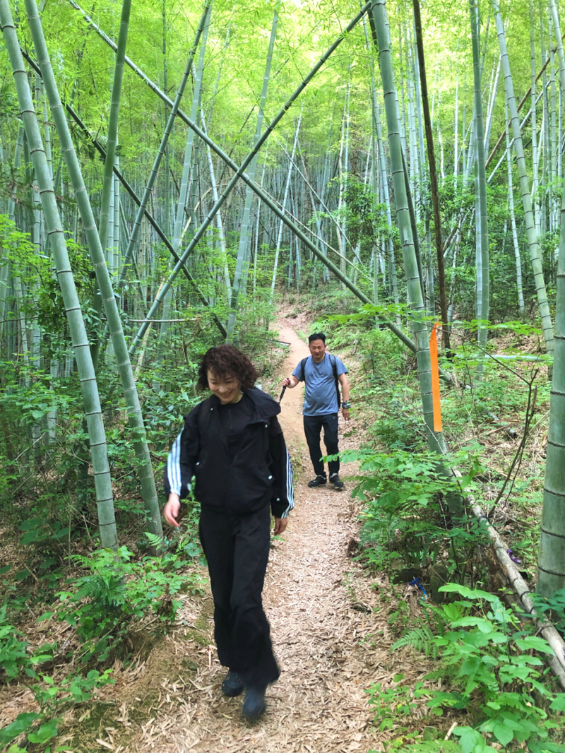 下山的路段主要是穿越竹林,山路上不满了更新新叶的脱落竹叶,踩在脚底有些滑,专心走路就不会滑到,就算部分路段稍微坡度有些大,在你我需要的时候,大家相互帮助拉一把,加油鼓励,走走就到了山脚下的村子。
