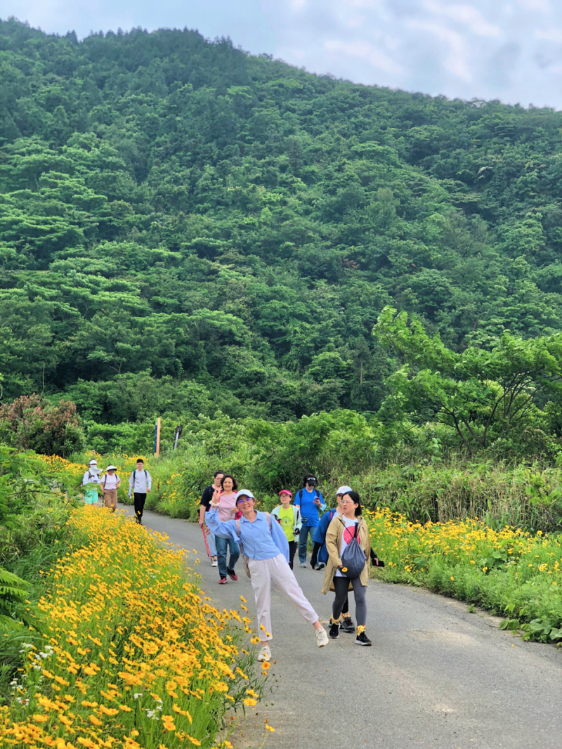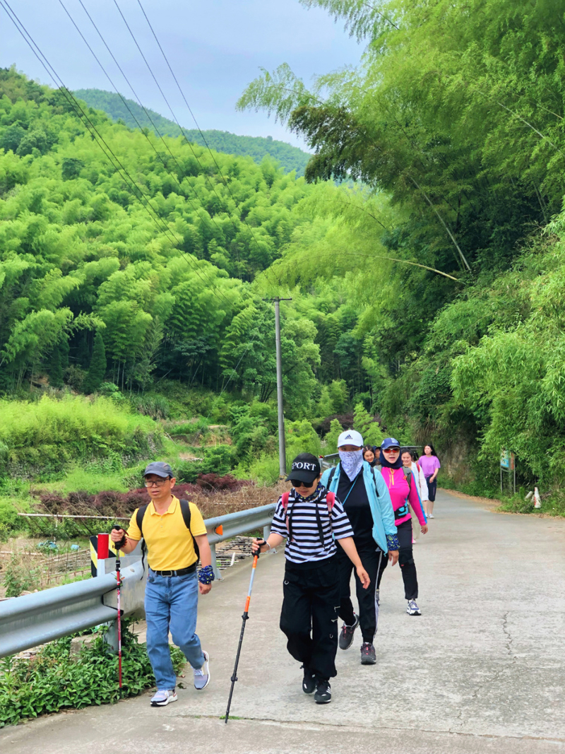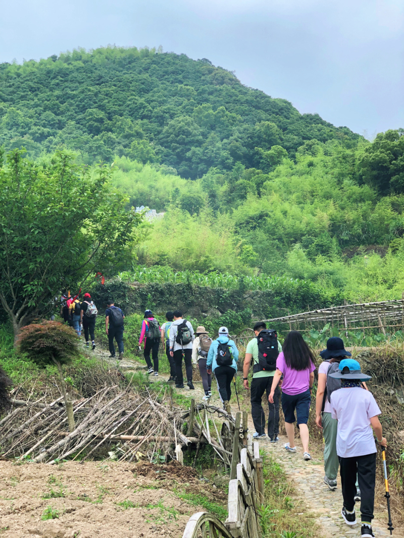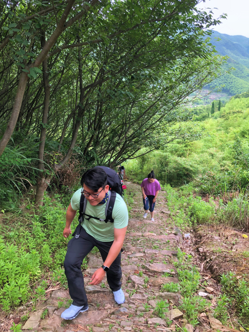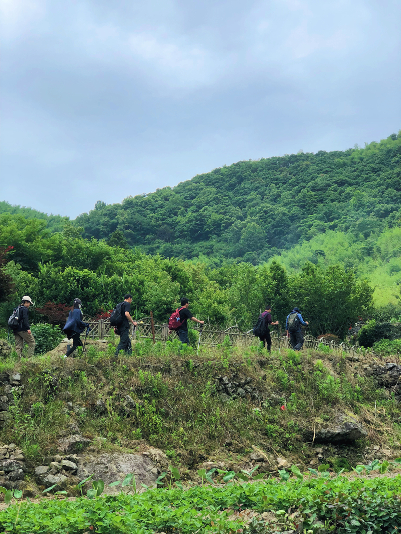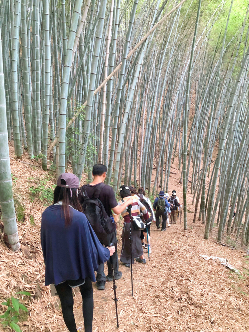 下山的路段主要是穿越竹林,山路上不满了更新新叶的脱落竹叶,踩在脚底有些滑,专心走路就不会滑到,就算部分路段稍微坡度有些大,在你我需要的时候,大家相互帮助拉一把,加油鼓励,走走就到了山脚下的村子。
