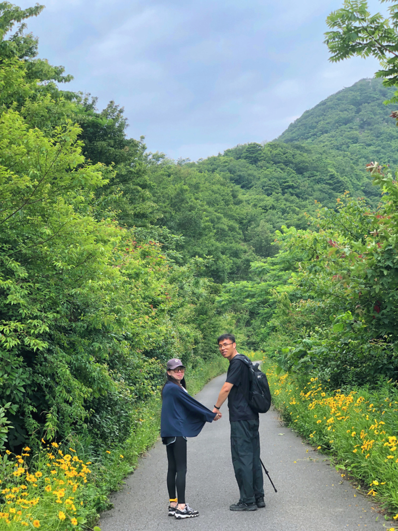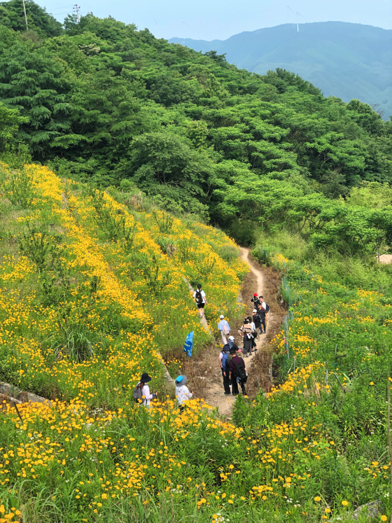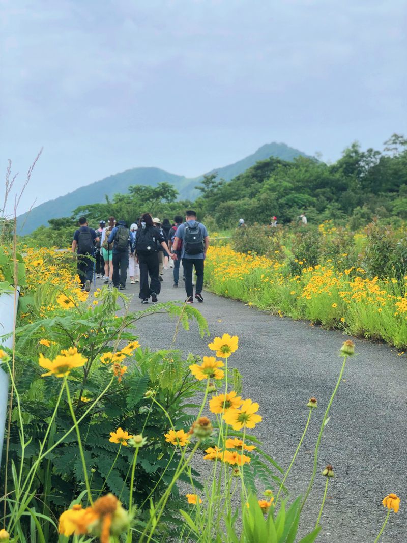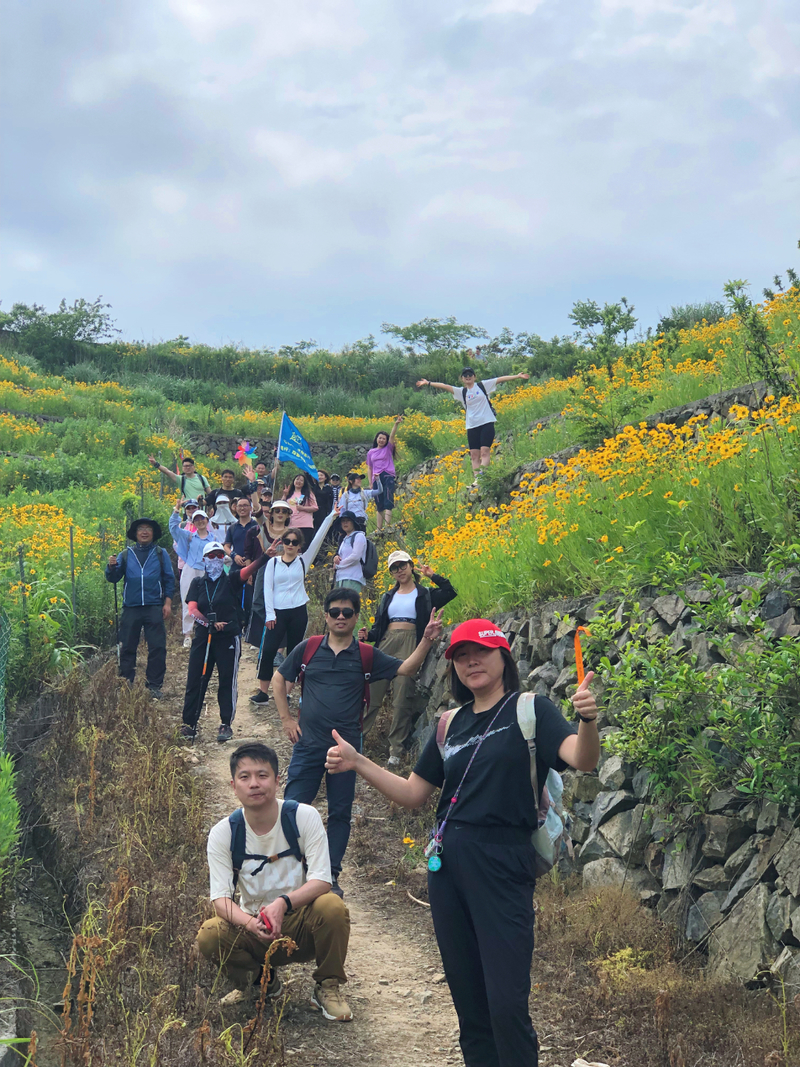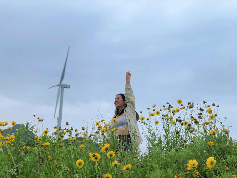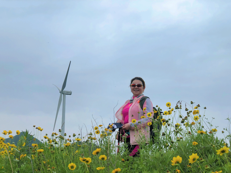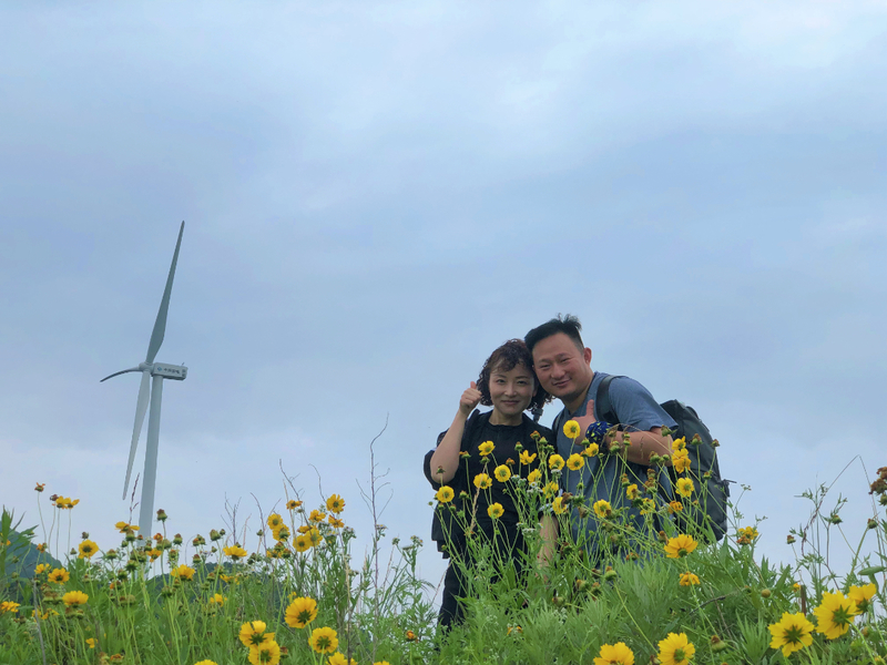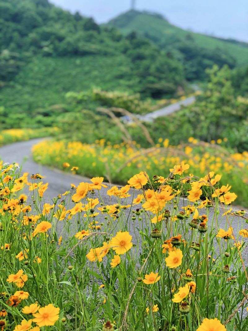 路餐后,我们开始风车公路部分的徒步,这段路全程走花路,公路两边开满了黄色的金鸡菊,随处望去,欣赏远山风车。这段路程大可放慢脚步,给自己预留时间,不管是拍照还是赏景都可以满足,看到大片金鸡菊更是可以走近欣赏,收获都是自己的。