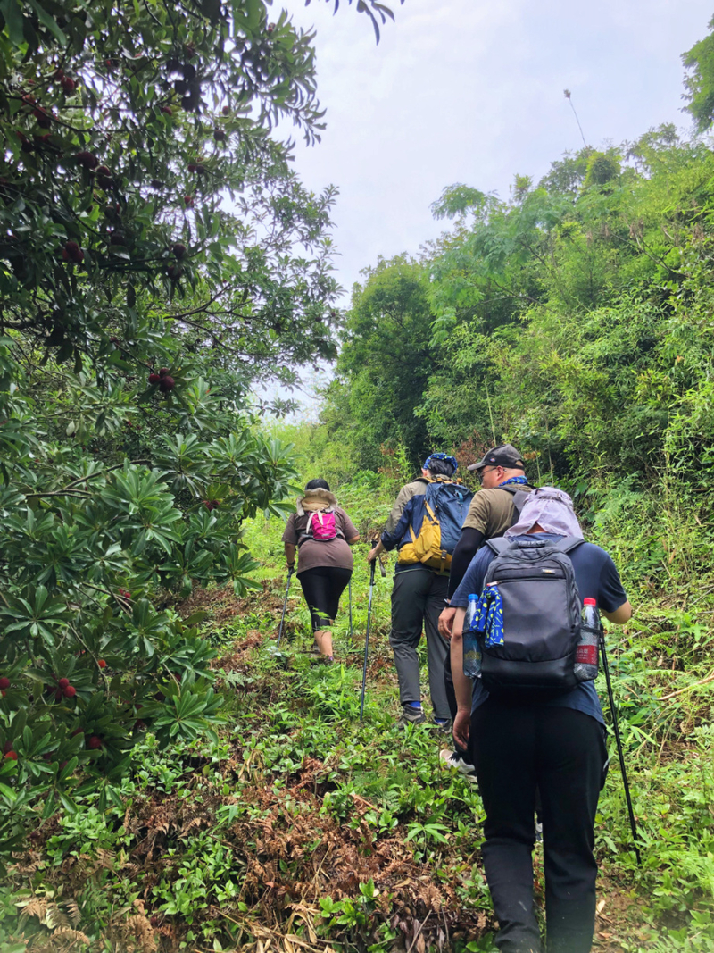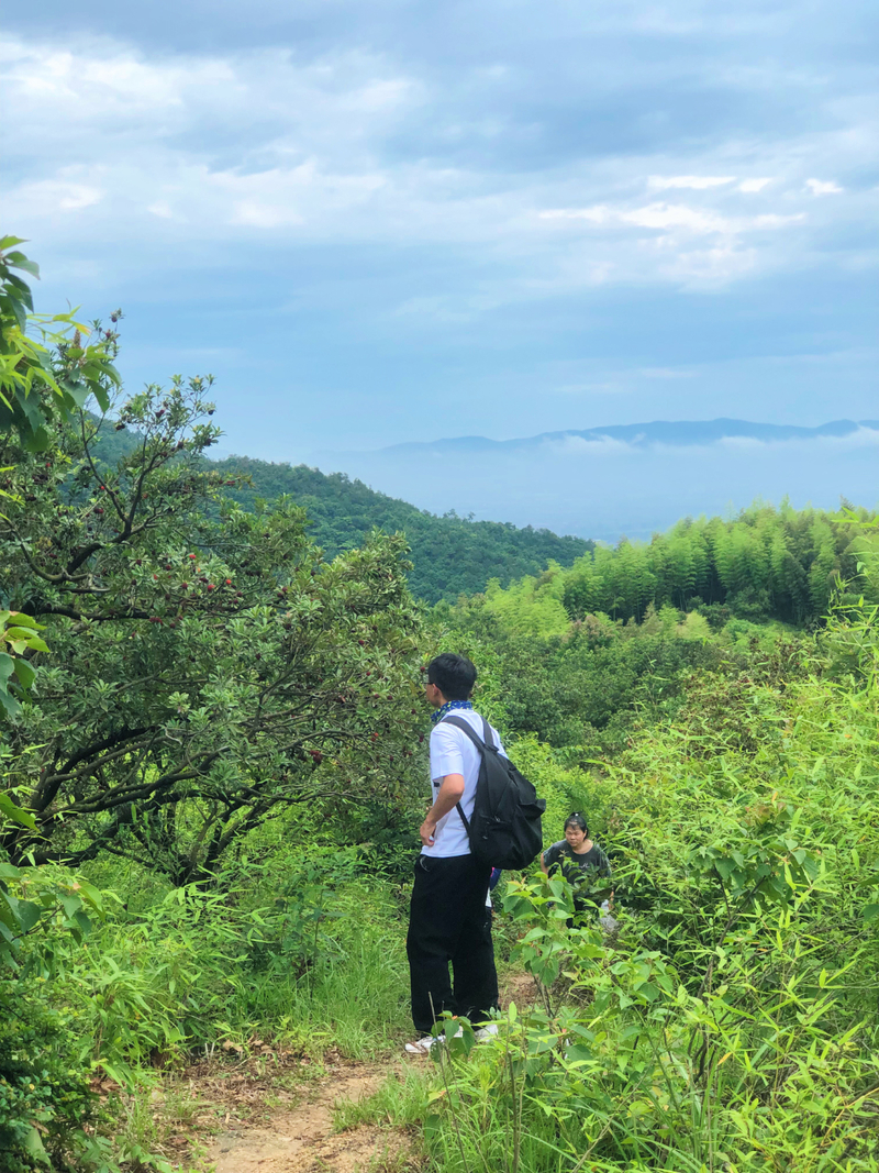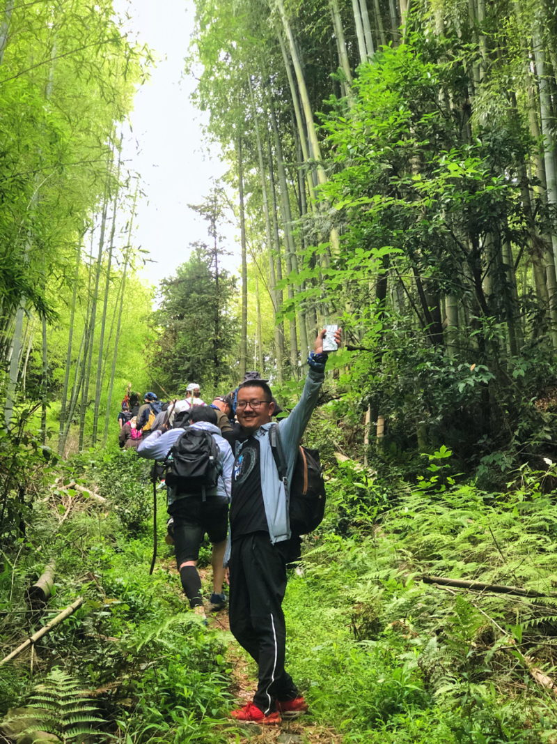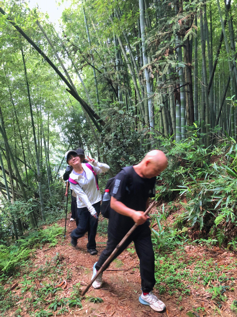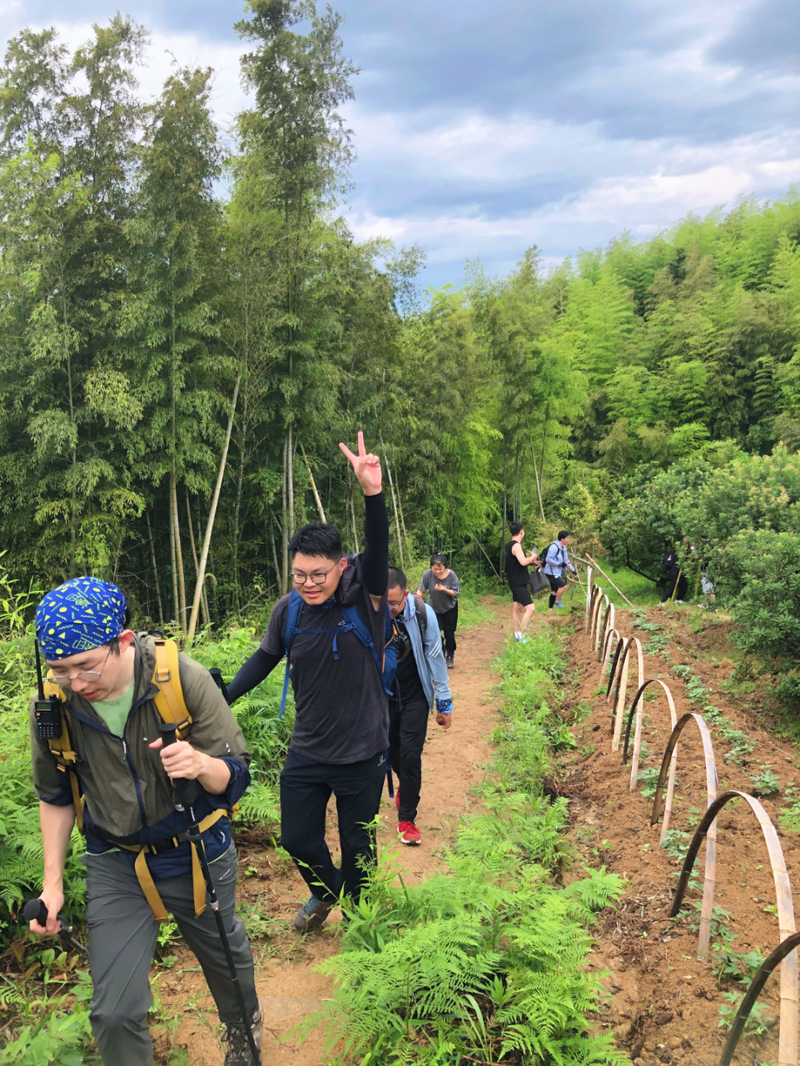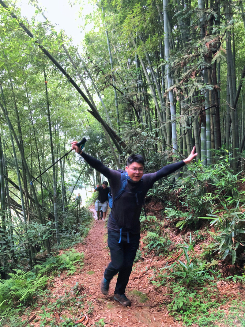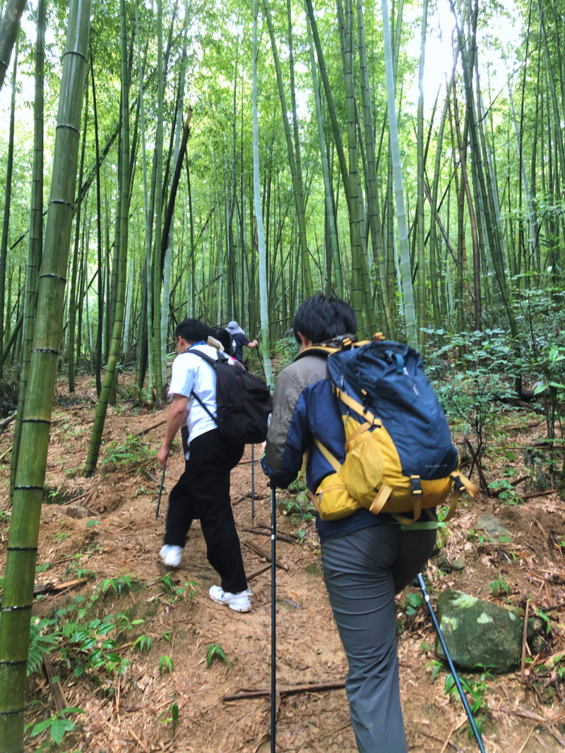路过杨梅林后,大家稍作休息吃今天的路餐,过程中大家相互分享。后面的一段徒步以丛林、竹林为主。由于走的人比较少,其中两段路比较野,小路两次全是茂密的小竹林,需要手臂遮挡住脸来开路,穿长轴长裤的衣服就很有必要。