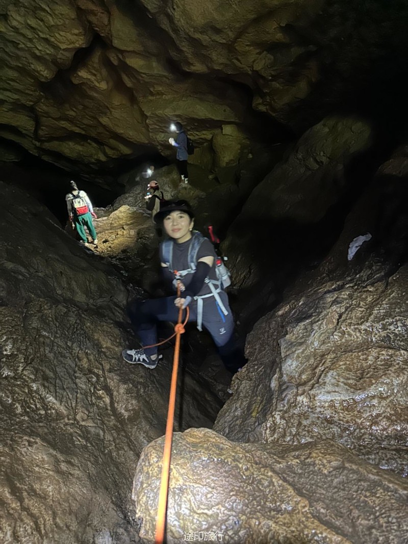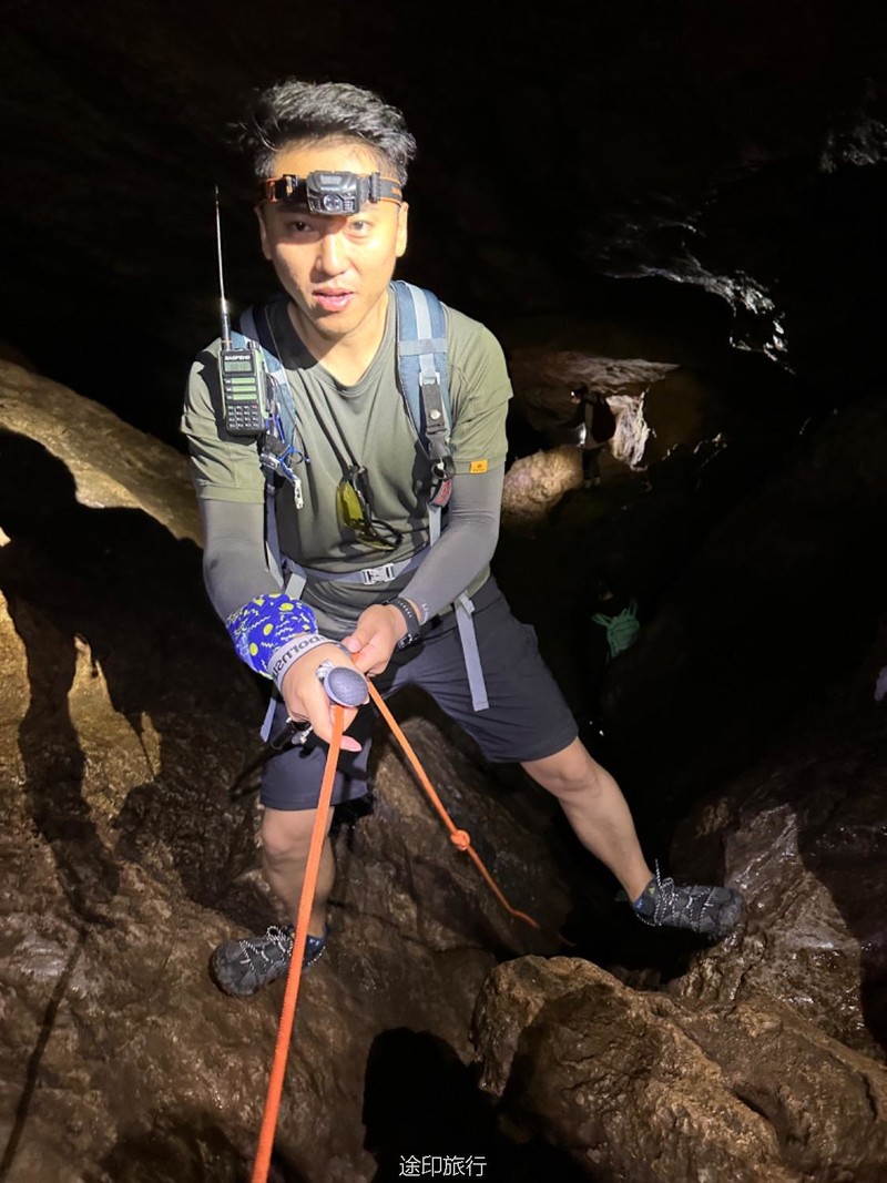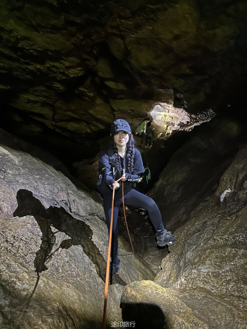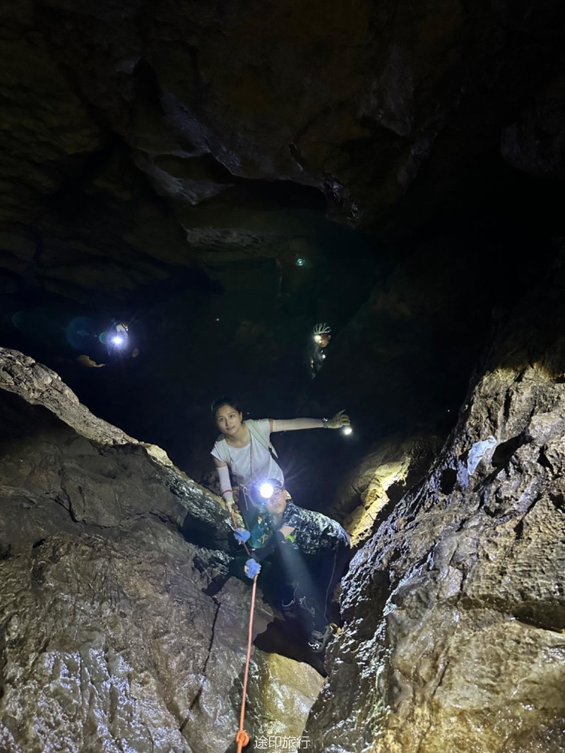 往洞里进发。第一层因为有滴水和渗水,所以比较潮湿,土也比较松软,要小心滑倒。第二层和第二层的石头斜坡也是比较湿滑,身手敏捷的可以直接下去,当然我们也搭了绳子,不太熟练的可以借助绳子往到第二层,第二层很平坦,很快就到了第三层,这里有一个很大的斜坡,大概二三十米高,旁边有一根绳子,借助绳子有探险的大家继续下到了第三层,第三层就得小心了,这里怪石嶙峋。走起来也要小心,有些地方要跳着跨越过去。这里还有一个打卡点。这次很多队员在里面玩得太嗨,导致都忘了时间,最后还是喊出来得,在华东地区,这样的门槛低的探险可不多见。