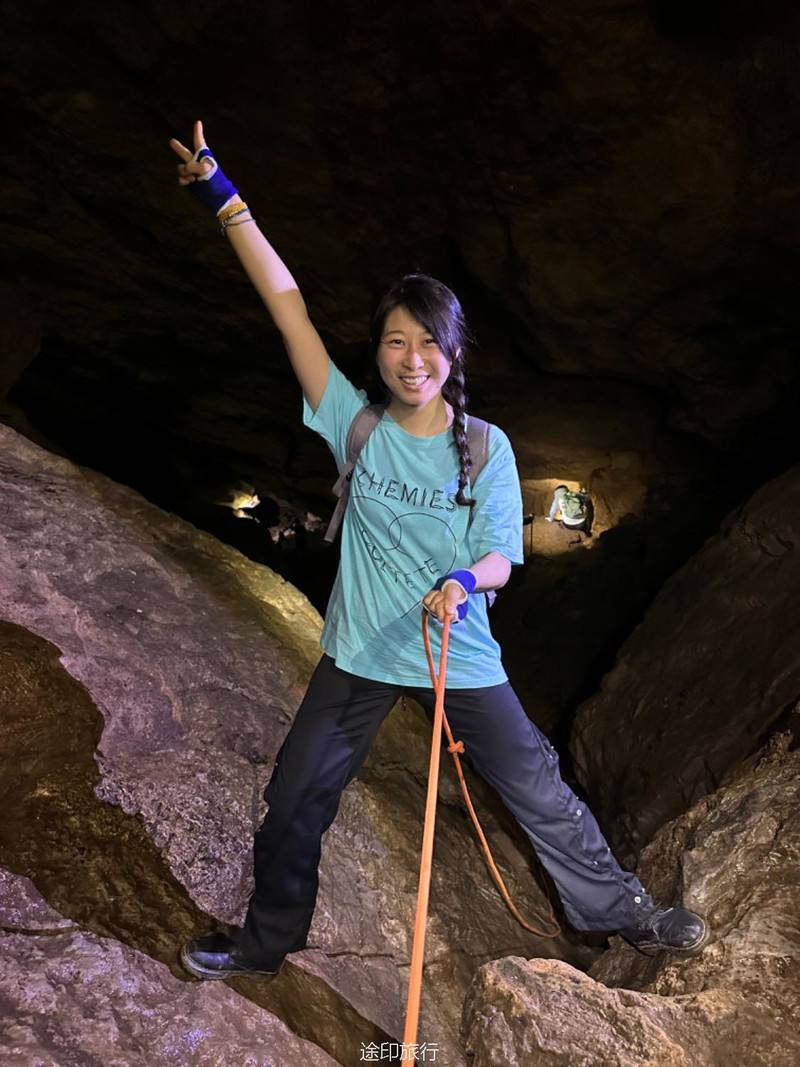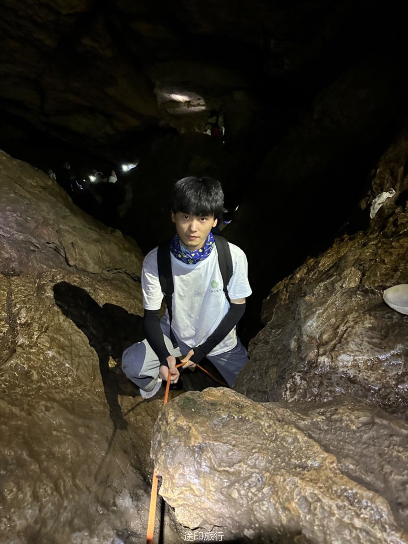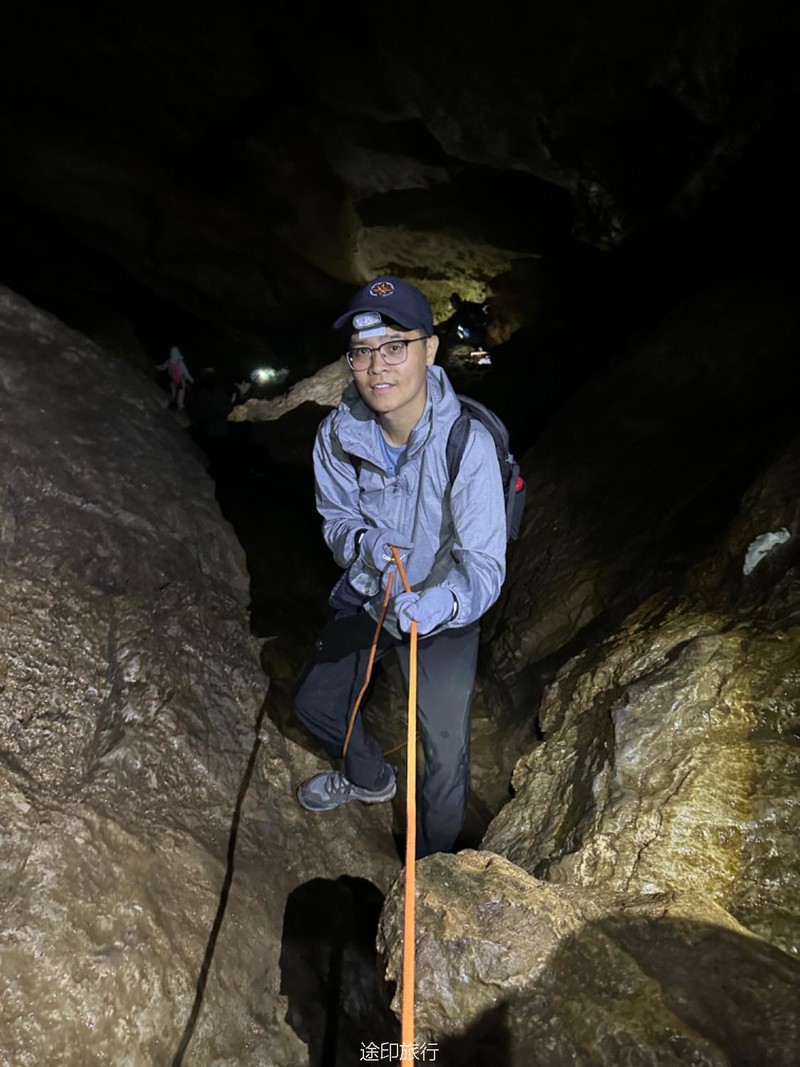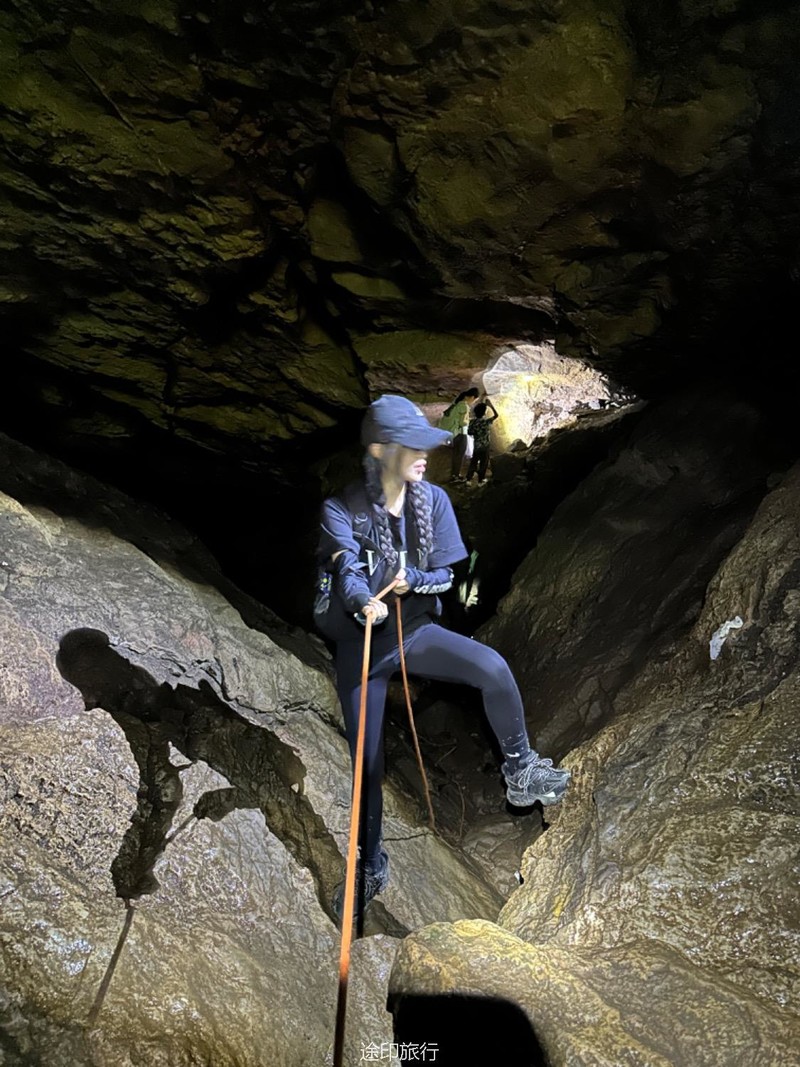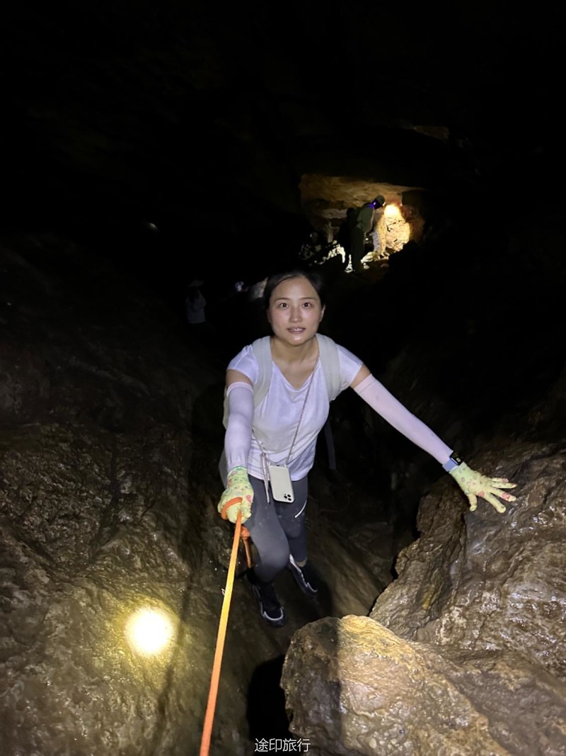 往洞里进发。第一层因为有滴水和渗水,所以比较潮湿,土也比较松软,要小心滑倒。第二层和第二层的石头斜坡也是比较湿滑,身手敏捷的可以直接下去,当然我们也搭了绳子,不太熟练的可以借助绳子往到第二层,第二层很平坦,很快就到了第三层,这里有一个很大的斜坡,大概二三十米高,旁边有一根绳子,借助绳子有探险的大家继续下到了第三层,第三层就得小心了,这里怪石嶙峋。走起来也要小心,有些地方要跳着跨越过去。这里还有一个打卡点。这次很多队员在里面玩得太嗨,导致都忘了时间,最后还是喊出来得,在华东地区,这样的门槛低的探险可不多见。