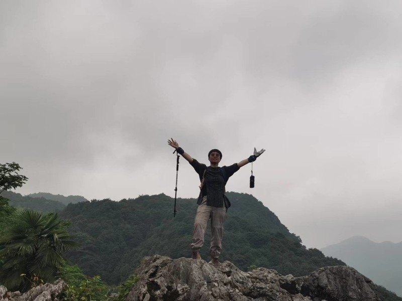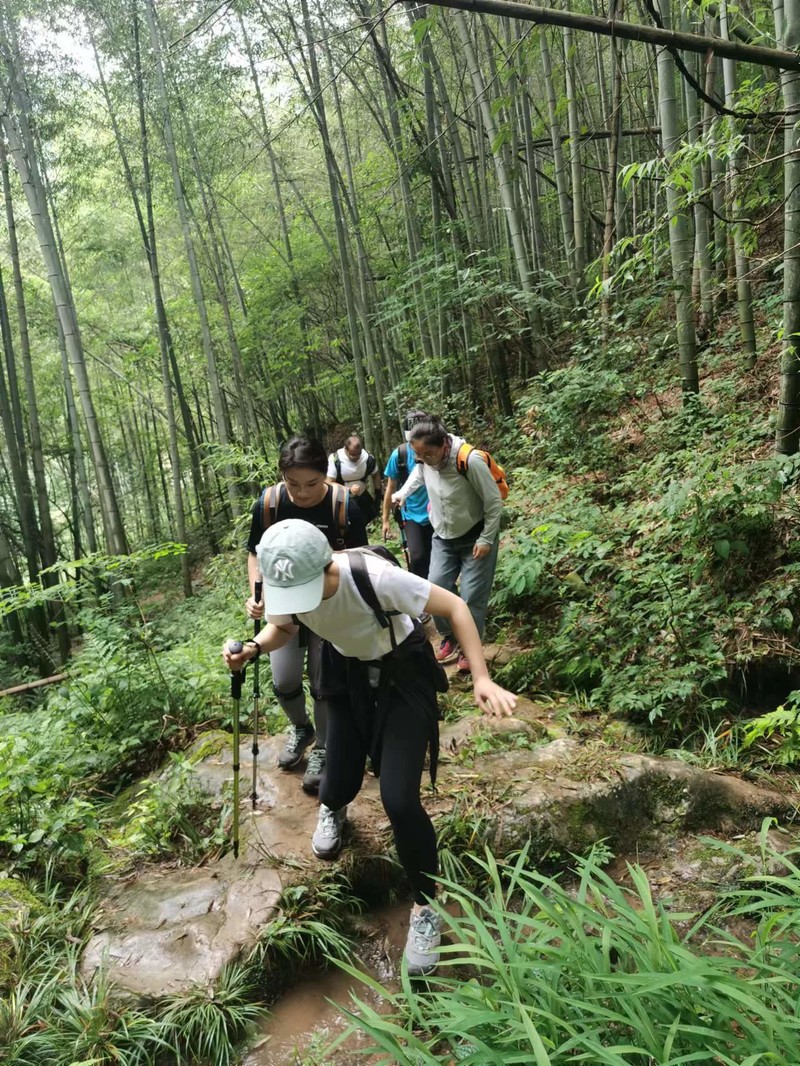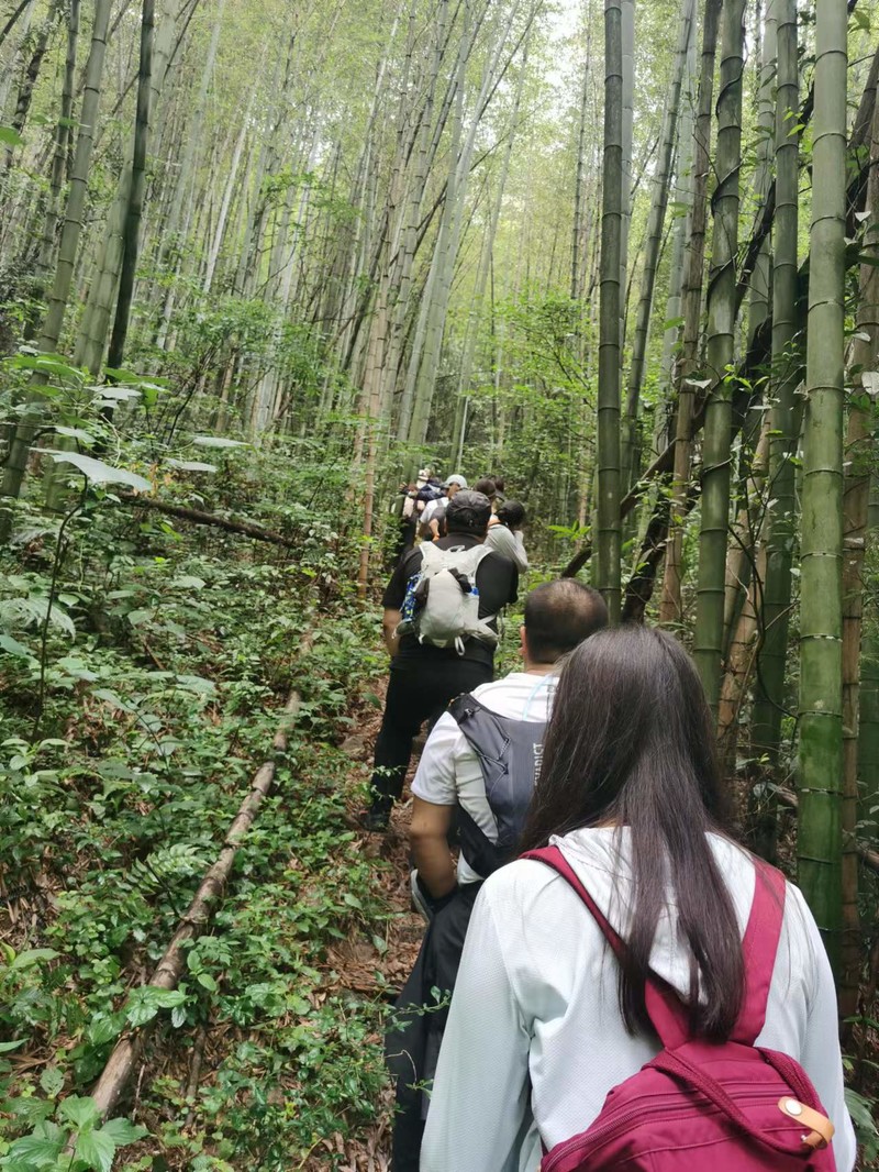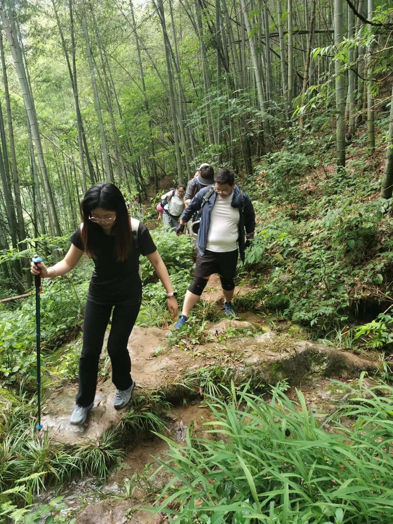 雨后山里空气清新,脚踏泥巴、泥土、砂石、树叶、树枝、枯叶,闻着道路两旁青草与树木的清香,大自然的味道,沿着砂石混合的山路,经过小段公路、小溪、石子路竹林、水库快速爬升,队伍中领队吊着嗓子大声喊,大家慢点,雨后山路滑,小心点不要摔倒,安全第一…………没人搭理,好吧,继续冲冲冲,走着走着,大约半小时后,突然一个声音,领队领队,说,什么事,我老婆呢,我老婆不见呢,奶奶的,你还知道你不是一个人来的,她队伍最后呢,她走不动呢,已安排帅哥拉着她走了,你继续冲,快继续往前冲……,不了不了,我在原地等,兄弟那你负责押队,走在最后一个,有没有问题,好的好的,好欢乐的逗比,继续走啊走,约莫一个小时到达石头奇石林,太漂亮了,我们要拍照拍照,好的原地休息,拍照,登上奇石山林的最高峰,也是本次行程最大爬升高度,俯看山林,这是典型的南方山脉,海拔虽不高,有着各色植被,雨后山林仙气环绕,风景绝了,这时张开双臂和大自然来个深情拥抱、手持登山杖,“杖尖”指向天空,高喊我们“杖尖”走天涯……