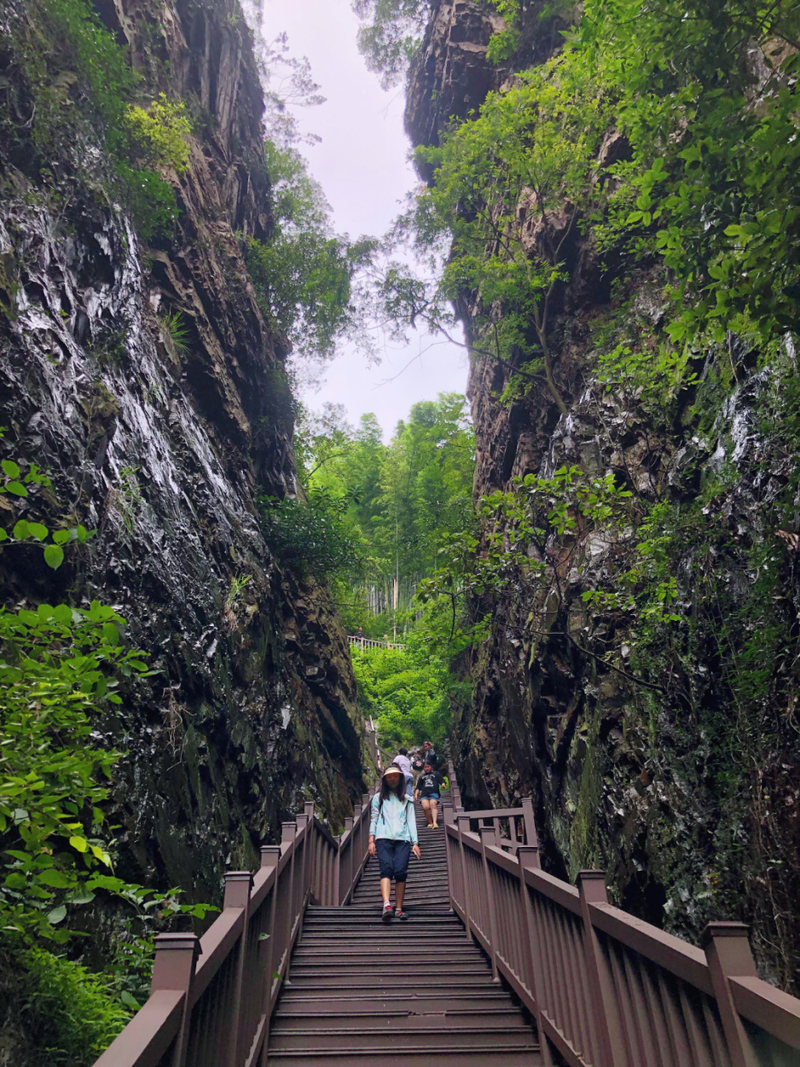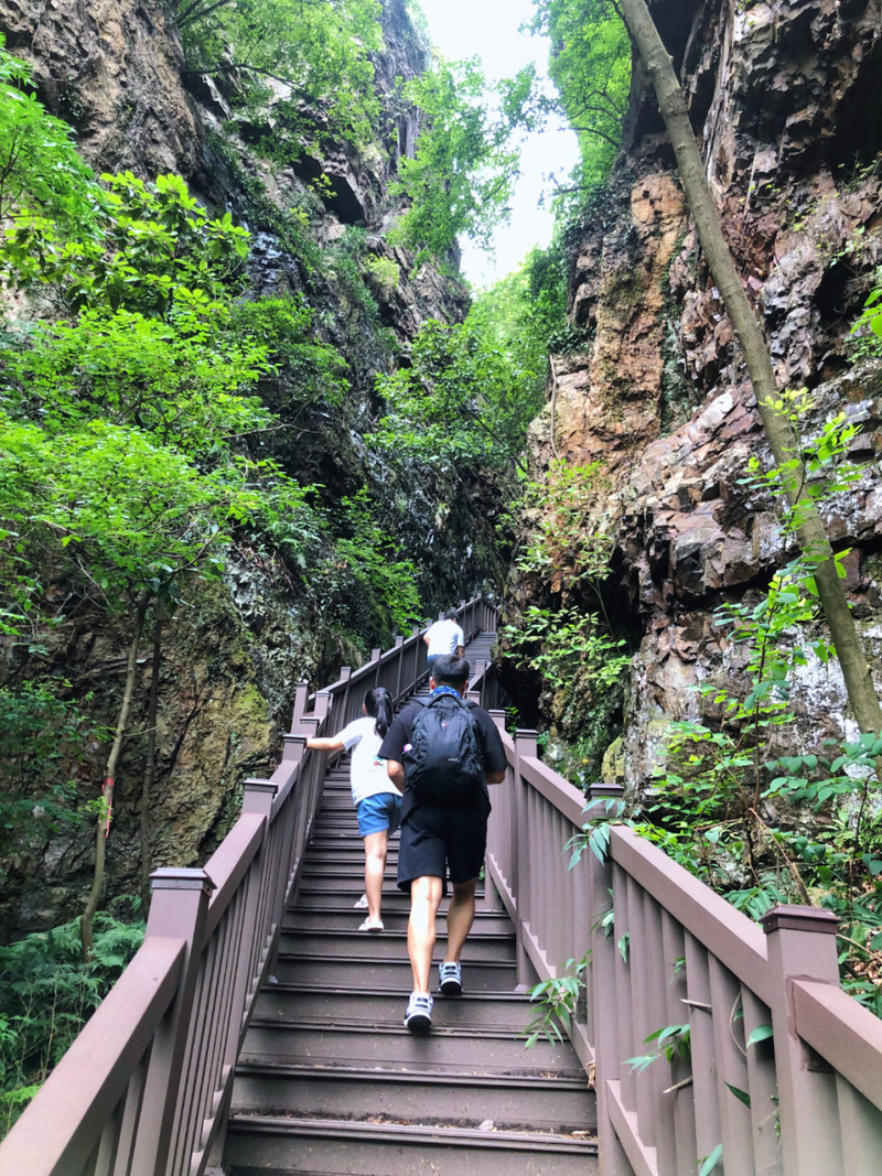 我们接着往上走,从遇到岔路口,我们从左边木栈道往上走,不一会就爬到山顶,在这里俯瞰一线天,很壮观~