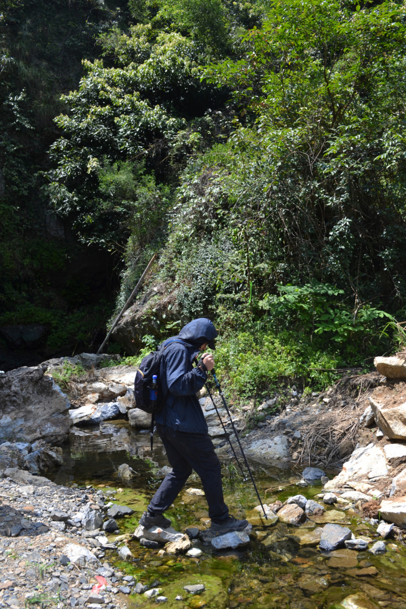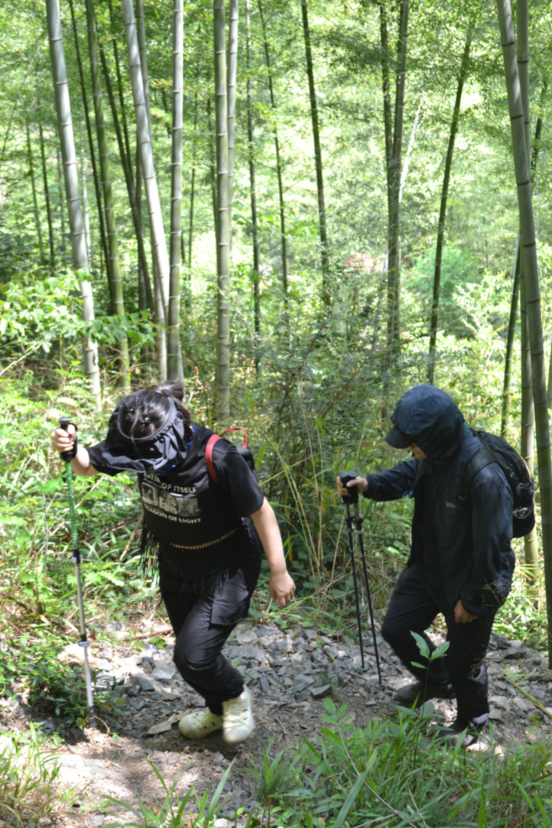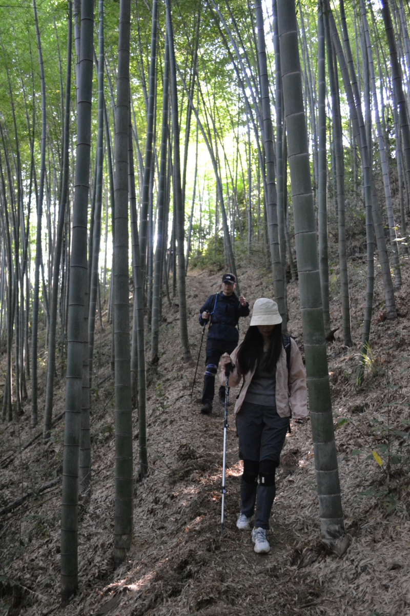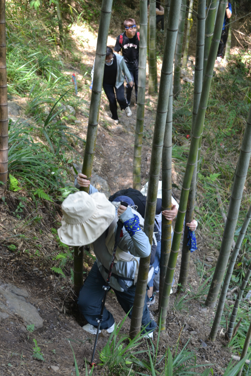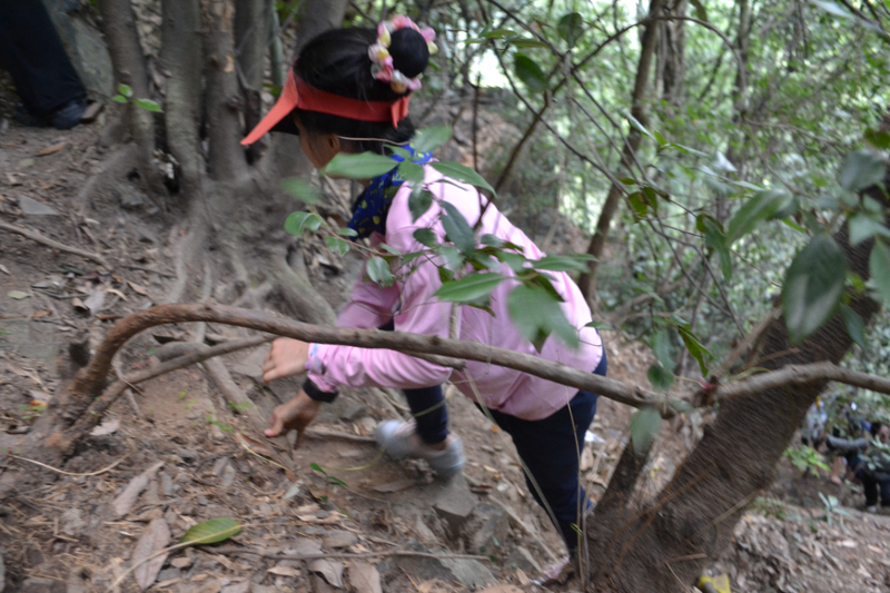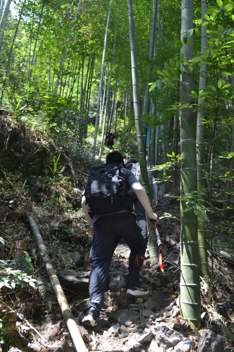 在这里路餐休息后,我们继续后面的行程,后面以山路为主,但是这段山路需要手脚并用攀爬,好在沿途有竹林和树,可以手拉着前进,走过最难的一段山路,继续爬一段山路,穿梭在树林中,到开阔的地方远望山中风景。