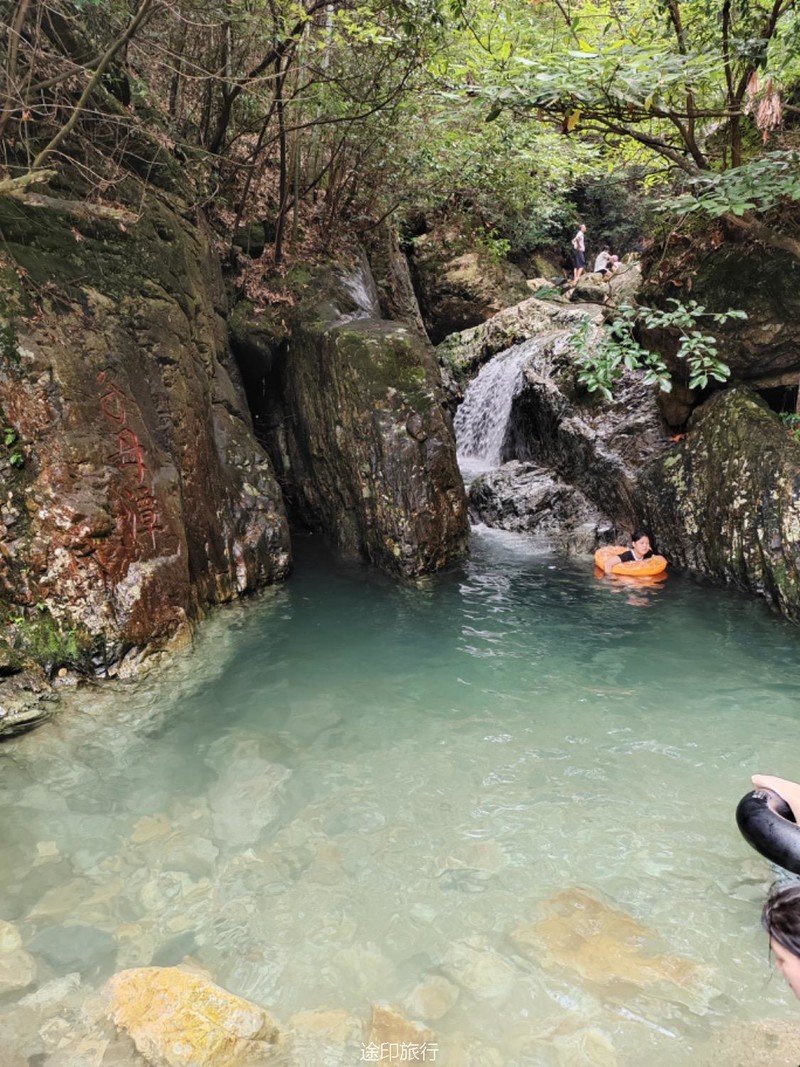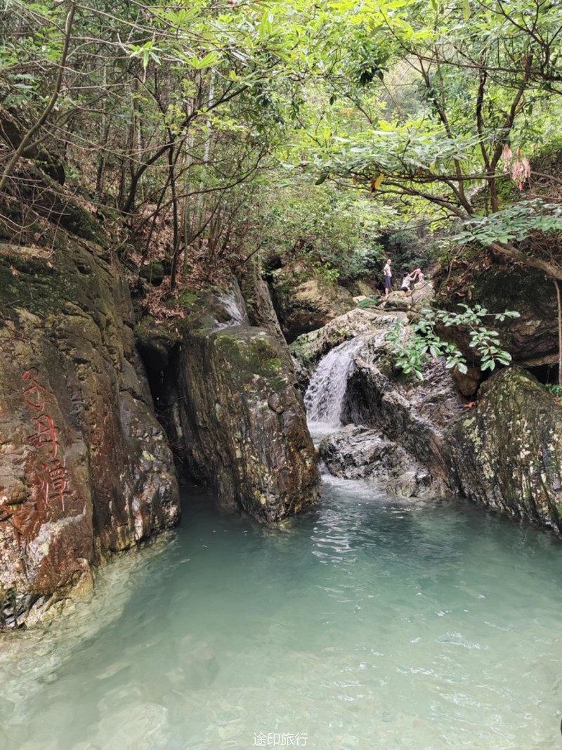 八月二十日,虽已入秋,但秋老虎却不容小觑。所以当然去玩水避暑。雪花潭位于浙江绍兴,四明山腹地, 沿途都是清澈见底的水潭,如问石谭、字母谭、三叠泉、梦雨谭、雪花潭,如果冻一般清澈见底的水花白如 雪花,古名雪花潭。