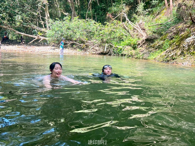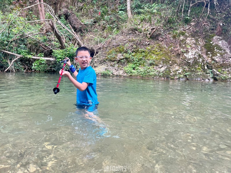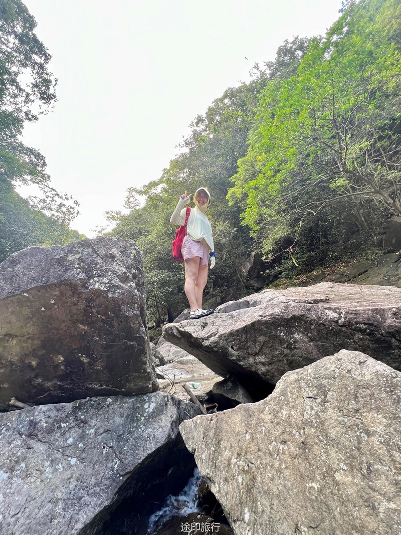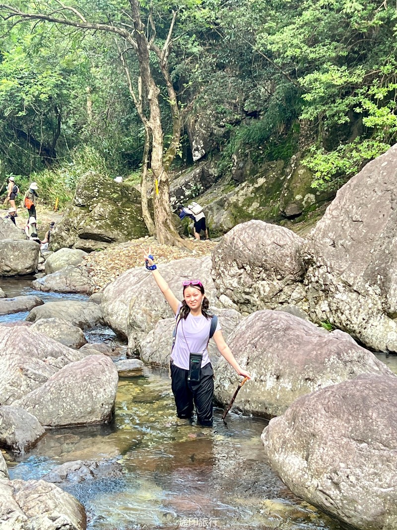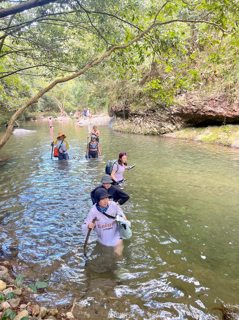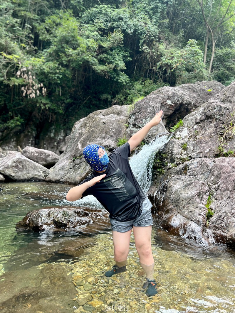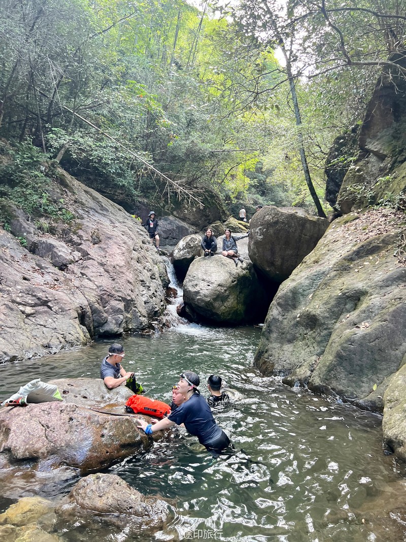 接下来,我们来到了溯溪的起点。河水从山间悄然涌出,清澈而明亮。我们毫不犹豫地跃入水中,享受着别样的乐趣。河水的抚慰和拥抱,让我们远离尘嚣,回归自然。几个大潭在途中等待着我们,宛如天然的水上乐园。我们畅游其中,尽情释放心灵的压力,感受大自然的恩赐。饥肠辘辘的时候,我们在路边的小店品尝了地道的路餐。美味的食物满足了我们的味蕾,更加增添了这段旅程的乐趣。我们品味着特色的路餐食品,也品味着这个独特的徒步之旅。吃饱喝足,开始接触深水,水潭越有一米八左右,刚好没过一个成年人头顶,不会游泳的还是慎重去深水区。水性好的伙伴,急不可待的跳入了这条宛如天然水上乐园的溯溪河流。第一眼望去,水清见底,波光粼粼,宛如一条翠绿的玉带蜿蜒而过。河水中间布满了大石头,有些平坦,有些光滑,有些则凸凹不平。我们小心翼翼地跨过这些石头,时而脚步稳定地站在石面上,时而轻盈地跳过水中的大石头。这一切都让我们感受到了身体与自然的紧密连接。沿途的大潭给了我们一个停留和欣赏的机会。潭水湛蓝,清澈见底,周围绿树环绕,如诗如画。我们纵身一跃,尽情畅游在潭水中,感受着清凉的水流包围身体的每一寸肌肤。笑声在潭水间回荡,快乐与自由在心中盛开。随着我们向前进发,河流逐渐变窄,水流也变得湍急。我们需要更加小心翼翼地穿越这些大石头,以免摔倒或被水冲走。但正是这种刺激和挑战,让我们感受到了溯溪的魅力和乐趣。每一次成功地跨越大石头,我们都能感受到胜利的喜悦和成就感。
